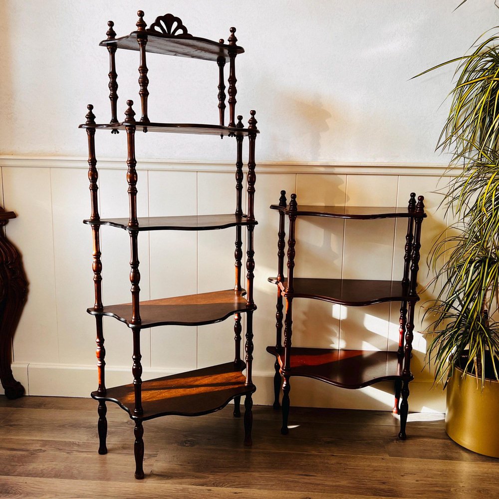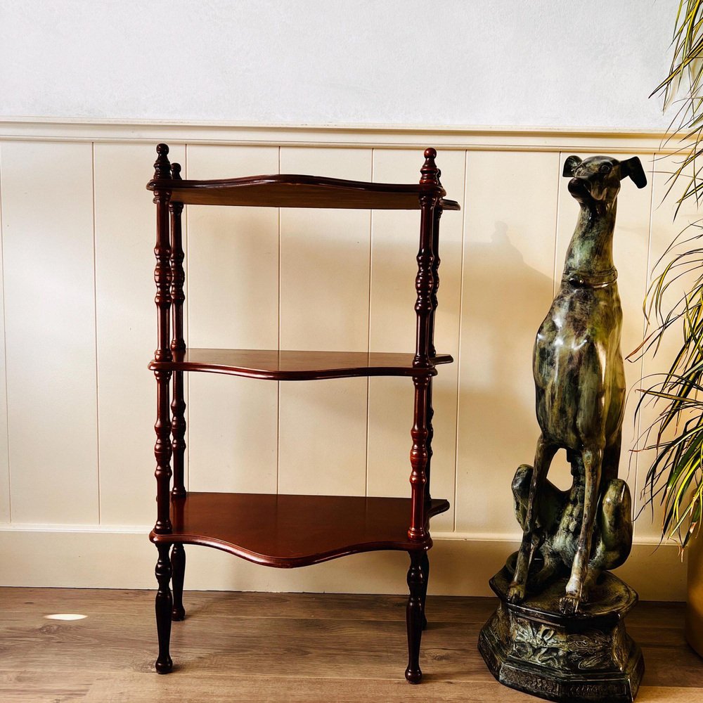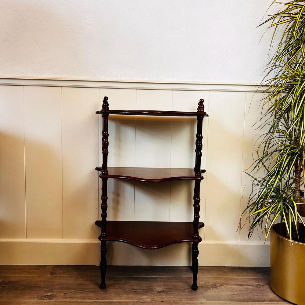 Old etagere, antique column shelf, standing shelf, France, shabby chic brocade decoration, country house, kitchen display, interior design. Wood standing etagere with 3 shelves. This old column shelf, which originated in France, is a standing shelf that is designed to hold a variety of items, from books to decorative objects to kitchenware. The etagere has a shabby chic brocade vibe, that gives it a vintage feel, while also adding a touch of country house charm. Dimensions: Height: 75 cm / 29.5 ” Deep: 30 cm / 11.8 ” Width: 53 cm / 20.8 “. Condition: Good vintage condition, with some normal signs and scuffs, see the photos. All the items in our shop are vintage, mostly used, also may have small manufacturing imperfections.