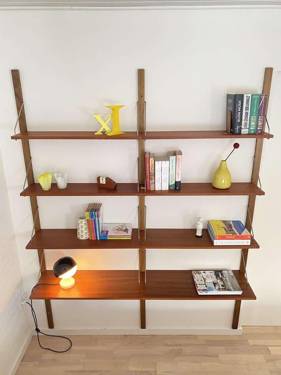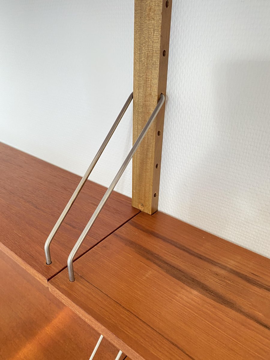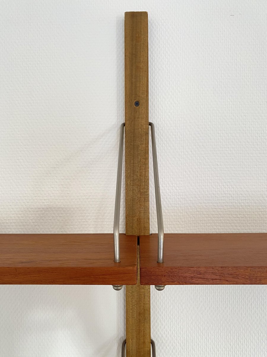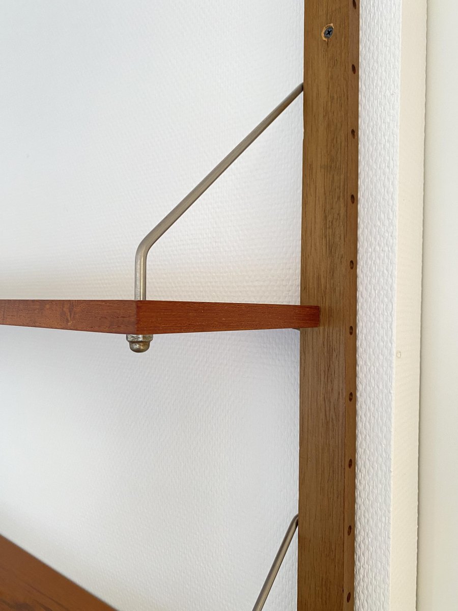 Elegante sistema de estanterías de los años 50/60 con un diseño de mediados de siglo, que recuerda estilísticamente a los conocidos sistemas Cado. Estructura montada en la pared con listones de madera perforados y estantes ajustables de teca de vetas cálidas. Los delicados puntales metálicos proporcionan estabilidad y un aspecto ligero y gráfico. Típico de la época, funcional y versátil, ideal como estantería para libros, estantería de salón o estantería de oficina. Muy buen estado vintage, bien conservado.