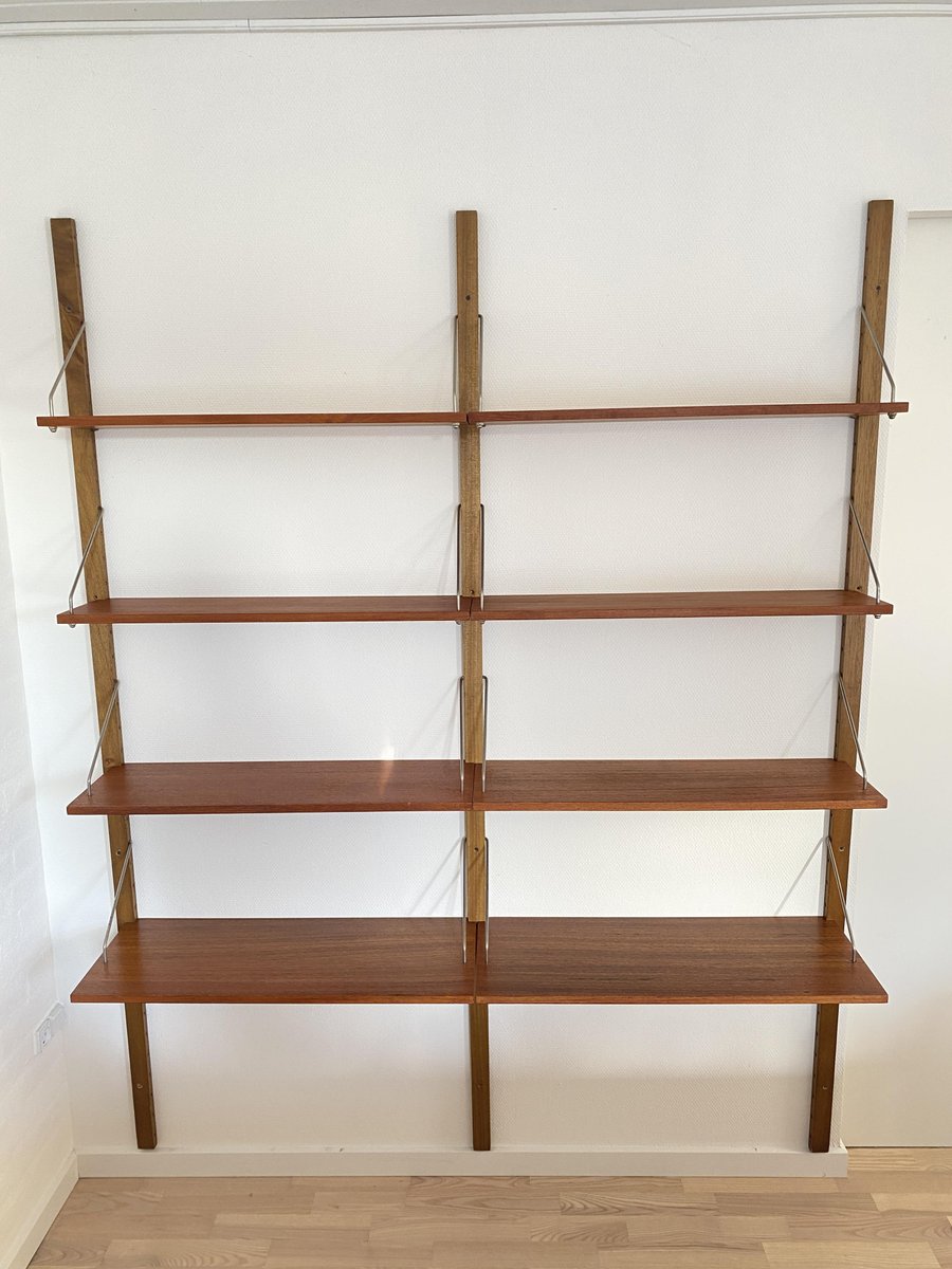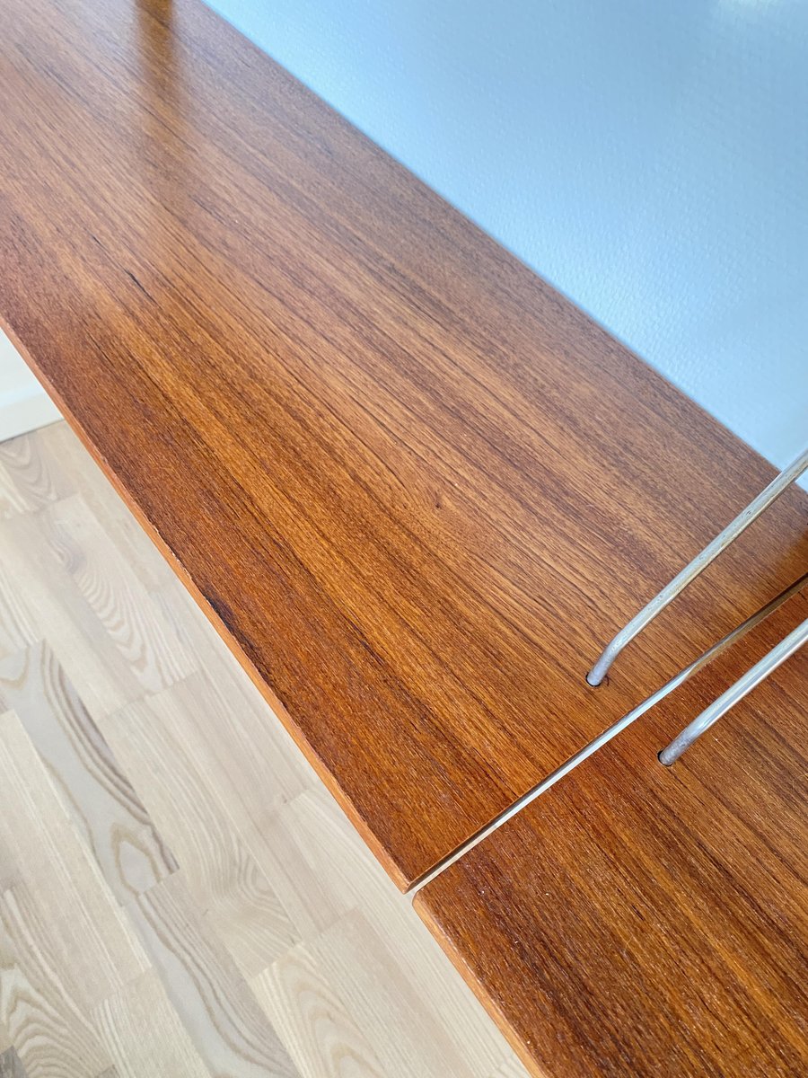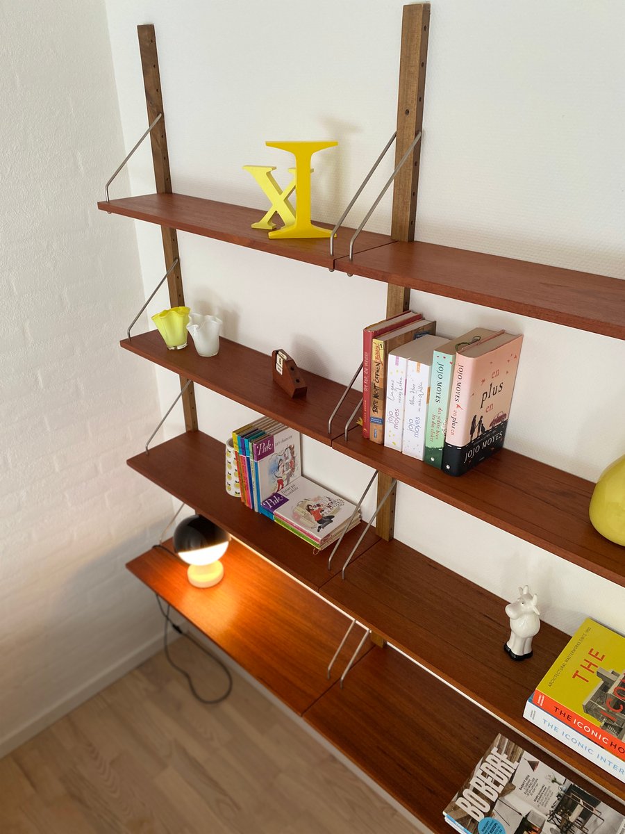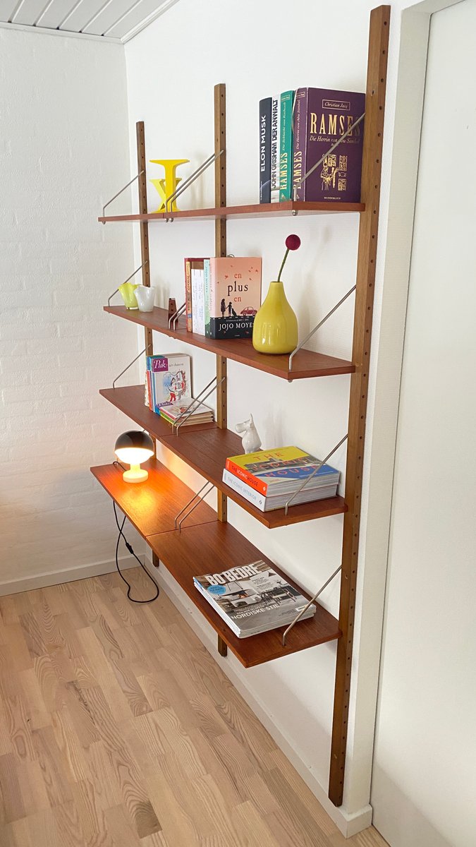 Elegante sistema de estanterías de los años 50/60 con un diseño de mediados de siglo, que recuerda estilísticamente a los conocidos sistemas Cado. Estructura montada en la pared con listones de madera perforados y estantes ajustables de teca de vetas cálidas. Los delicados puntales metálicos proporcionan estabilidad y un aspecto ligero y gráfico. Típico de la época, funcional y versátil, ideal como estantería para libros, estantería de salón o estantería de oficina. Muy buen estado vintage, bien conservado.