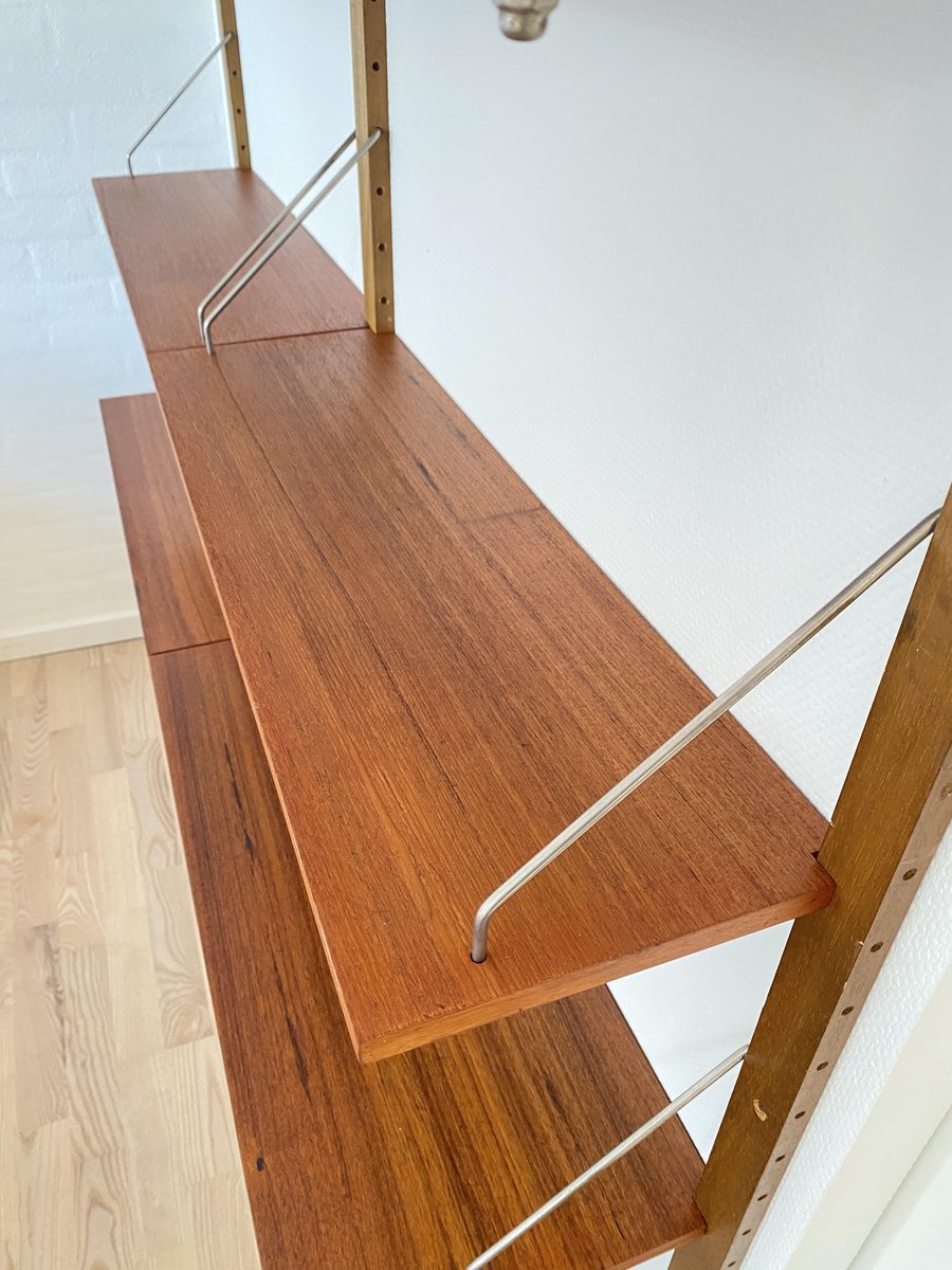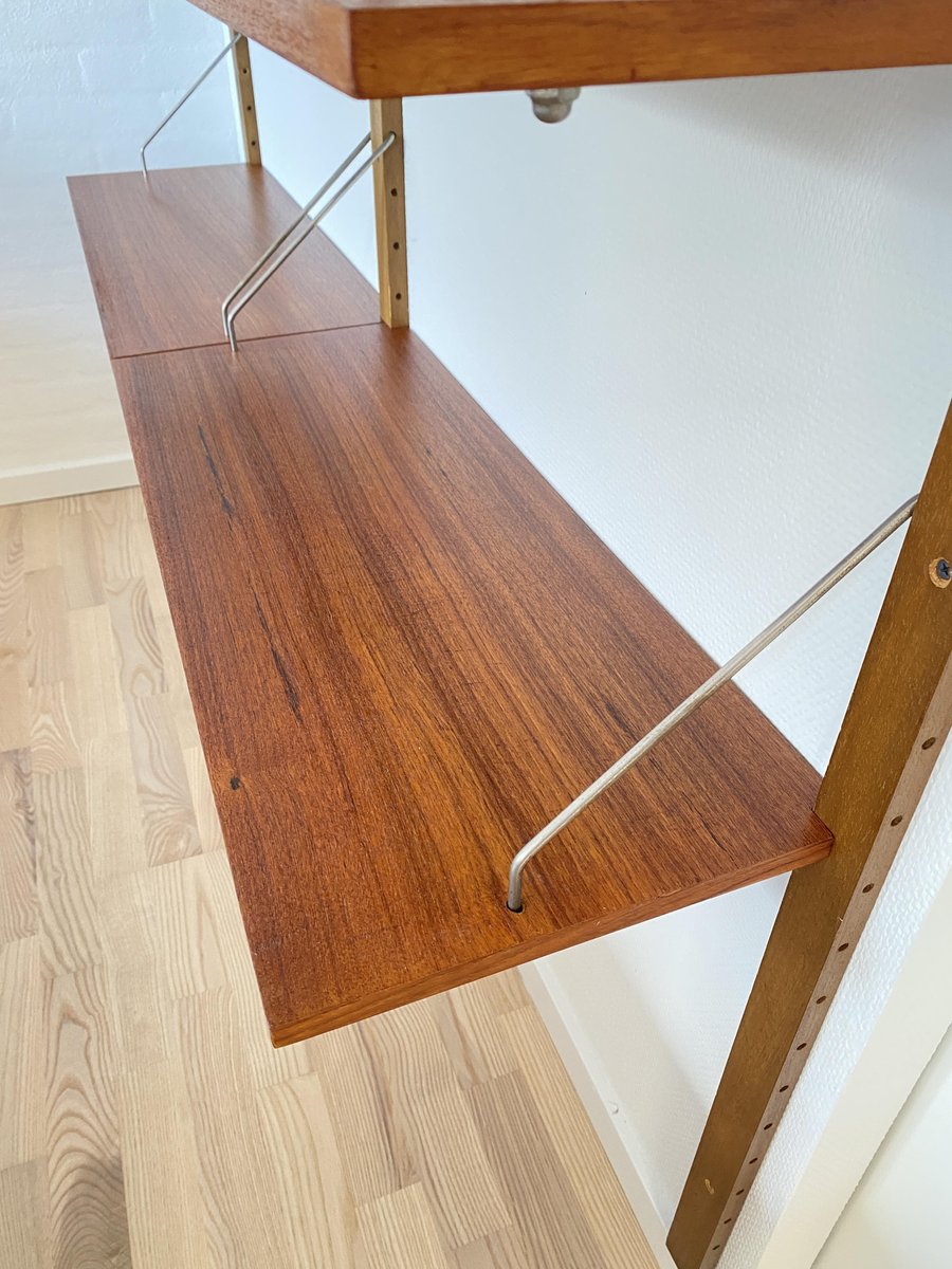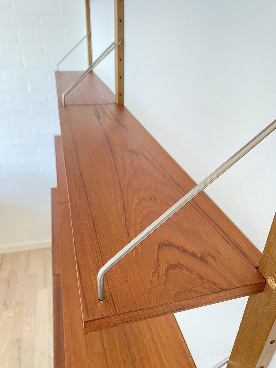 Elegant shelving system from the 1950s/60s in a mid-century design, stylistically reminiscent of the well-known Cado systems. Wall-mounted construction with perforated wooden slats and adjustable shelves made of warm-grained teak. Delicate metal struts provide stability and a light, graphic look. Typical of the period, functional and versatile – ideal as a bookshelf, living room shelf, or office shelf. Very good, well-maintained vintage condition.