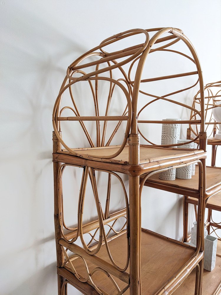 Rattan bookcase or étagère from 1960s France. with its round shapes and beautiful, handmade details, this arch-shaped etagère, which can also be used as a room divider, is truly unique in its kind. The design, with two higher, curved parts on the left and right and a slightly lower, straight part in the middle, is what you could call a textbook example of elegance through simplicity, while the style is very reminiscent of California Coastal or French Rivièra.