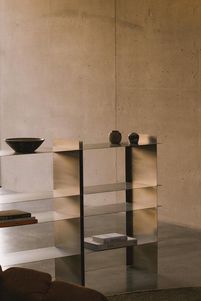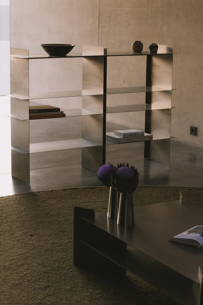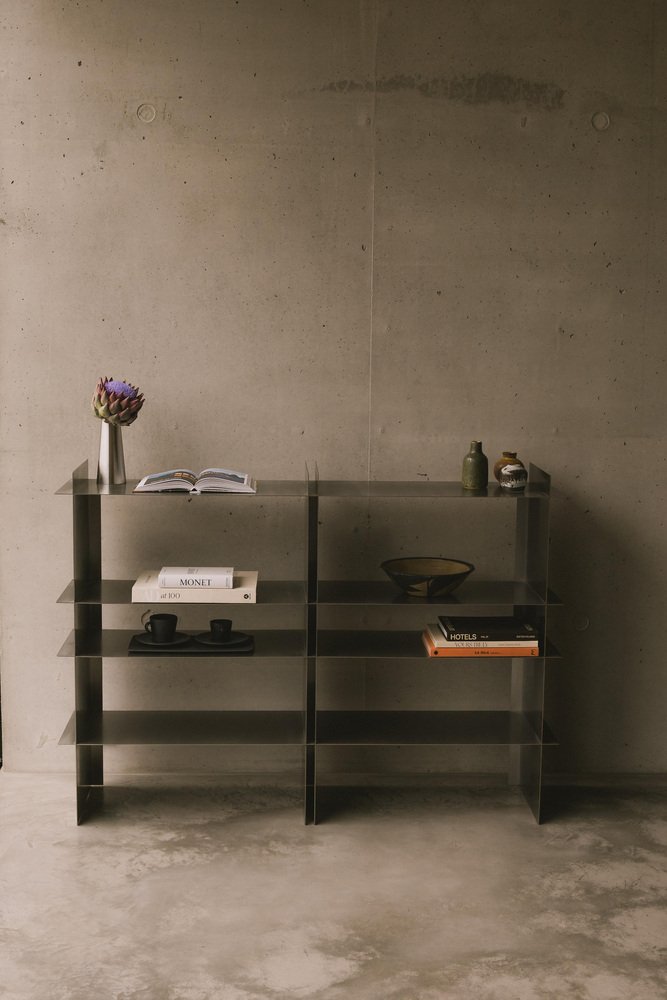 Estantería Taisho de acero inoxidable de Zincutec Dimensiones: 140 cm de ancho x 32 cm de profundidad x 100 cm de alto Materiales: acero inoxidable Esta estantería, fabricada en acero inoxidable cepillado, combina un diseño minimalista con una funcionalidad refinada. Las líneas limpias y las formas planas crean una estética moderna que equilibra la resistencia y la simplicidad. Los niveles abiertos permiten un uso flexible: como estantería, expositor de objetos decorativos o práctica solución de almacenamiento. Fabricada a mano con precisión, la pieza impresiona por su construcción robusta, su superficie de fácil cuidado y su sutil capacidad para reflejar la luz. Un diseño que ofrece armonía visual y utilidad cotidiana. ZinCuTec aspira a ser un colectivo de artistas que llevan los metales y sus superficies al límite. Especializados en el trabajo del latón y el cobre, cada uno de sus miembros se esfuerza por encontrar personas afines que compartan la misma pasión. Nos esforzamos por infundir este sentimiento especial en nuestro oficio. Como comunidad, todo es posible. Animamos a nuestros miembros a crecer tanto personal como profesionalmente y a ampliar nuestras habilidades colectivas. En ZinCuTec, nos comprometemos a crear una cultura en la que todos puedan prosperar. ZinCuTec refina superficies metálicas para arquitectura, diseño de interiores y construcción de objetos de alta calidad. Nos centramos en procesos químicos especializados, como la patinación, el ennegrecimiento (o ennegrecimiento) y la oxidación, que se utilizan para alterar deliberadamente el color, la textura y el tacto de metales como el latón, el cobre o el bronce. Los procesos de reacción controlados crean superficies duraderas y con carácter que varían en color y estructura, desde matices sutiles hasta pátinas expresivas. Cada pieza se fabrica siguiendo los más altos estándares de calidad de los materiales, precisión dimensional y estética de la superficie. Ya se trate de una pátina única, una estructura metálica hecha a medida o un acabado pulido fino, ZinCuTec combina la artesanía, la precisión técnica y el conocimiento del diseño para crear superficies metálicas que son duraderas tanto visual como funcionalmente.