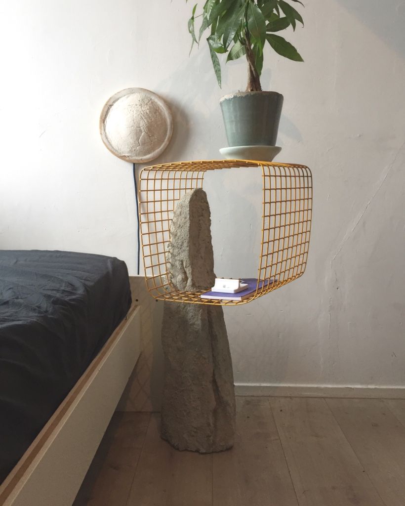 El hormigón armado es una técnica en la que el hormigón se vierte alrededor de una rejilla metálica. Esta unión dio al ser humano la posibilidad de trabajar a una escala impresionantemente grande. Cambió el mundo de la arquitectura y con ello nuestro entorno. Un elemento de este material está siempre oculto: Hasta ahora, la armadura de acero estaba oculta en el interior con un solo propósito: dar fuerza al hormigón. Después de experimentar, Willem van Hooff encontró la manera de dar la vuelta a estos papeles y sacar la rejilla metálica a la superficie, dándole una estética complementaria, y una función completamente nueva. Los materiales urbanos en bruto se trasladan ahora a nuestros hogares. En conjunto, las piezas de mobiliario de Elementos de Construcción representan un paisaje urbano, donde comenzó la inspiración de Van Hooff para este proyecto. Devolviendo los materiales a su lugar habitual.
