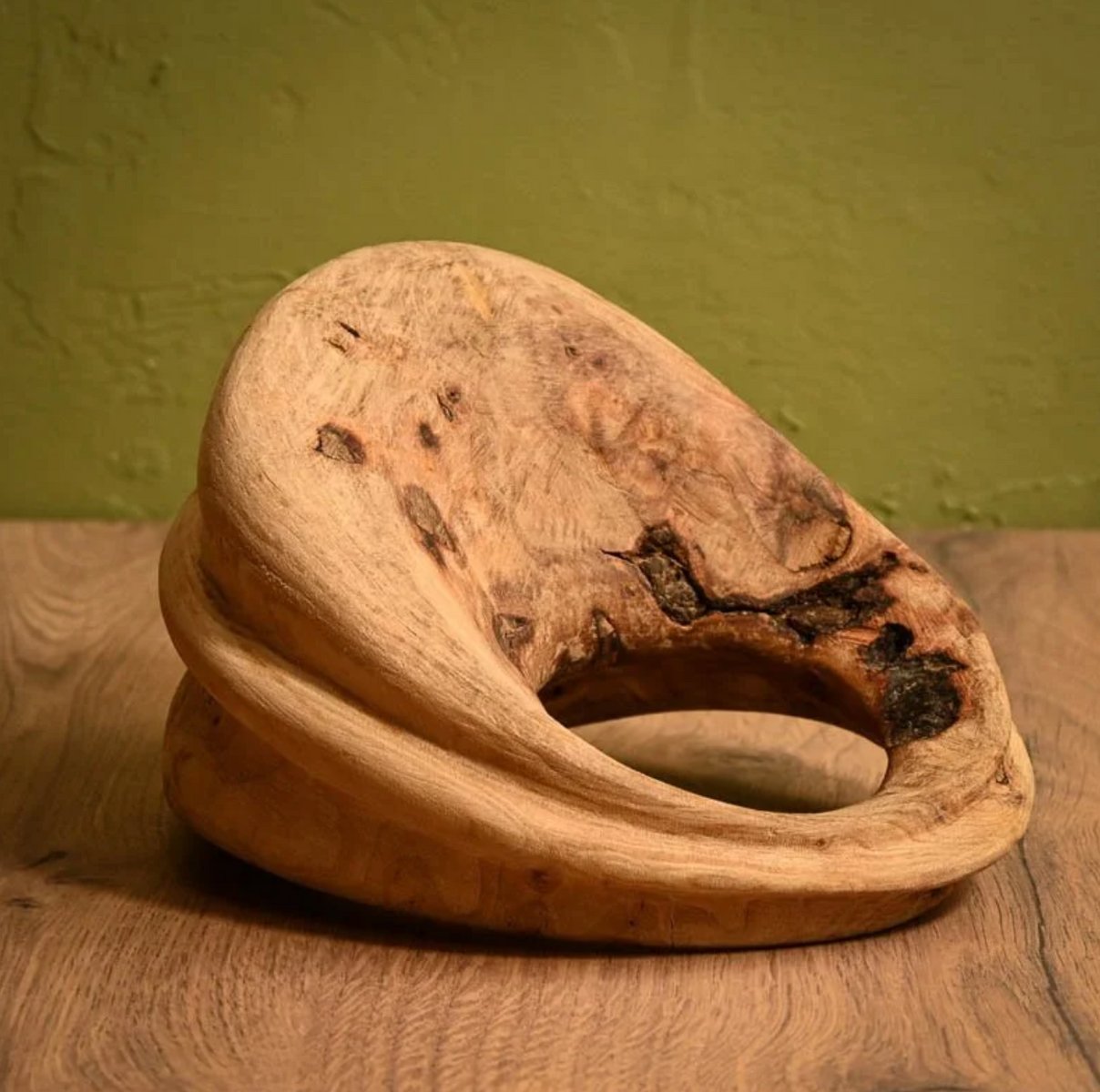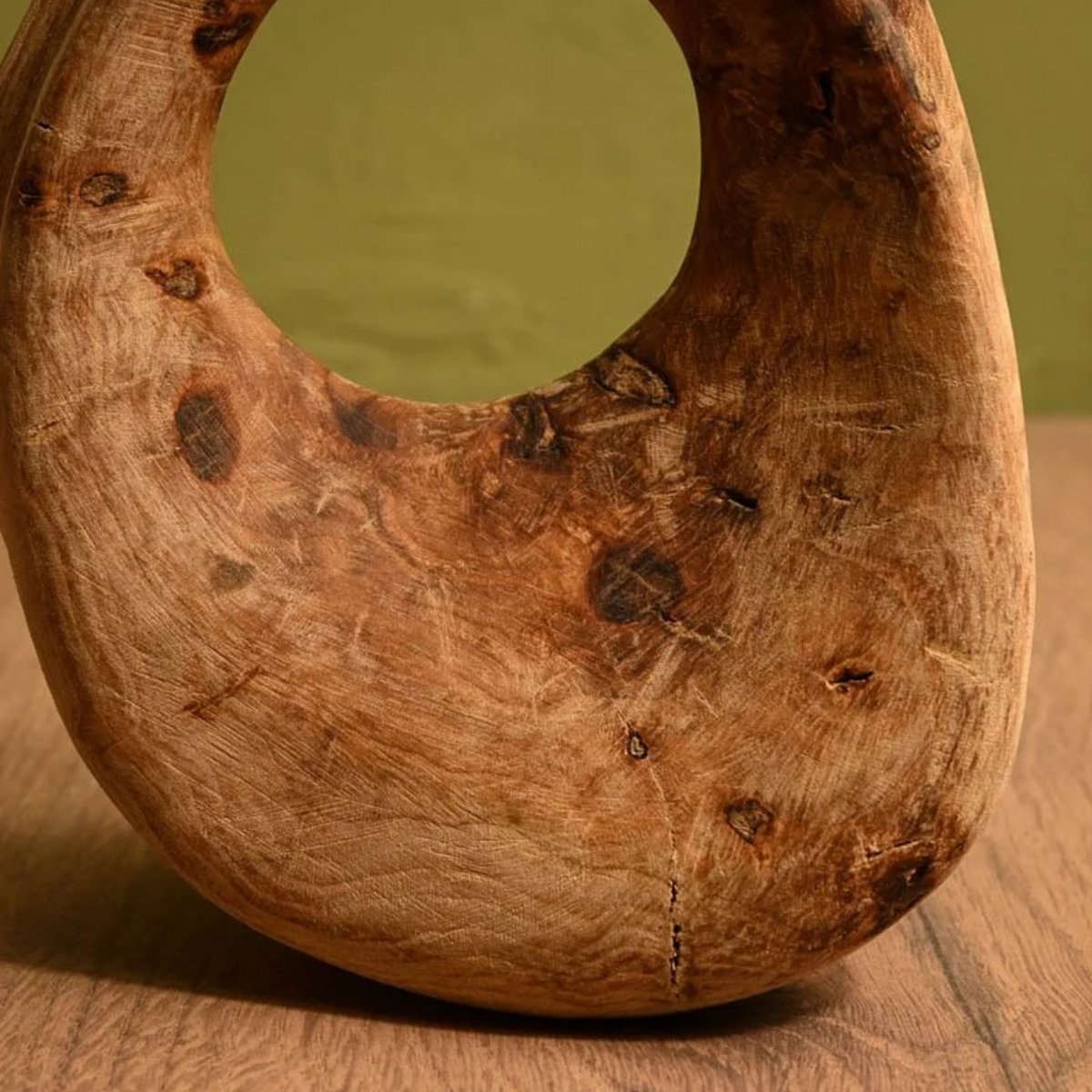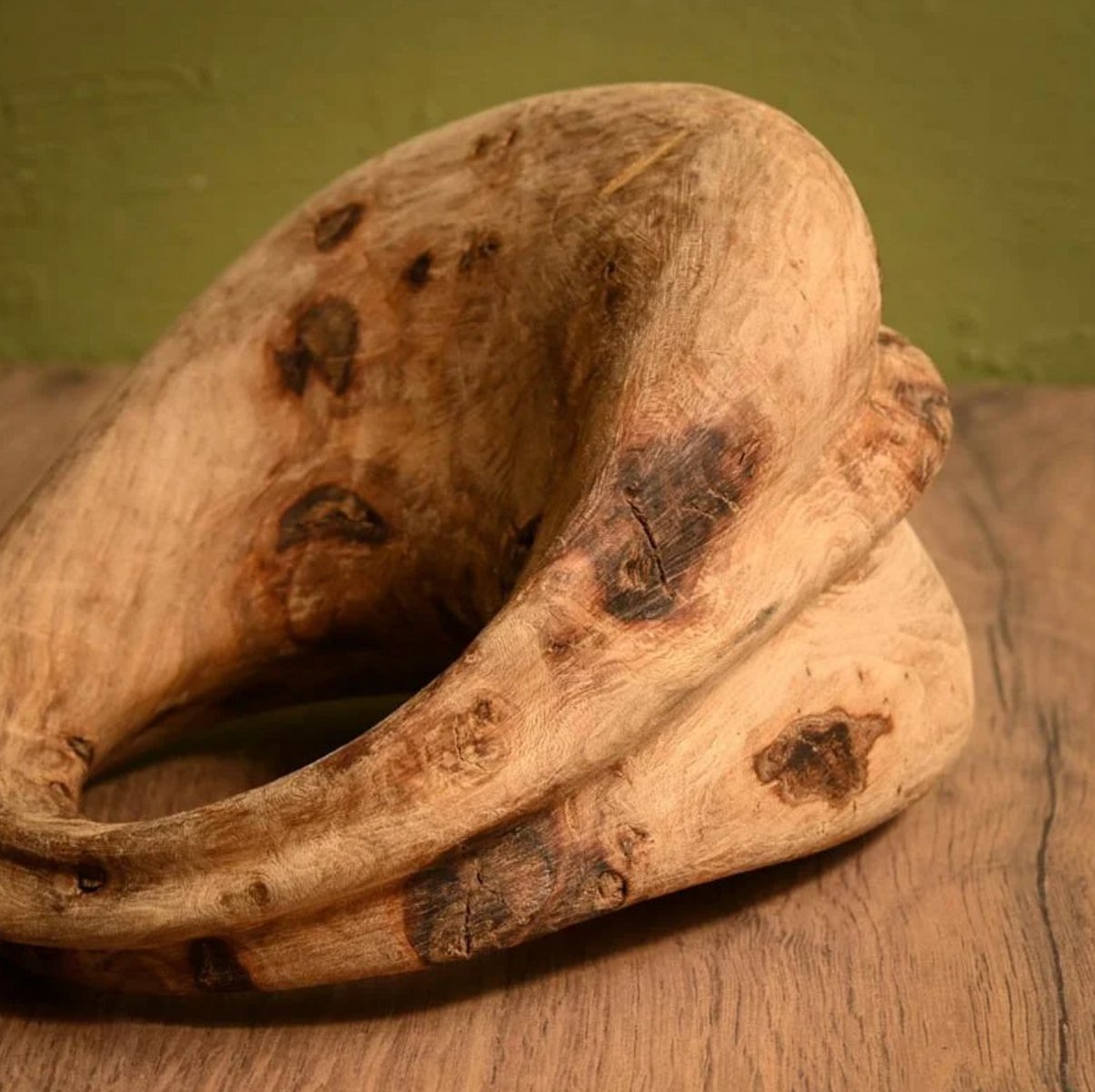 Esta hermosa escultura abstracta ha sido realizada por el zapatero y escultor Fabi en Navarra, España. El artista tiene una habiliad de poder encontrar formas dentro de piezas antiguas de Olivos de la zona, resaltando sus texturas, formas naturales y color que logra recuperar de forma exquisita en objetos escultóricos y también utilitarios, como cuencos, ceniceros, fruteros, vacia bolsillos, etc.