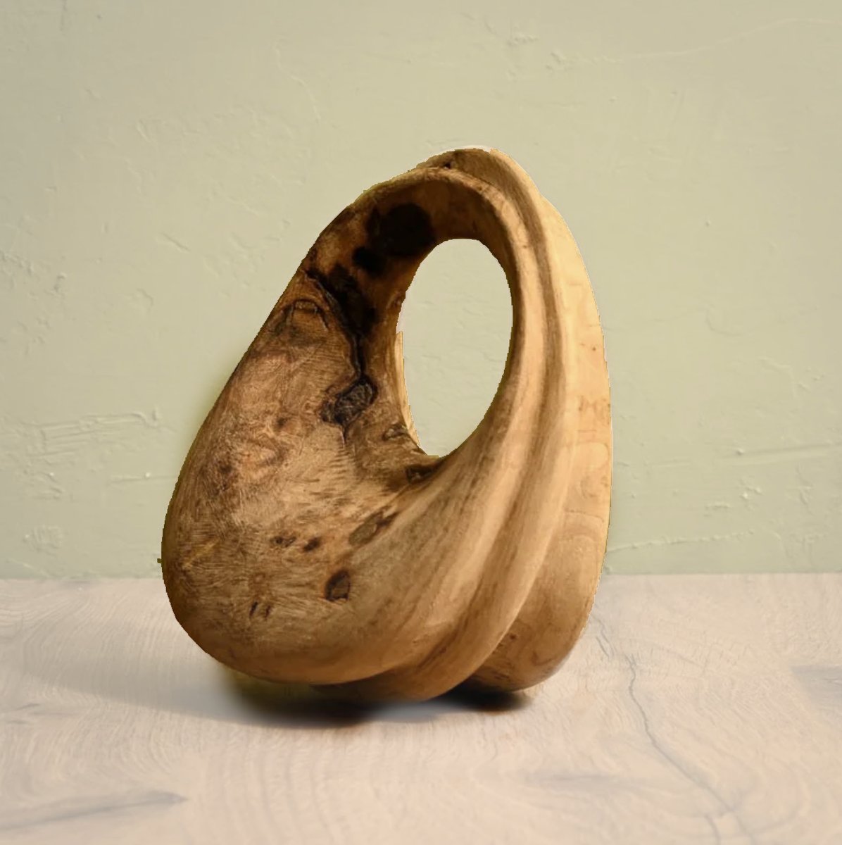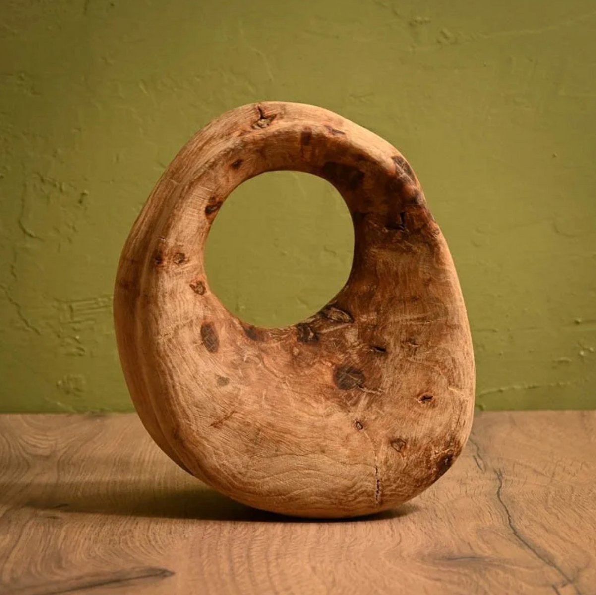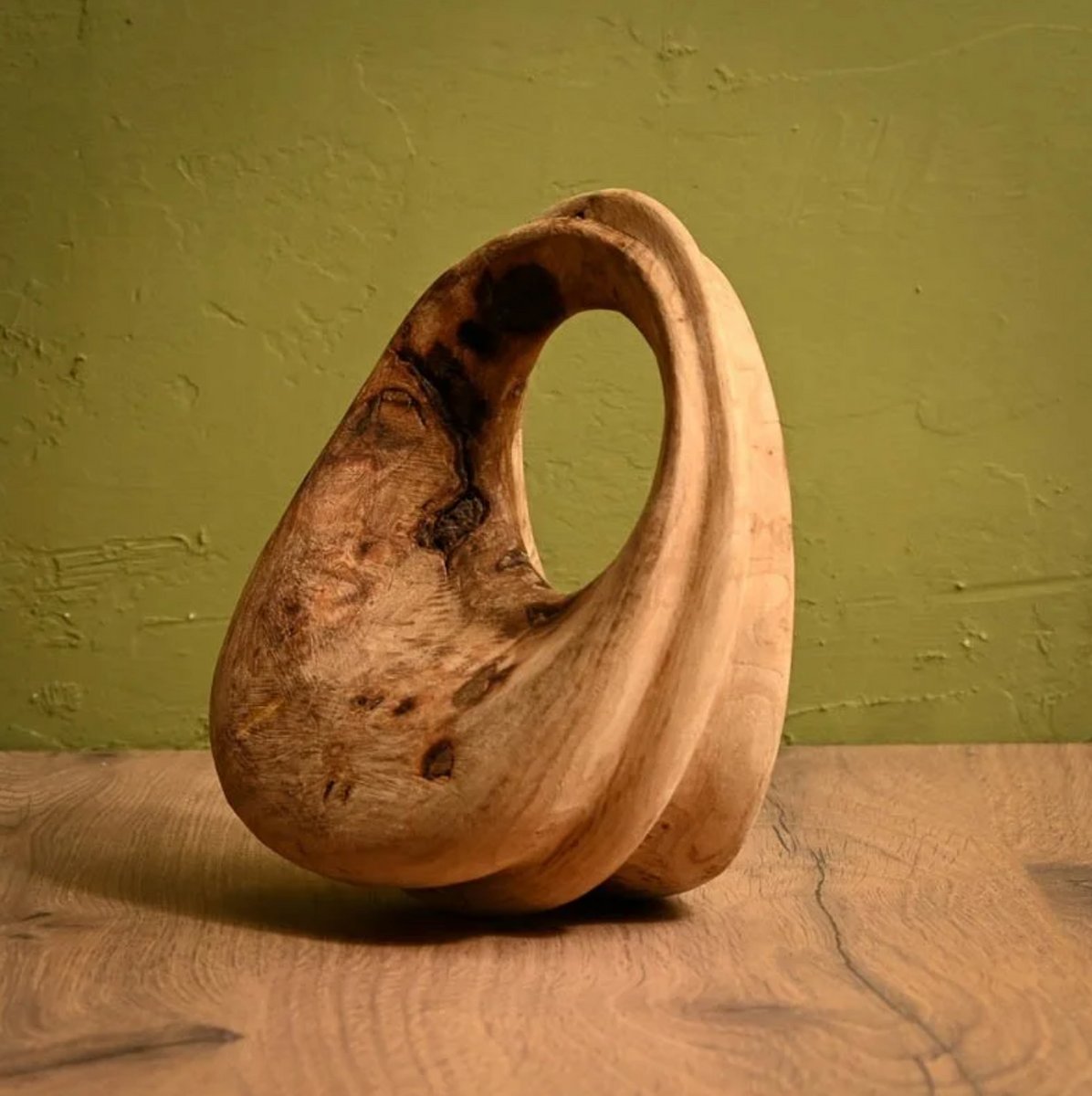 Esta hermosa escultura abstracta ha sido realizada por el zapatero y escultor Fabi en Navarra, España. El artista tiene una habiliad de poder encontrar formas dentro de piezas antiguas de Olivos de la zona, resaltando sus texturas, formas naturales y color que logra recuperar de forma exquisita en objetos escultóricos y también utilitarios, como cuencos, ceniceros, fruteros, vacia bolsillos, etc.