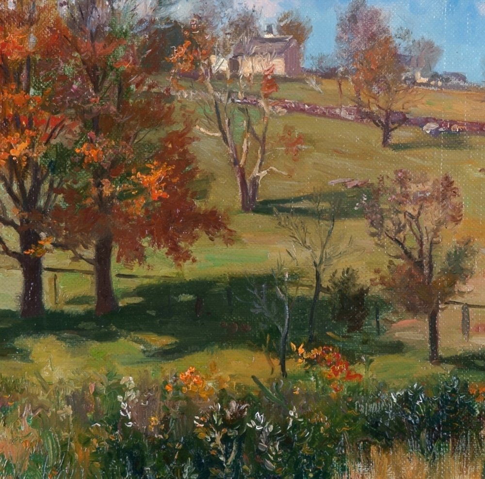 Para dar al paisaje el mayor espacio posible, se eleva la línea del horizonte, pero el diseño del cielo también es crucial. Las nubes, combinadas con las formas de los árboles, crean un cielo azul brillante. Para el ojo europeo, un cielo así recuerda a un paisaje estival. Por consiguiente, dentro del ciclo estacional, el cielo azul está reservado al verano, y el Impresionismo francés es también principalmente una oda al verano. En el cuadro de Vezin, sin embargo, el brillante cielo azul se alza sobre un paisaje otoñal, algunos de cuyos árboles están incluso defoliados. Por tanto, cabe suponer que el cuadro no se pintó en Europa, sino en Estados Unidos, y que ilustra el proverbial verano indio, lo que convierte a Frederick Vezin en un pionero del paisajismo estadounidense.