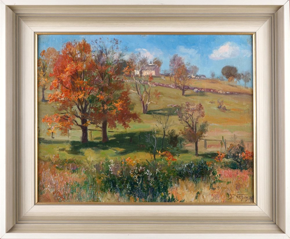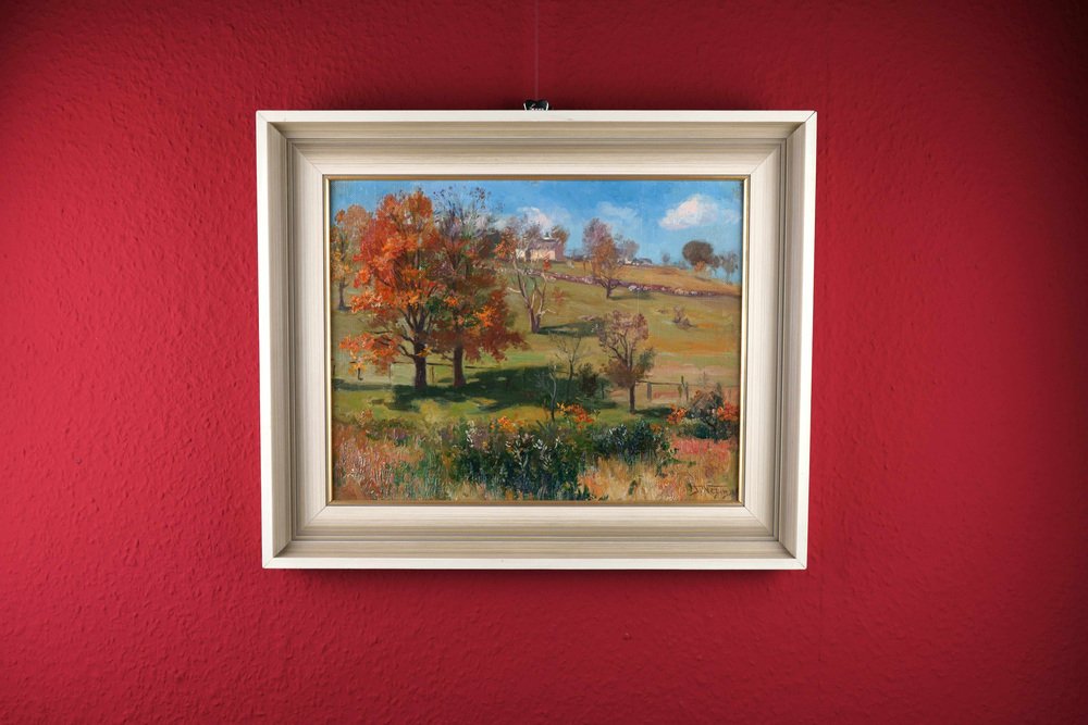 Frederick Vezin (1859 Torresdale Filadelfia - 1933 Düsseldorf), Paisaje otoñal a la luz del sol, óleo sobre lienzo, montado sobre cartón, 32 x 41 cm (medida interior), 44 x 51 cm (bastidor), firmado y fechado abajo a la derecha "F. Vezin. [19]05".