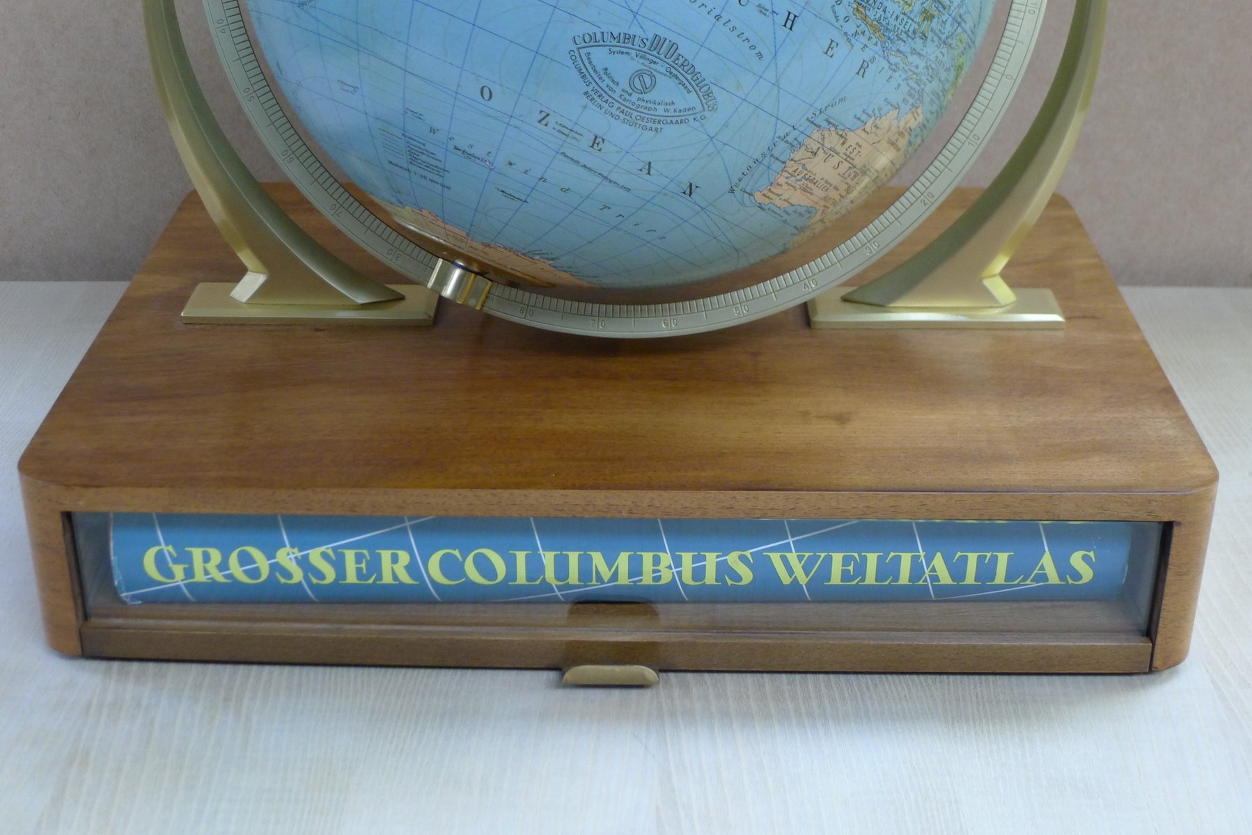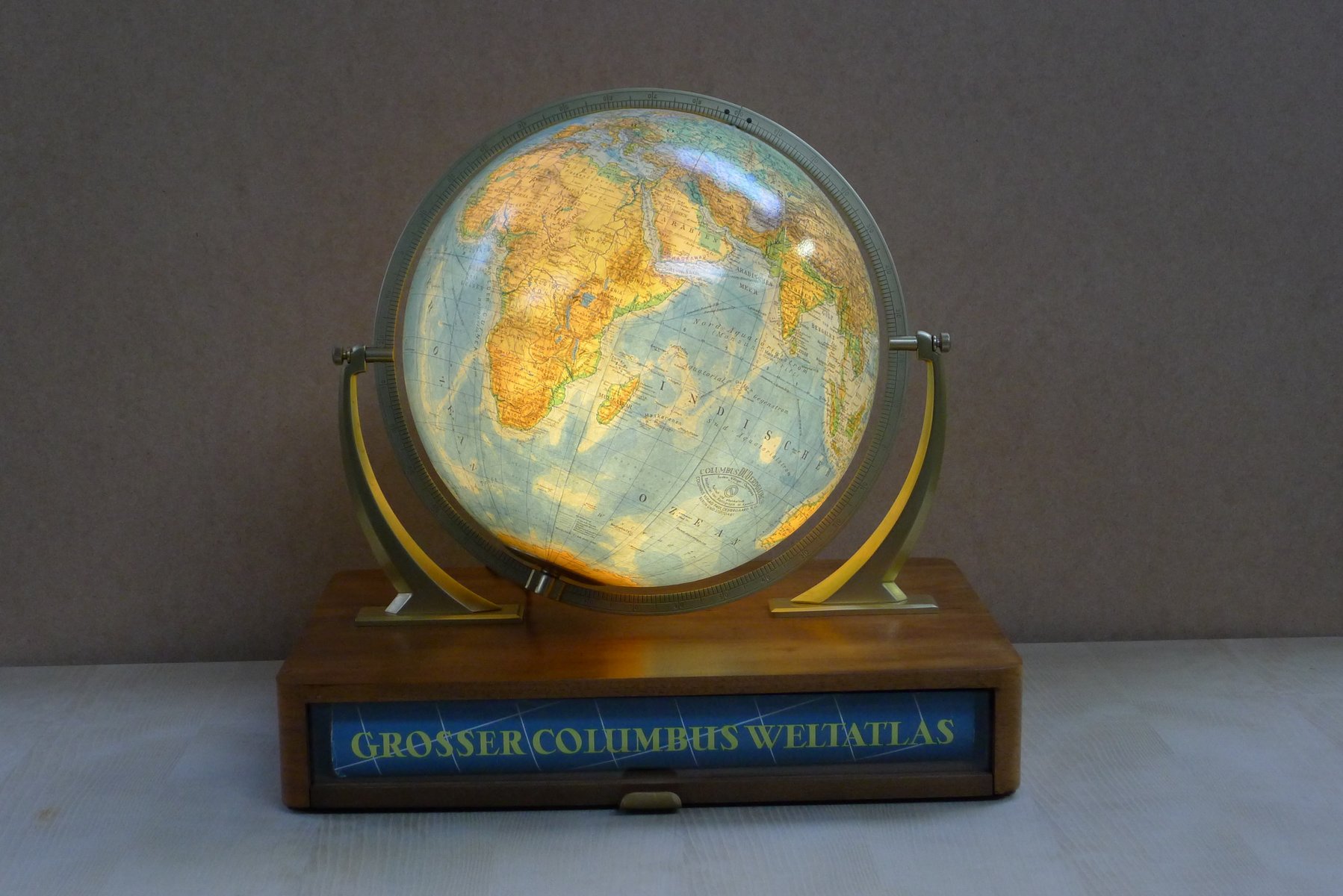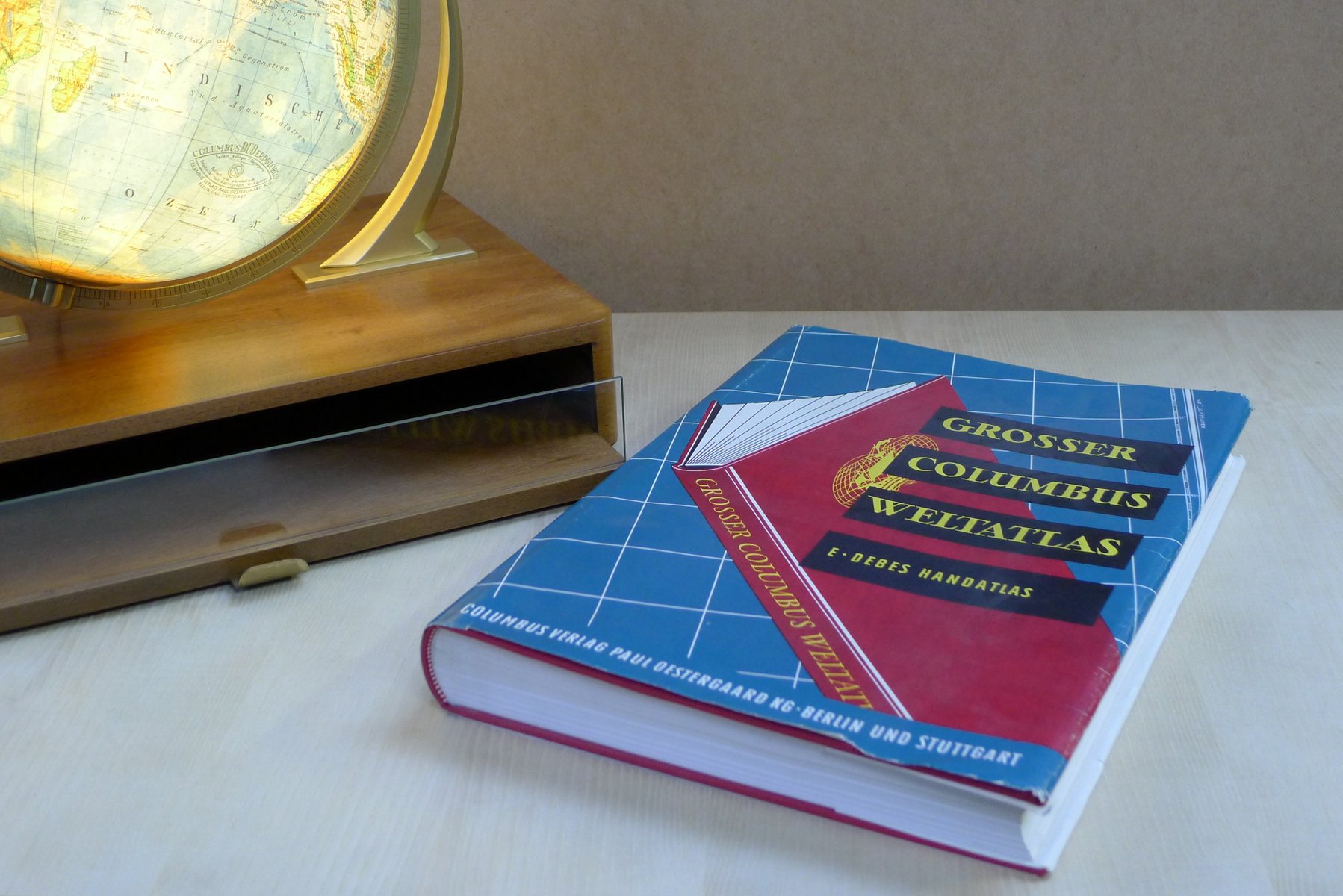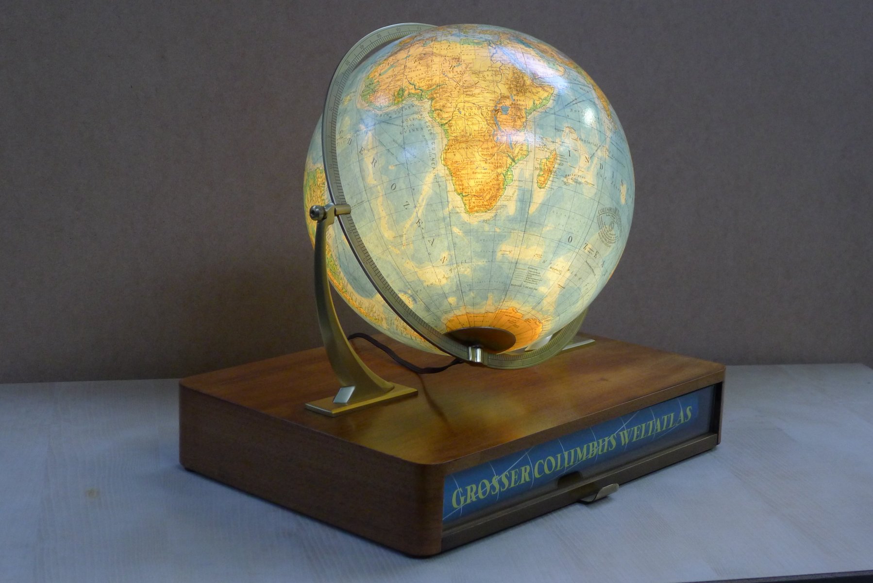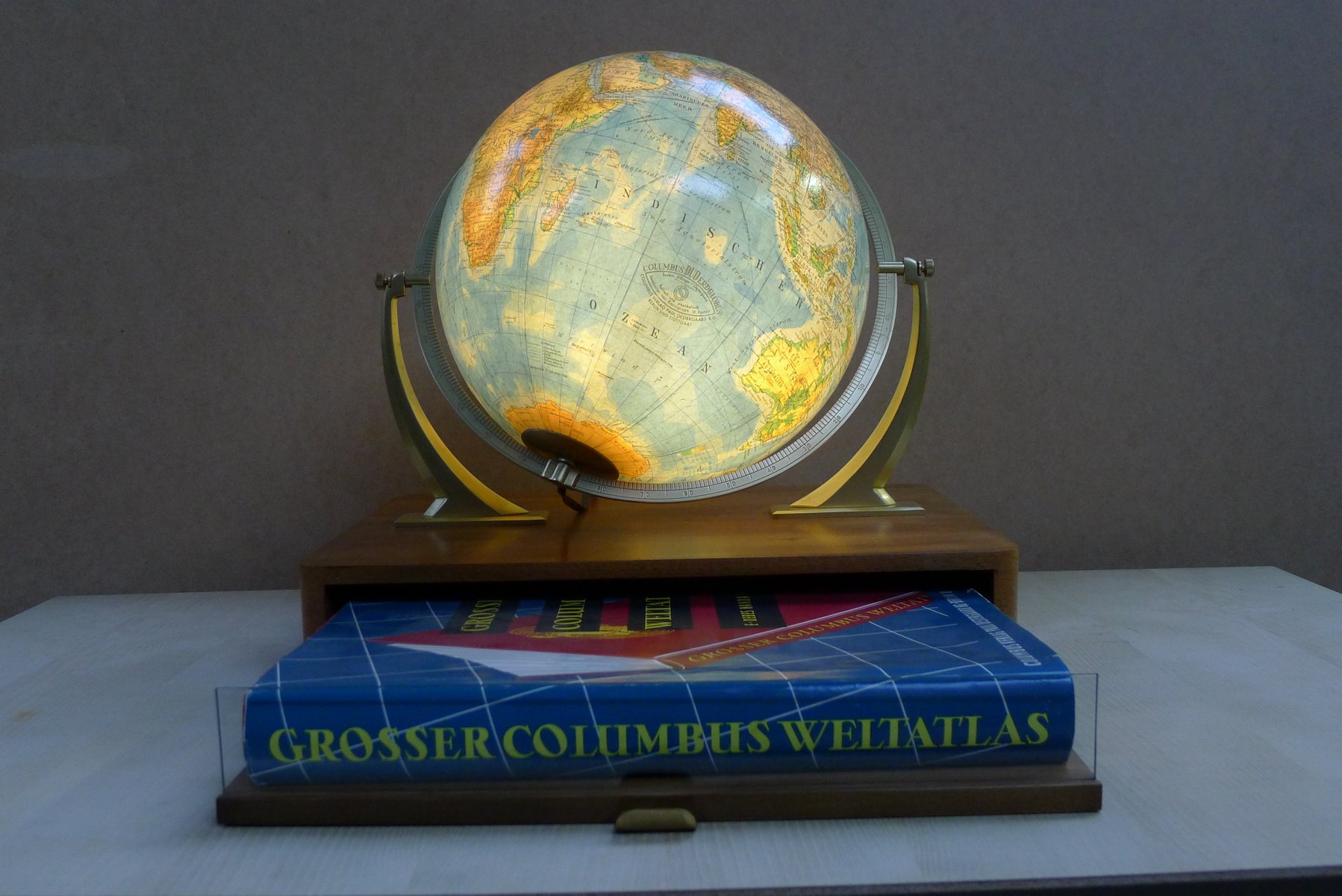 Globo terráqueo iluminado con suspensión Semi-Gimbal y cajón atlas grande de Columbus Oestergaard, años 60