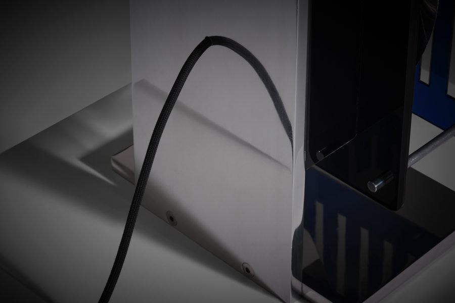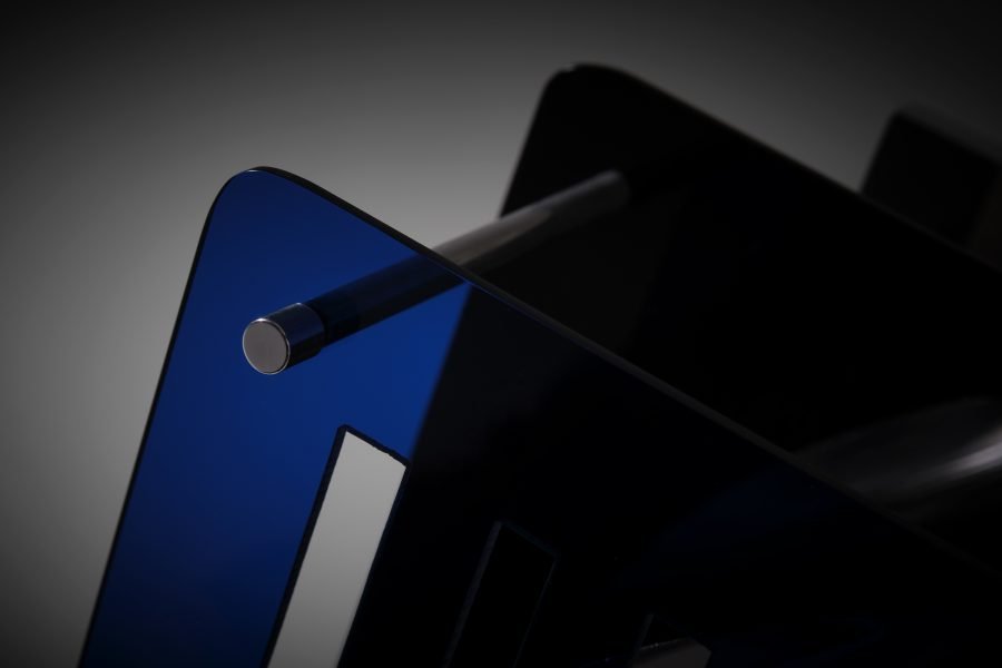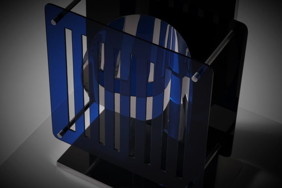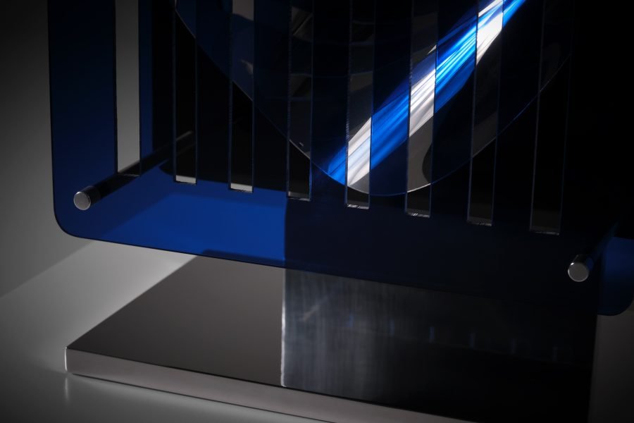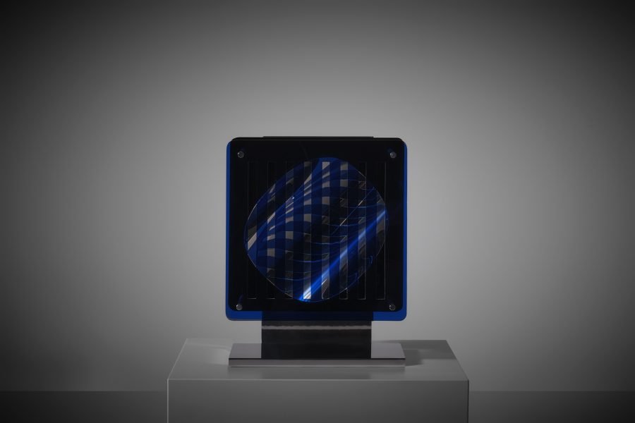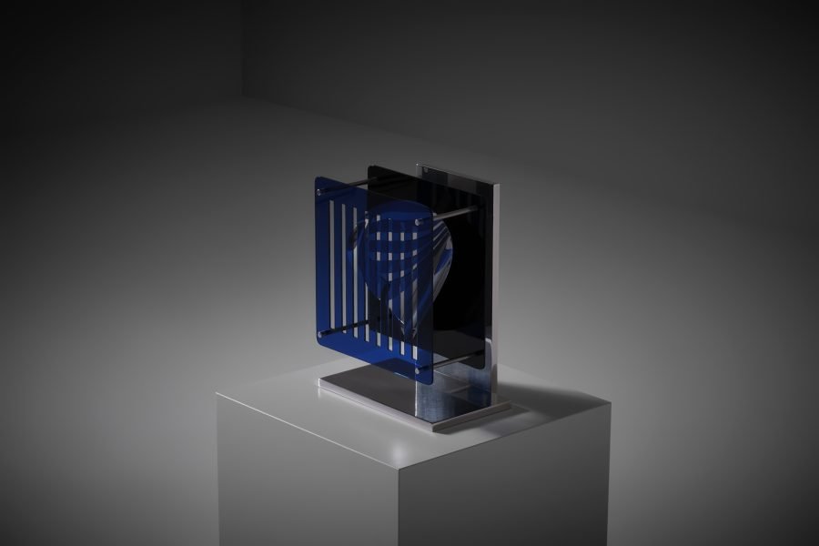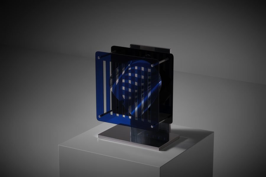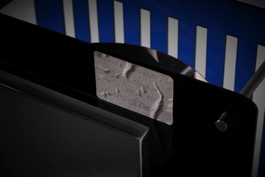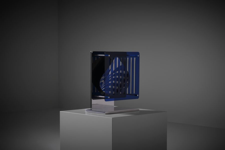Kinetic artwork "Refelection" by Hugo Demarco (1932–1995), France 1975. The work is made out of blue acrylic glass, a black shiny acrylic frame at the back and a motorized polished stainless steel curved disk in the center causing an intriguing kinetic play. DeMarco finished his degree at the Escuela Nacional de Bellas Artes in Buenos Aires in 1957. Not long after, in 1959, he moved to Paris with Julio Le Parc and Horacio García Rossi, his former classmates, to join the French art scene. He was among the early members of the Groupe de Recherche d'Art Visuel (GRAV), a group of visual artists including Julio Le Parc, Jesús-Rafael Soto, Horacio Garcia Rossi, Sérgio de Camargo, and François Morellet and Carlos Cruz-Diez. Demarco focused essentially on color and movement, optical art paintings on canvas and motorized art objects through which the viewer's perceptions are deceived. Numerous personal exhibitions were given to him throughout the world, between 1961 and 1989. His works are in the collection of important museums worldwide. This particular work is created in 1975 and was ment to be made in a number of 75, this is number 22 anyhow it's unknown how many where actually made. The solid polished aluminium base is an addition to beautifully present the work, it can also stand without or be hung on a wall. Signed, numbered and dated at the back. In excellent original condition.
