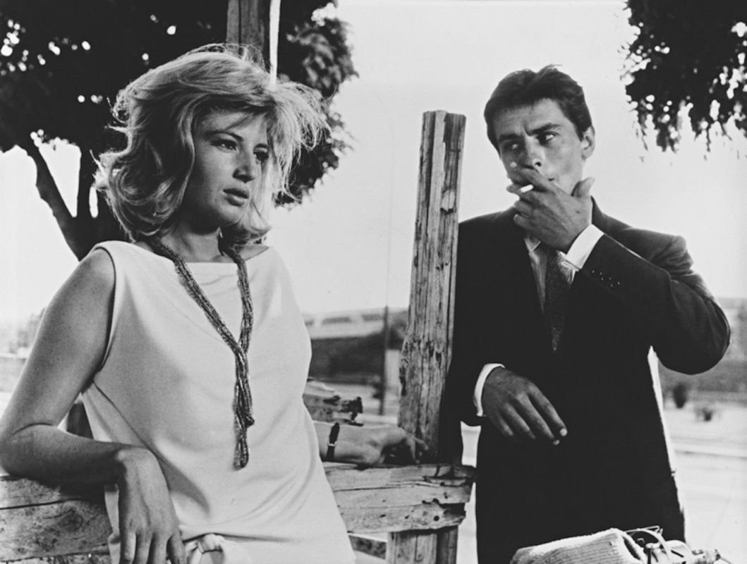 Impresión pigmentada de Alain Delon y Monica Vitti enmarcada en blanco
