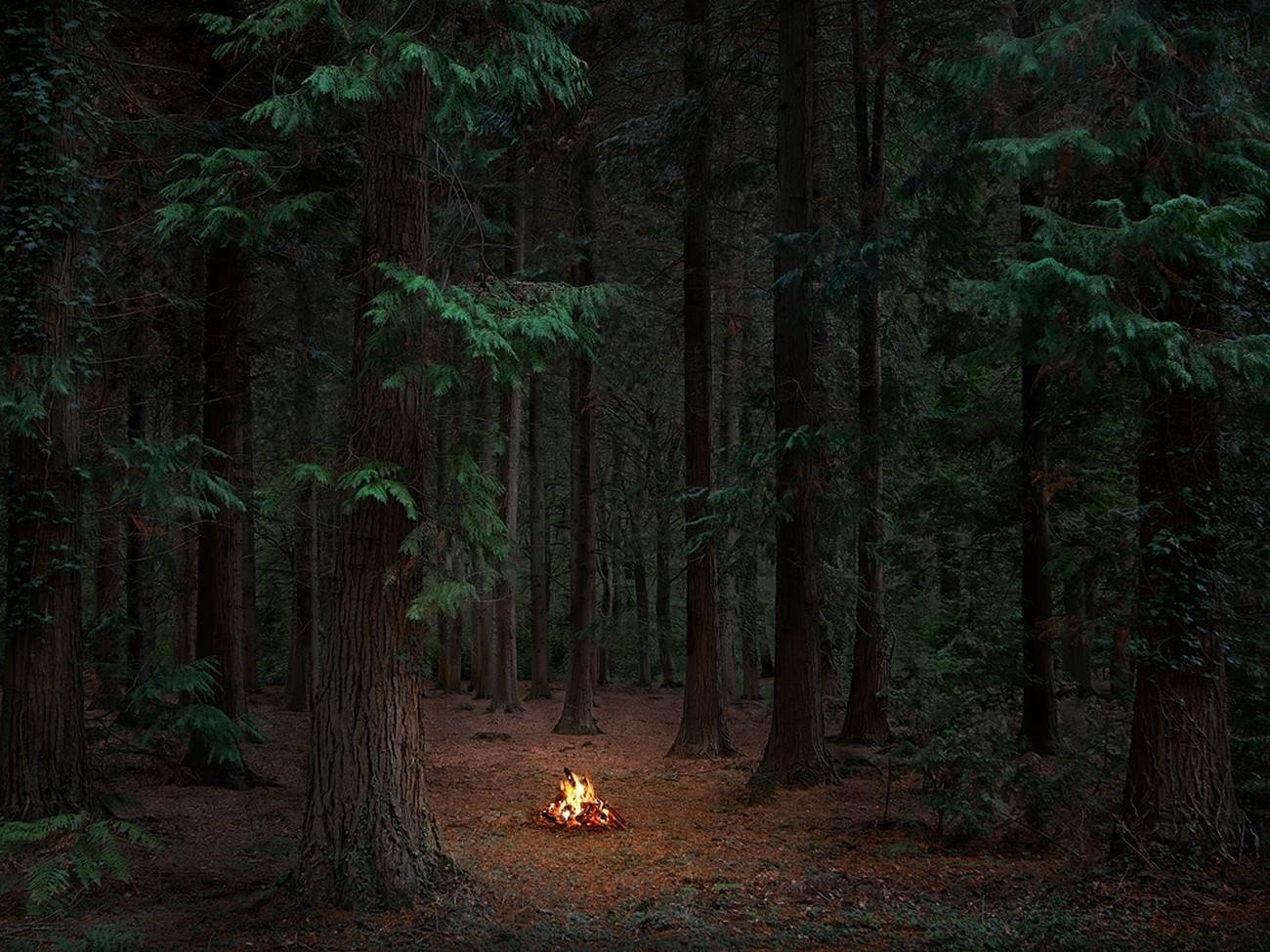 Placing these small fires in the midst of these forest clearings, Davies casts the forest in a warm light, holding back the dark and mysterious forces. The gentle orange hues imbue the scene with a sense of safety and comfort, which alters the very nature of the forest itself.