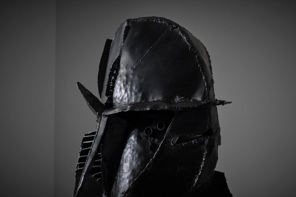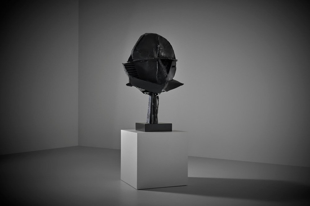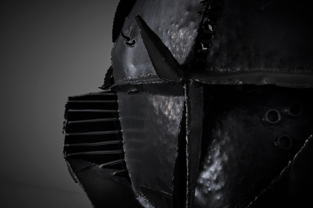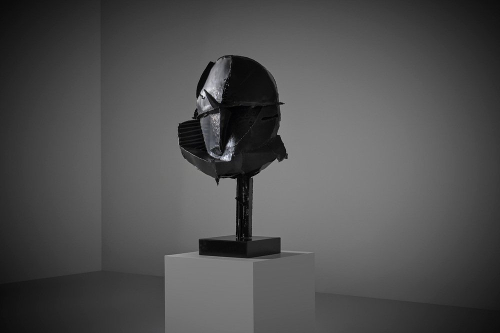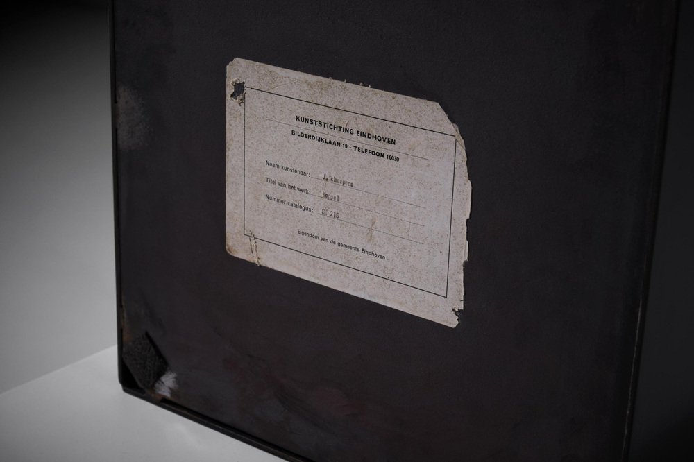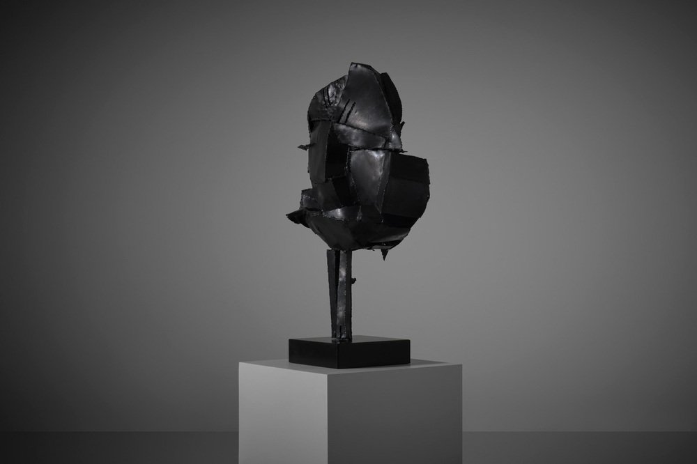 Escultura abstracta en metal de Jacques Scheepens, Países Bajos, década de 1960. Scheepens estudió en la Real Academia de Arte de Den Bosch de 1948 a 1951, practicó la escultura, la pintura, el dibujo y el objeto. La escultura se compone de varias chapas y varillas de metal forzadas y martilladas, soldadas entre sí para darles esta forma speactacular. Las líneas de soldadura dividen realmente la escultura en diferentes partes y subrayan su fuerte apariencia geométrica. La superficie presenta una agradable textura que confiere a la escultura un carácter único. La escultura se alza sobre una base metálica cuadrada (suelta), bella desde todos los ángulos. La escultura procede de la colección de arte de la ciudad de Eindhoven, firmada en la parte inferior. En excelente estado original.