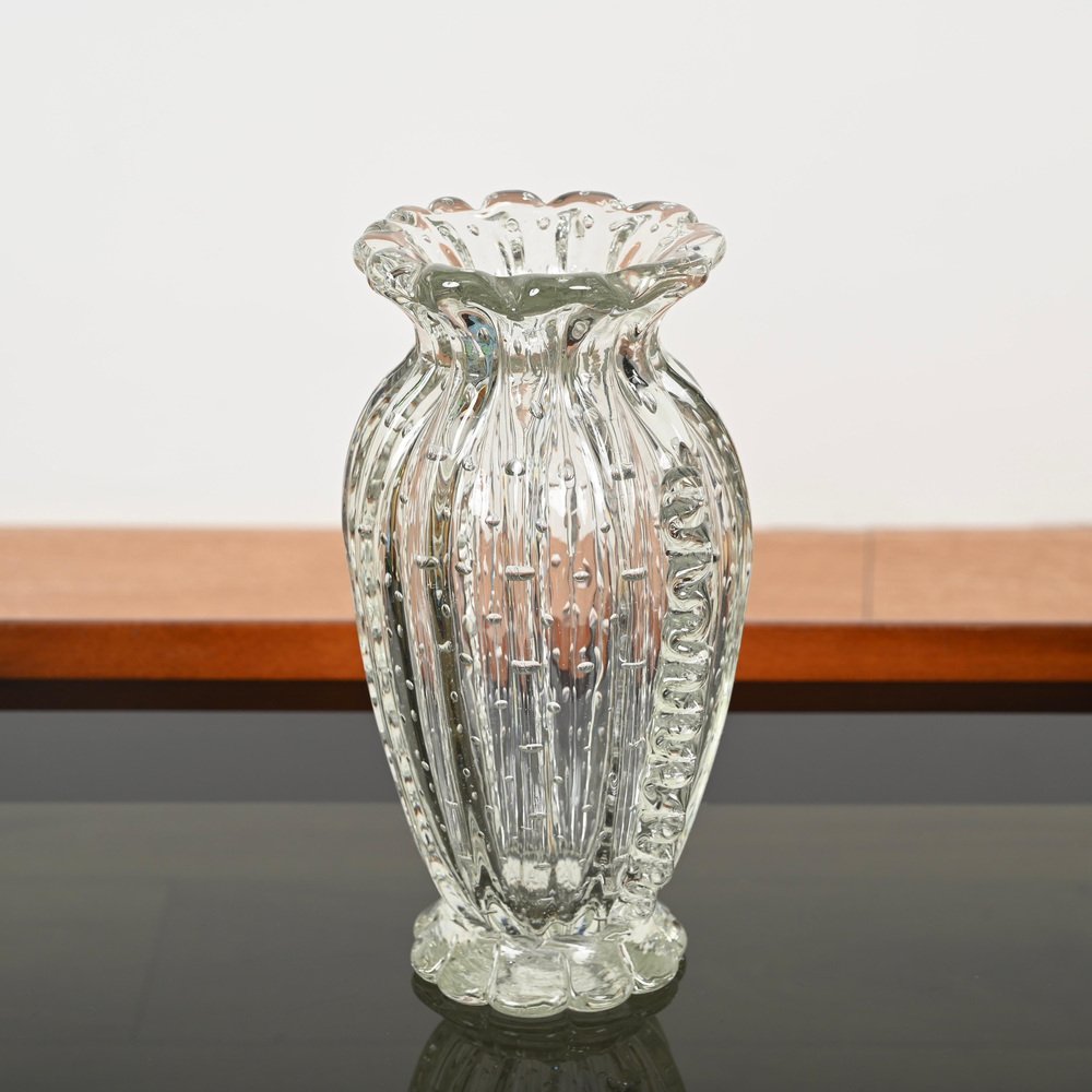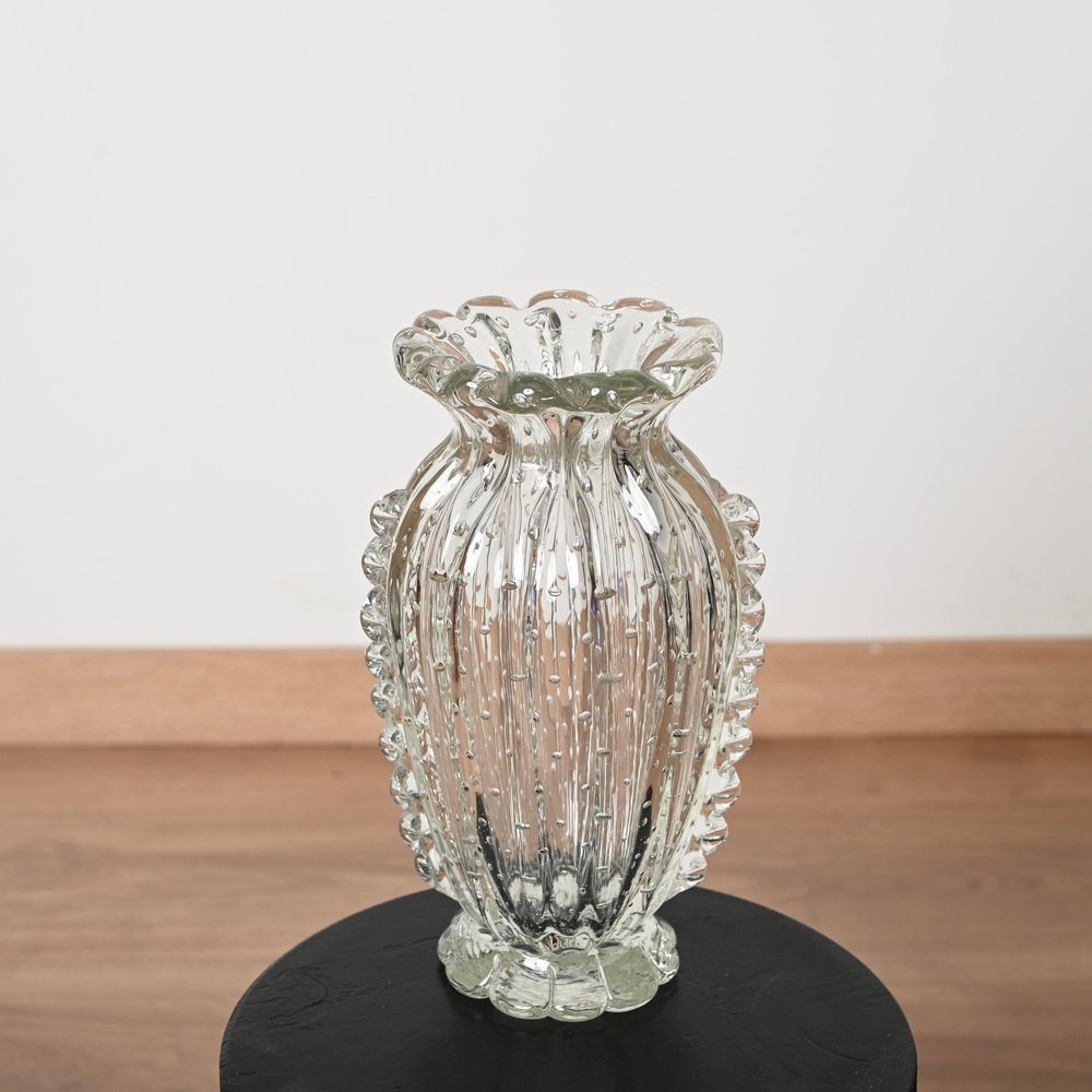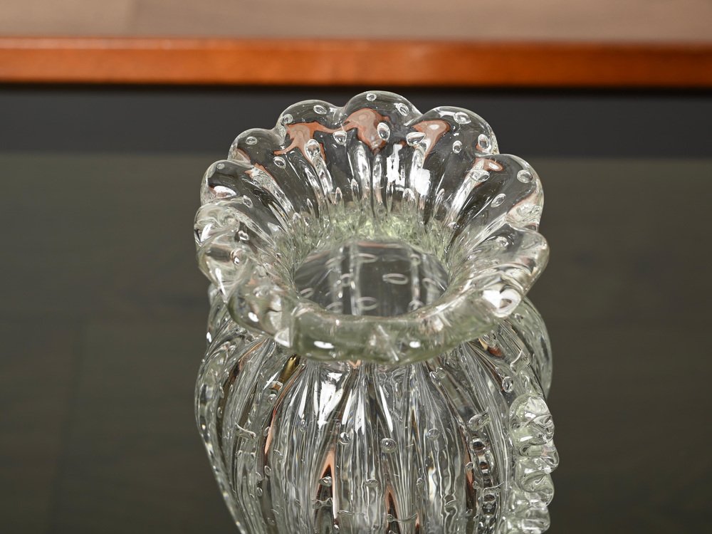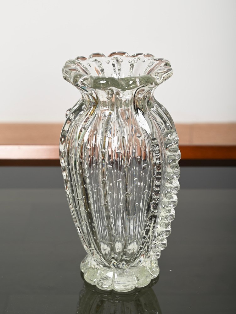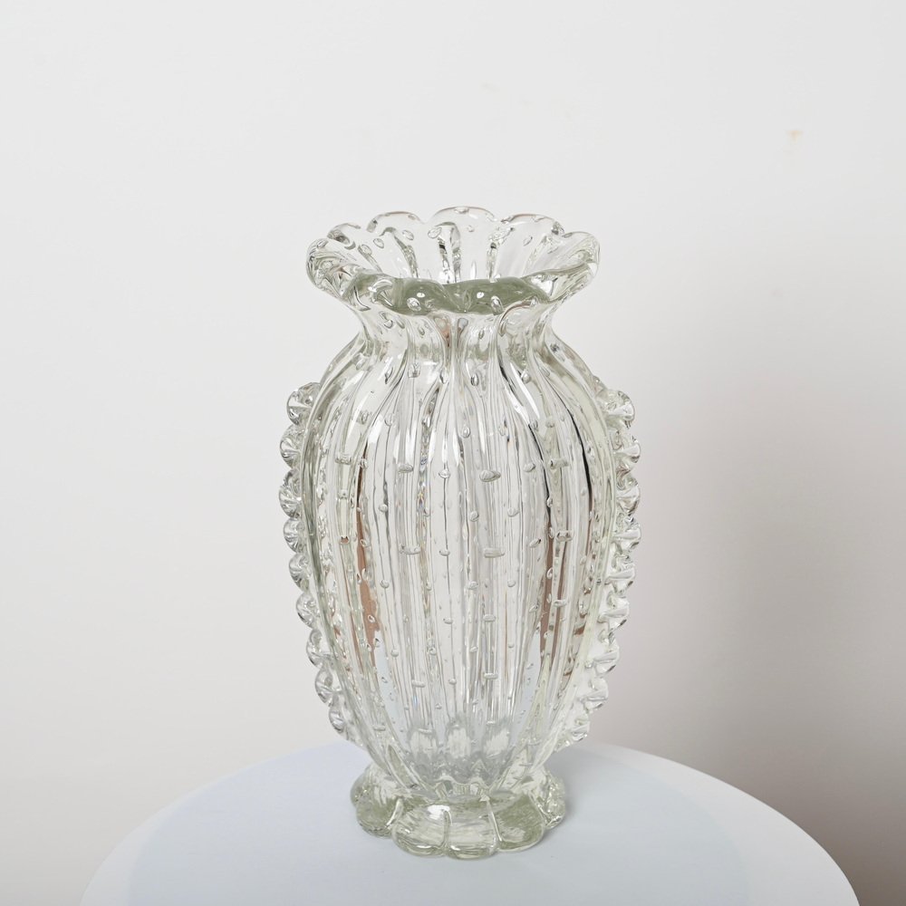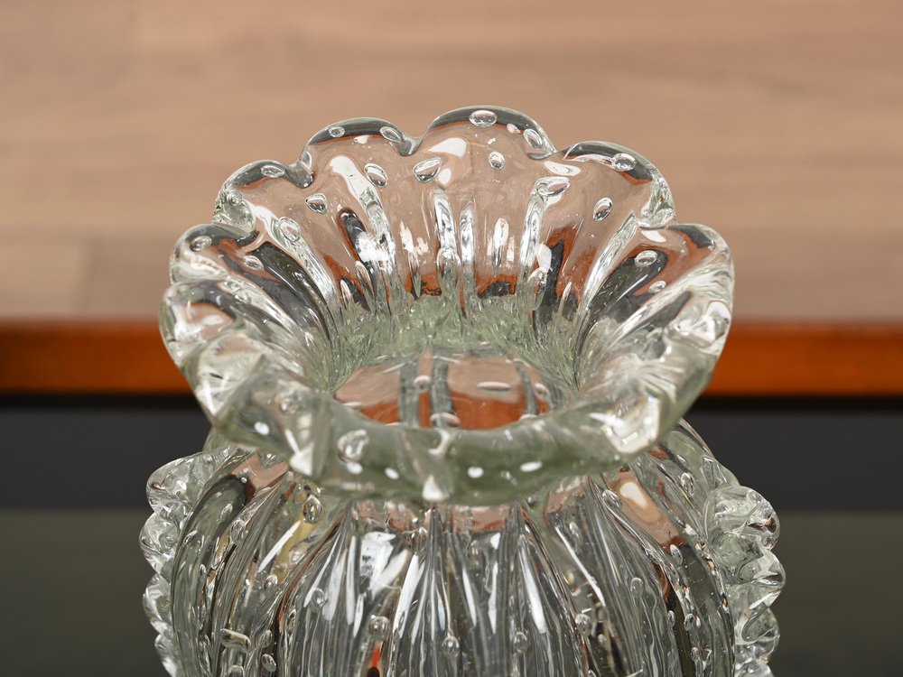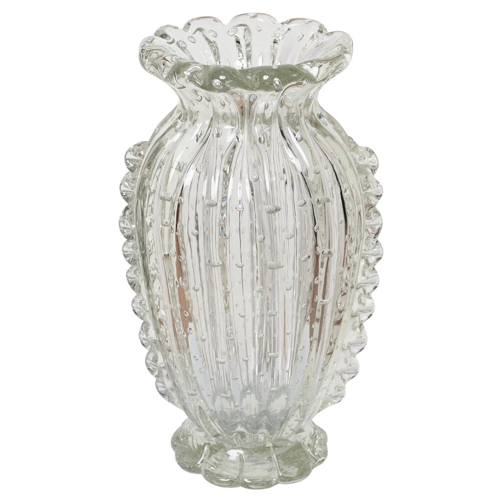 Magnífico jarrón de cristal de Murano soplado a boca rostrato y "bullicante" realizado por Ercole Barovier en Italia durante la década de 1950. En espectacular estado, no le falta ni una sola espiga, sin astillas ni grietas, lo que lo convierte en una pieza de museo. Este fabuloso jarrón decorativo floral de Murano es sencillamente espectacular gracias a su estado prístino y a su calidad alucinante. Este magnífico jarrón combinará sorprendentemente con cualquier arreglo floral. Una increíble obra maestra italiana. Un jarrón único y excepcional, perfecto para completar un proyecto moderno de mediados de siglo.