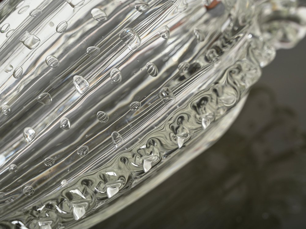 The “bullicante” effect is obtained by placing a piece of molten glass inside a metallic mold with spikes, very much resembling a pineapple’s texture. These spikes cause small holes on the surface creating a pattern all around the glass piece. After it’s been left to cool down for a few moments, the whole piece is submerged in molten glass again. This second layer completely covers the first one. However, thanks to the thick consistency of glass, the holes previously impressed on the first layer are not covered, thus causing air to be trapped between both layers of glass. This process can be repeated several times, creating a pattern as complicated as the glass master wishes. This technique gives not only a sense of depth to the whole object, but also an incomparable decorative effect, famous for its originality.