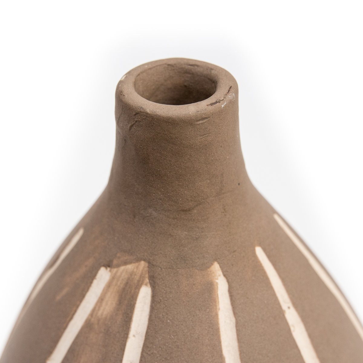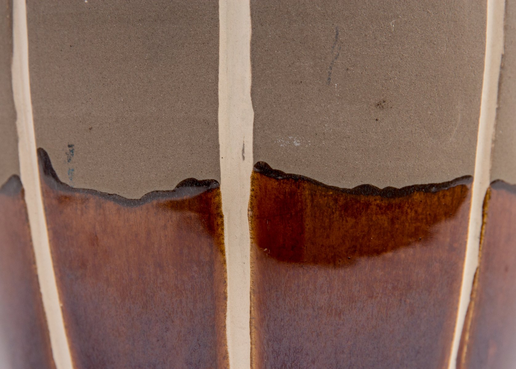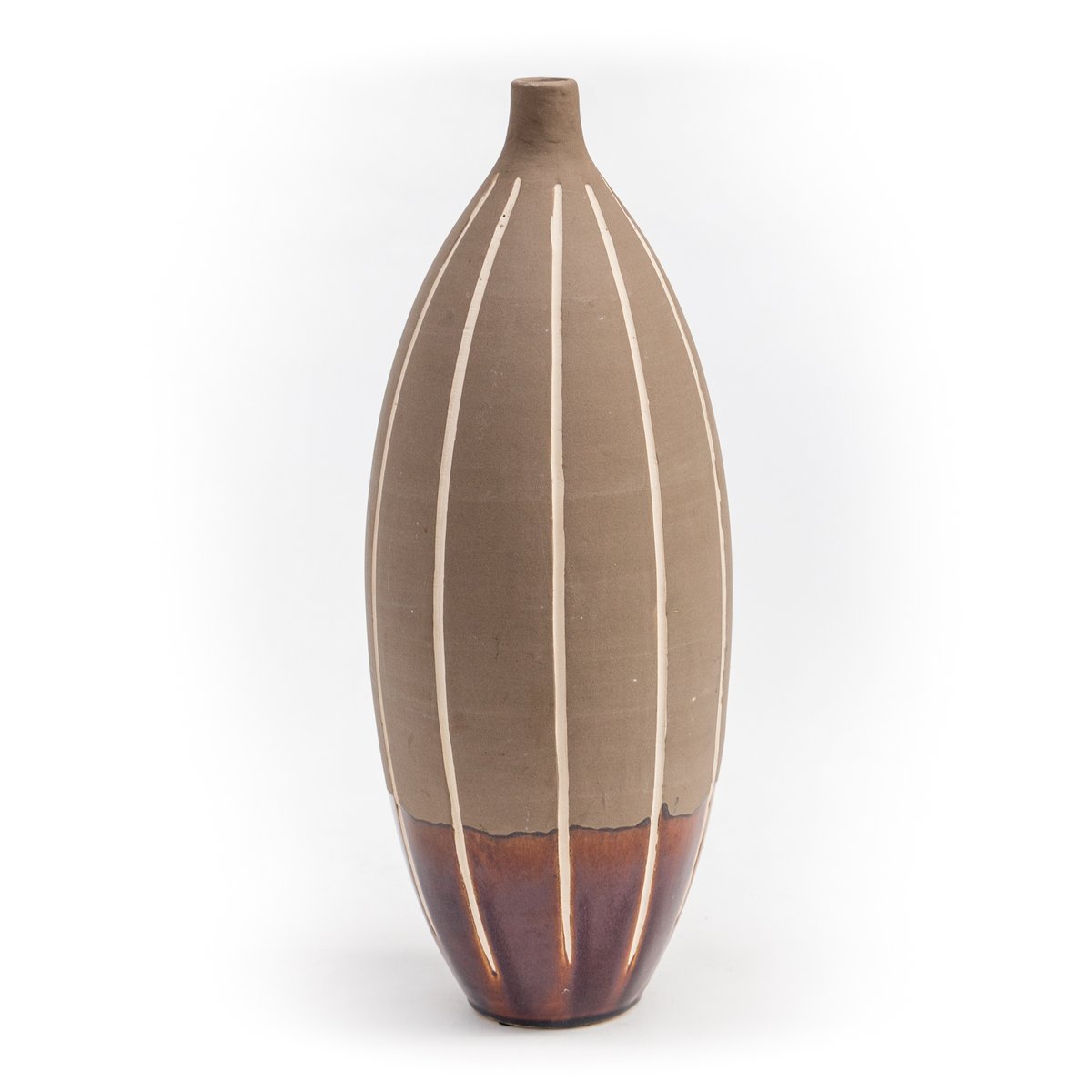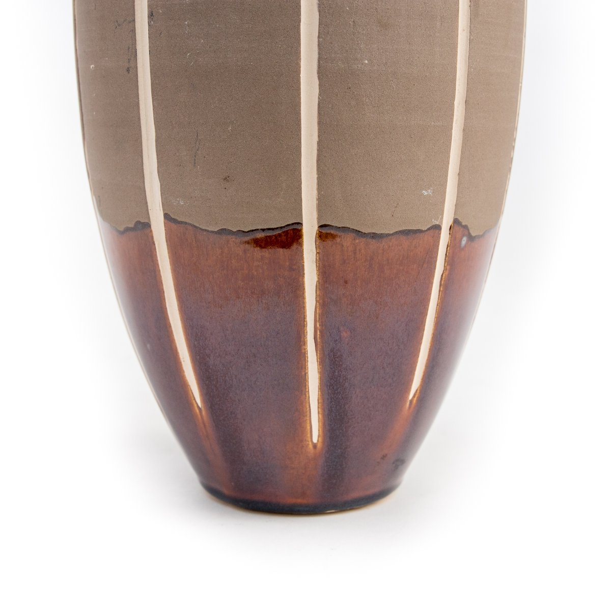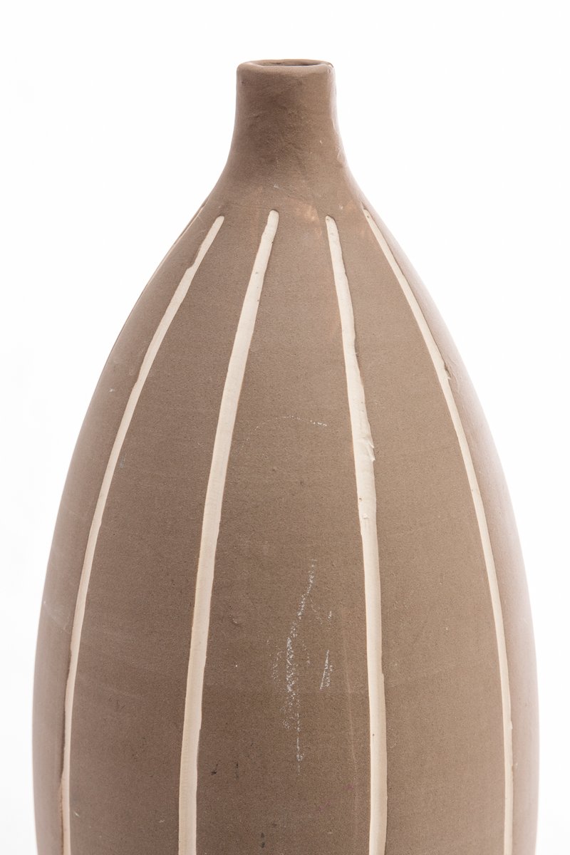 Llama la atención su original forma que recuerda a las formas orgánicas. Su silueta es alargada, se vuelve muy voluminosa en el centro, para converger en la parte superior en un cuello corto y muy estrecho. El jarrón está esmaltado hasta 1/4 de la altura, con un tono marrón ocre intenso. El resto de la superficie tiene un acabado beige claro mate. Además, unas líneas blancas de estrías recorren toda la longitud del cuerpo.