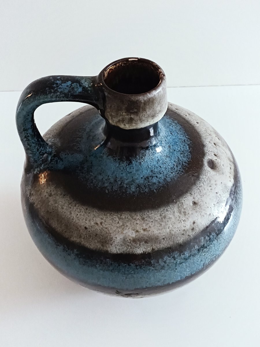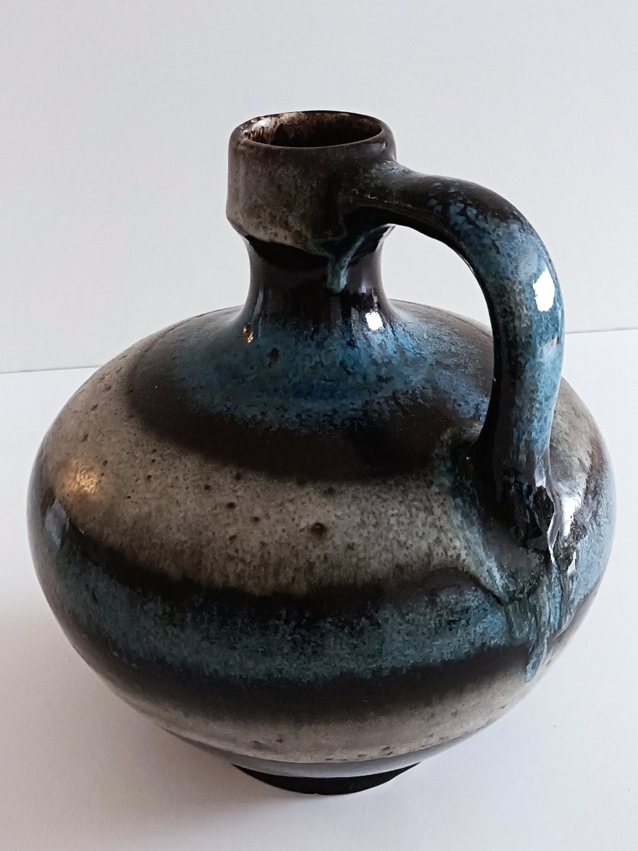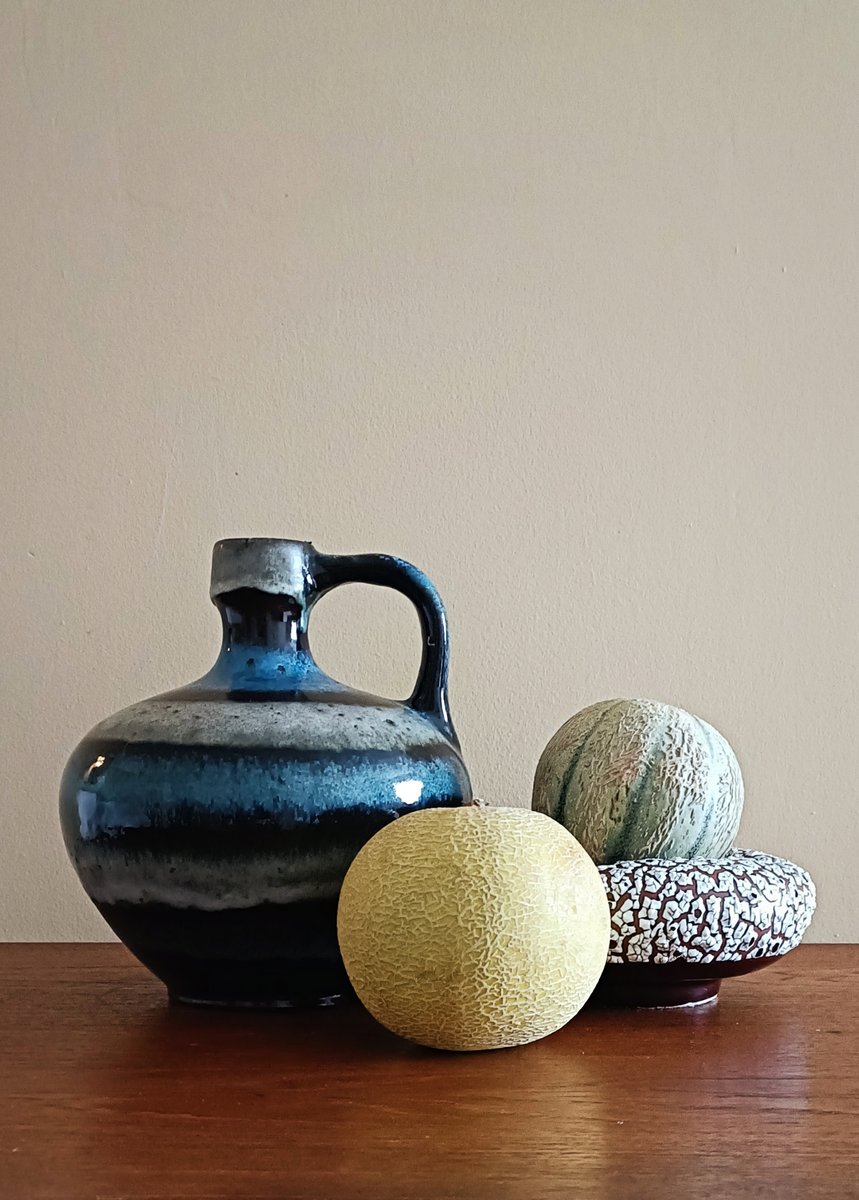 Este jarrón de cerámica, diseñado por el célebre artista Kurt Tschörner para Ruscha, ejemplifica el enfoque audaz e innovador característico de la cerámica artística alemana de mediados de siglo. Realizada a mano en la década de 1960, la pieza presenta una llamativa decoración de esmalte a rayas en tonos azules, negros y grises, mostrando la dinámica interacción de colores y texturas por la que Tschörner y Ruscha son célebres. La técnica de esmaltado refleja la meticulosa artesanía y la experimentación artística predominantes en esta época del diseño cerámico.