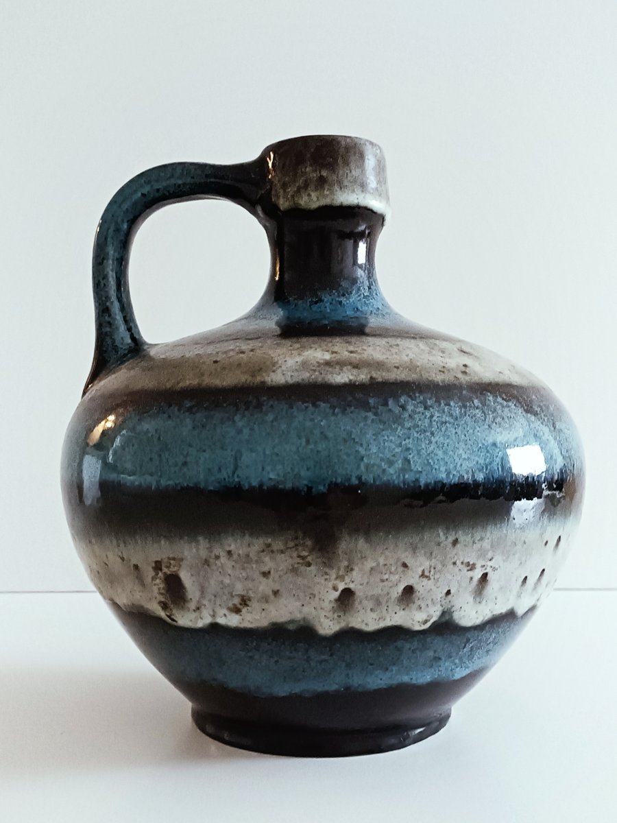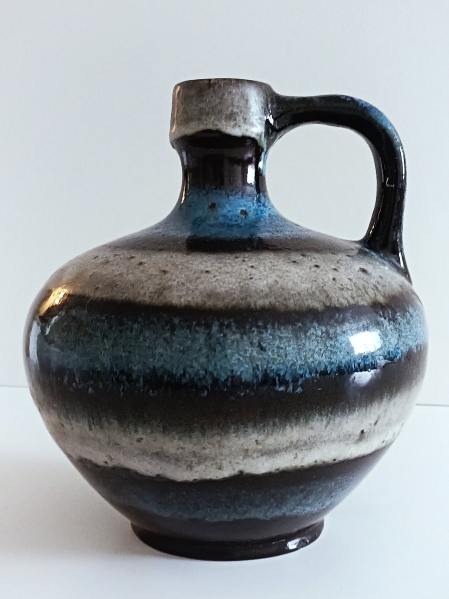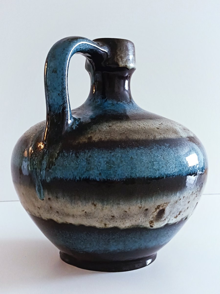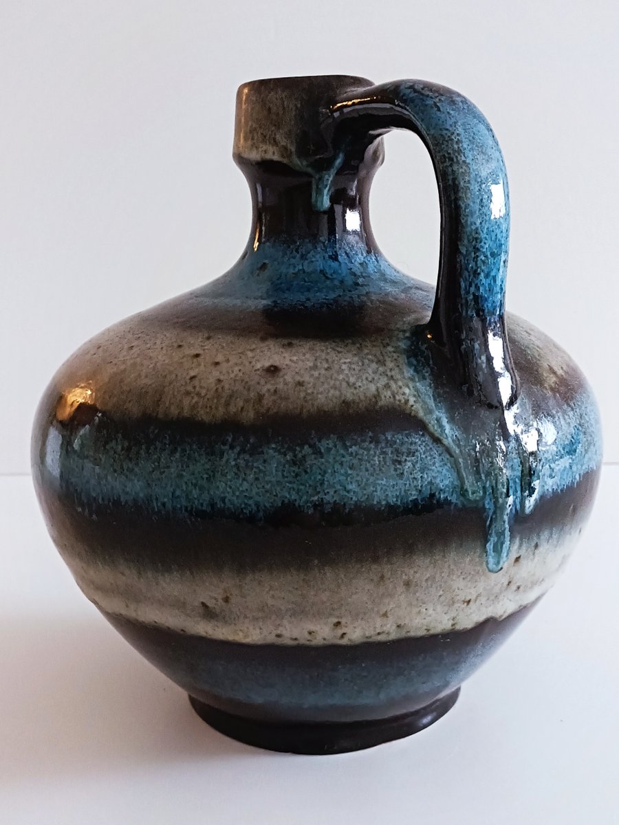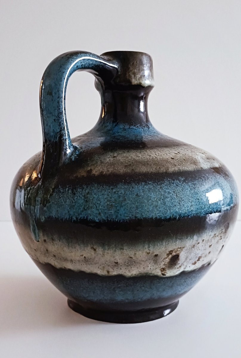 This ceramic vase, designed by renowned artist Kurt Tschörner for Ruscha, exemplifies the bold and innovative approach characteristic of mid-century West German art pottery. Handmade in the 1960s, the piece features a striking striped glaze decor in shades of blue, black, and grey, showcasing the dynamic interplay of colors and textures for which Tschörner and Ruscha are celebrated. The glazing technique reflects the meticulous craftsmanship and artistic experimentation prevalent in this era of ceramic design.