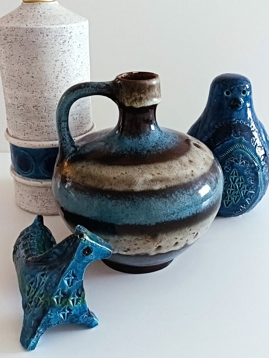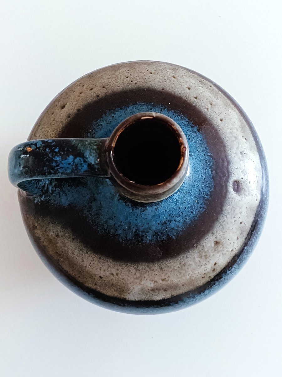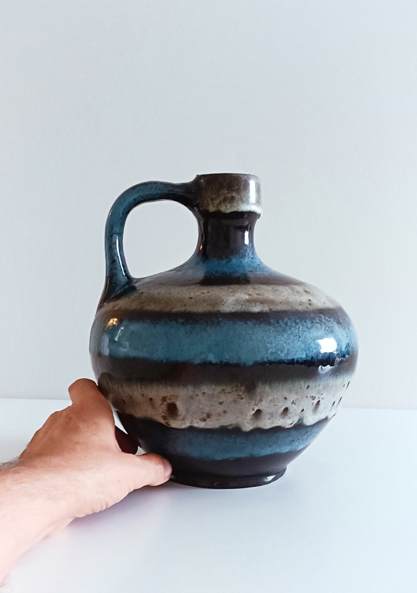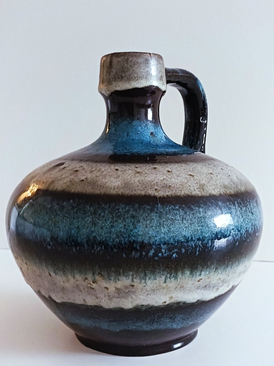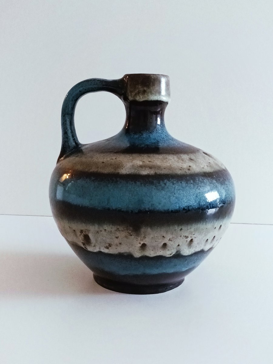 This ceramic vase, designed by renowned artist Kurt Tschörner for Ruscha, exemplifies the bold and innovative approach characteristic of mid-century West German art pottery. Handmade in the 1960s, the piece features a striking striped glaze decor in shades of blue, black, and grey, showcasing the dynamic interplay of colors and textures for which Tschörner and Ruscha are celebrated. The glazing technique reflects the meticulous craftsmanship and artistic experimentation prevalent in this era of ceramic design.