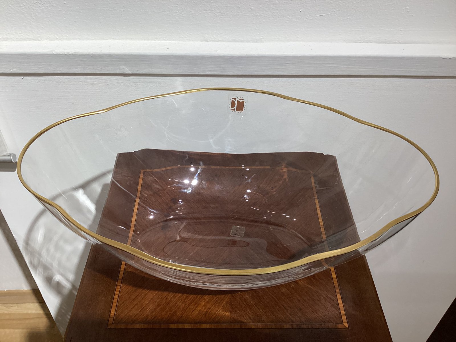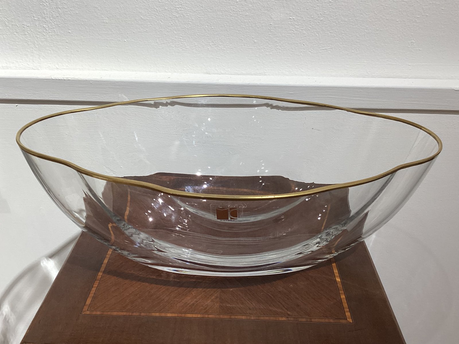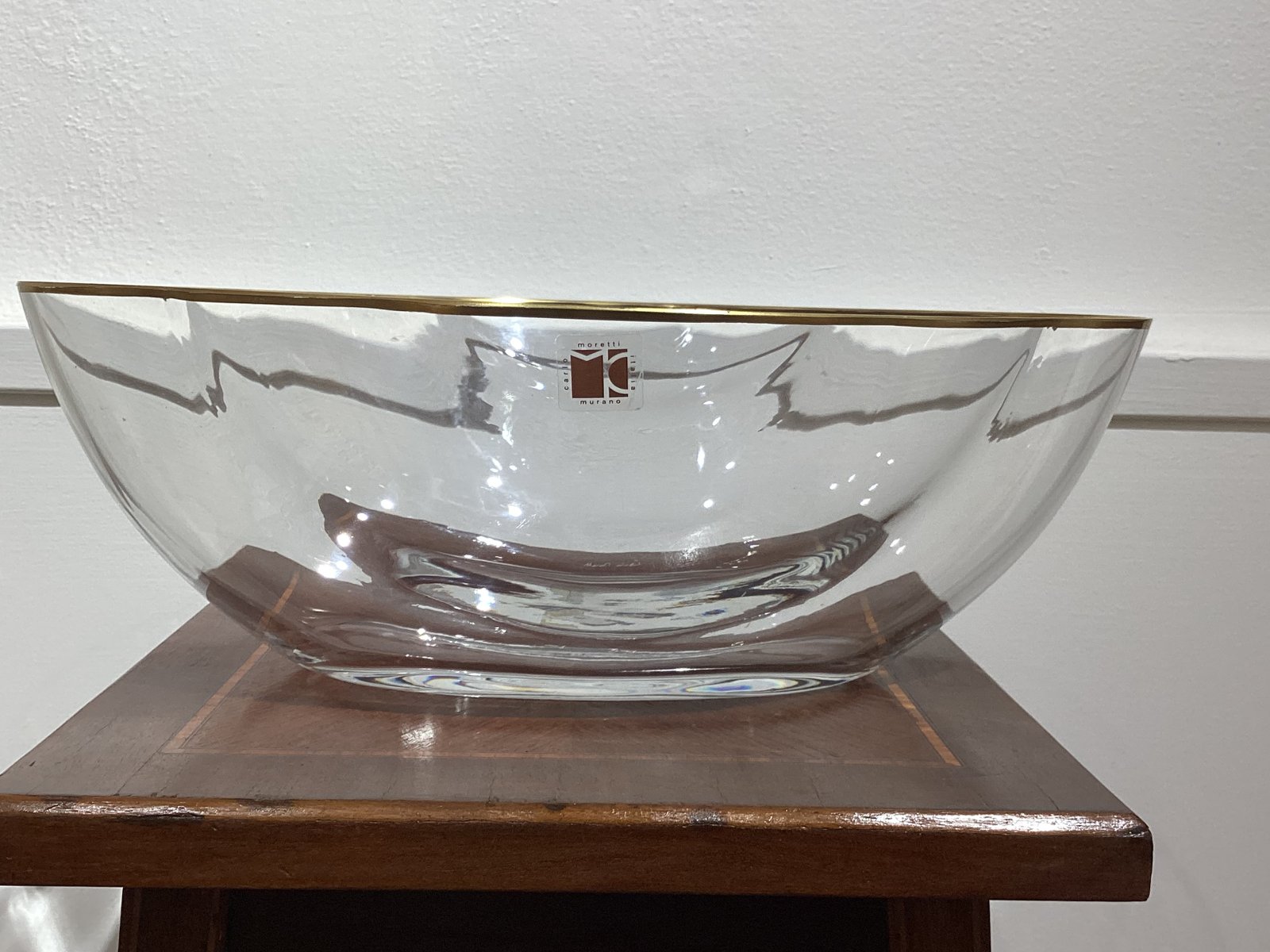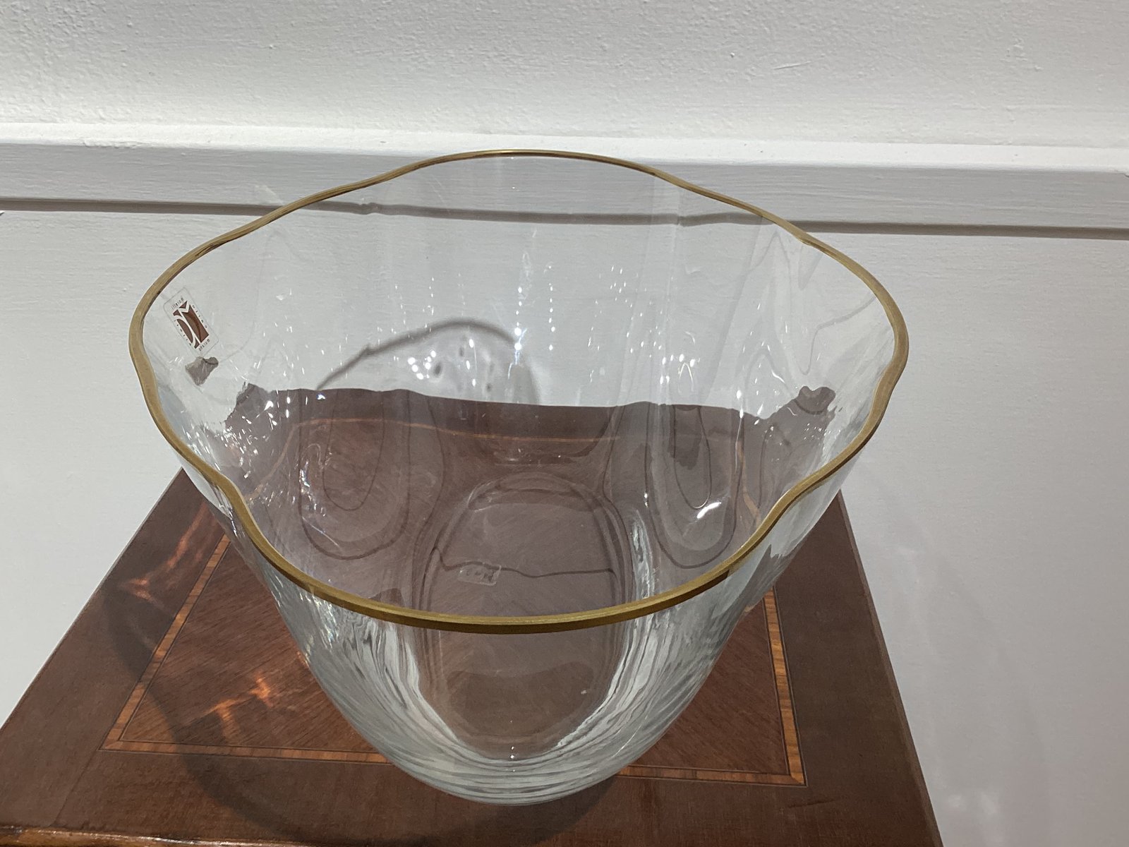 Jarrón para centro de mesa de cristal de Murano claro con borde dorado de Carlo Moretti, años 80