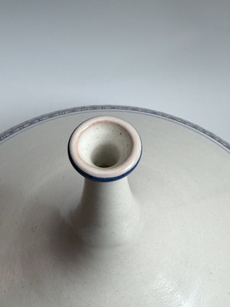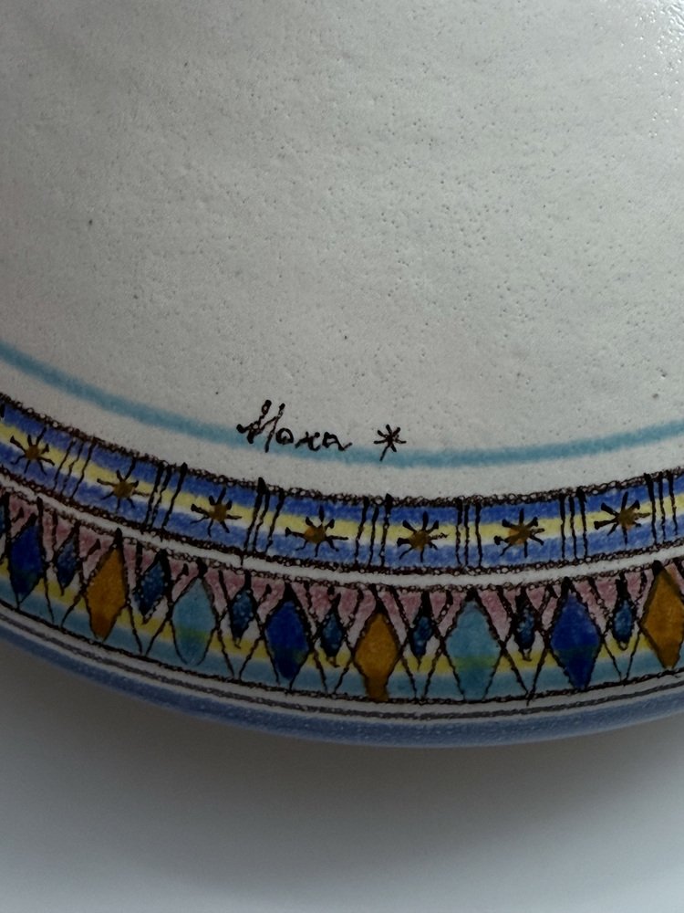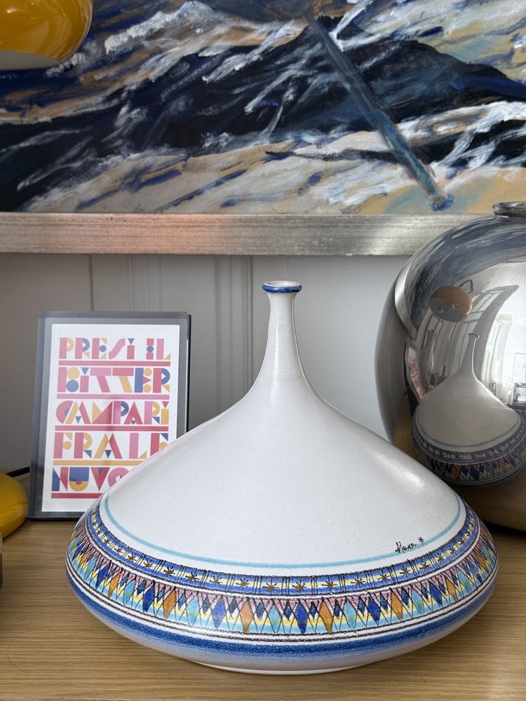 Jarrón de cerámica artesanal a gran escala, realizado por Giovanni Mosca en su taller de Vietri sul Mare. El jarrón presenta una silueta escultural y poderosa, con un cuerpo ancho, una cúpula cónica y un cuello esbelto. La decoración pintada a mano en la parte inferior combina motivos geométricos con una paleta de colores cuidadosamente equilibrada, en tonos azules, ocres y pasteles, lo que confiere a la pieza un carácter claramente mediterráneo.