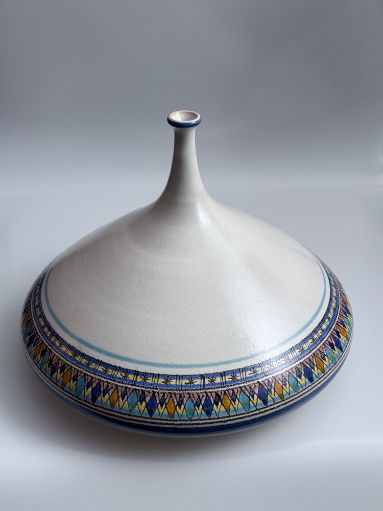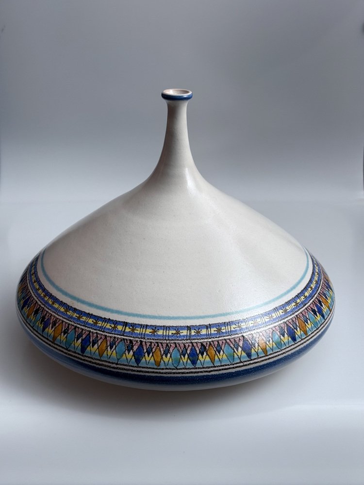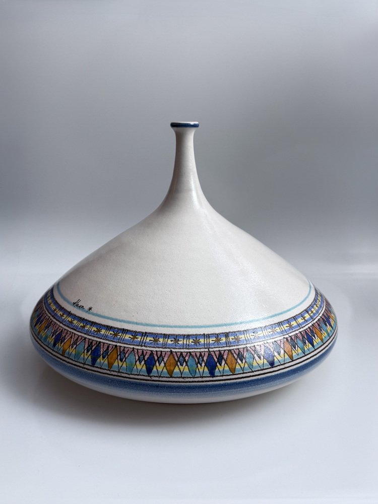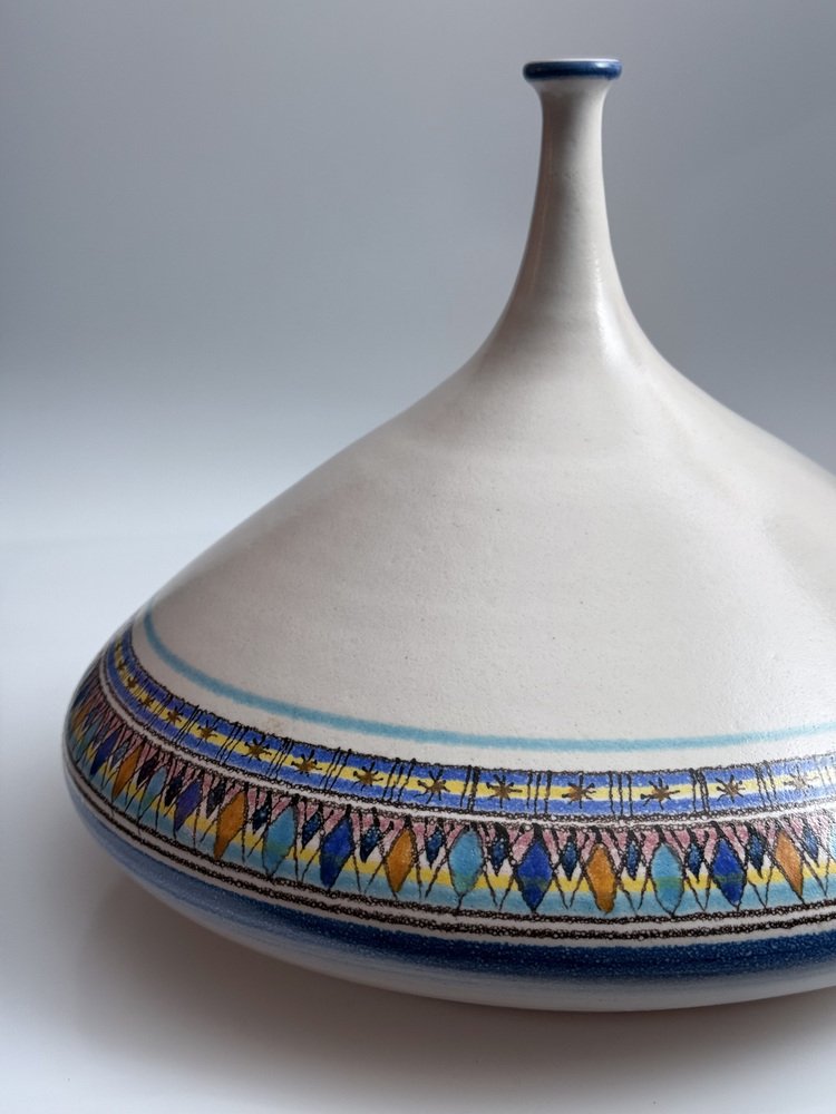 The vase features a powerful sculptural silhouette with a wide body, conical dome and slender neck. The hand-painted decoration around the lower section combines geometric patterns with a carefully balanced palette of blues, ochres and pastel tones, giving the piece a distinctly Mediterranean character.