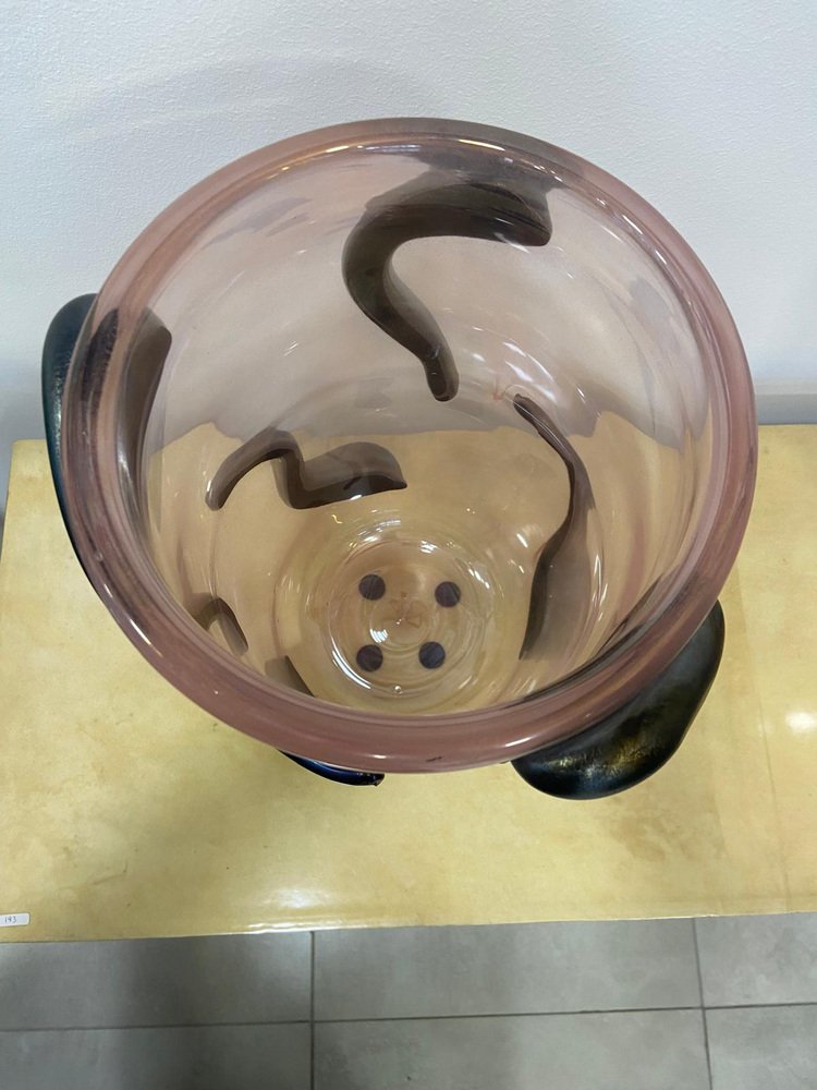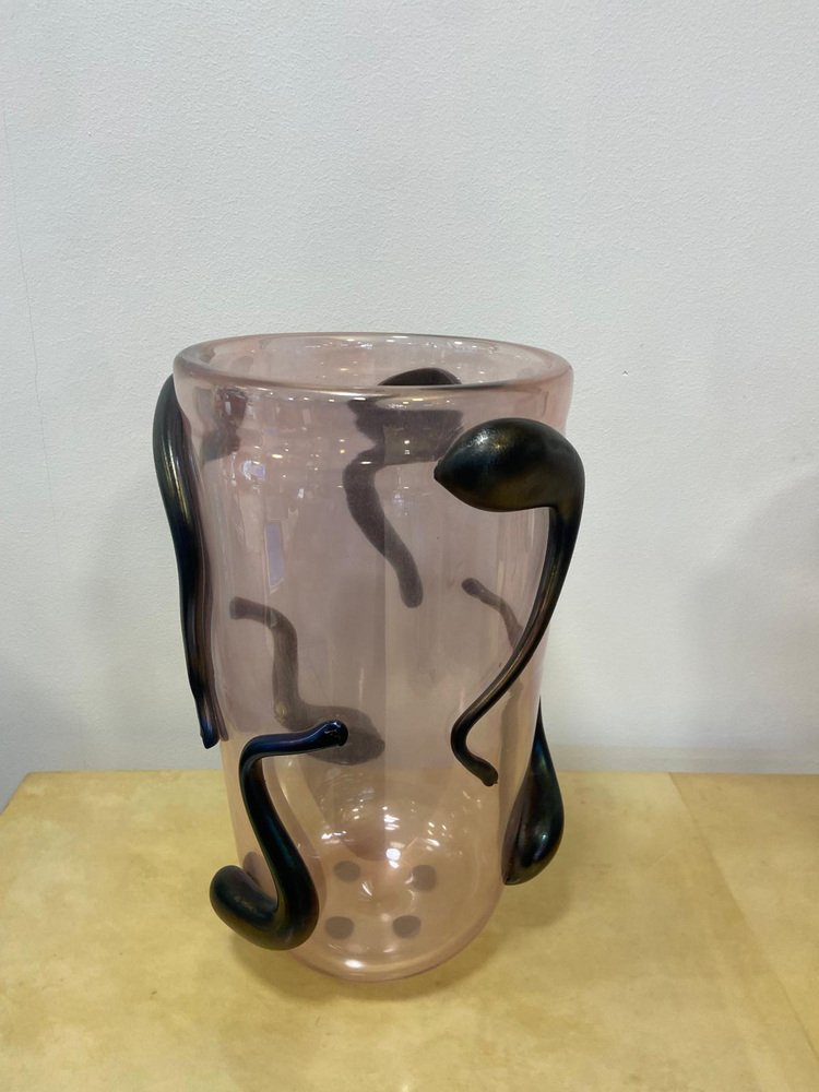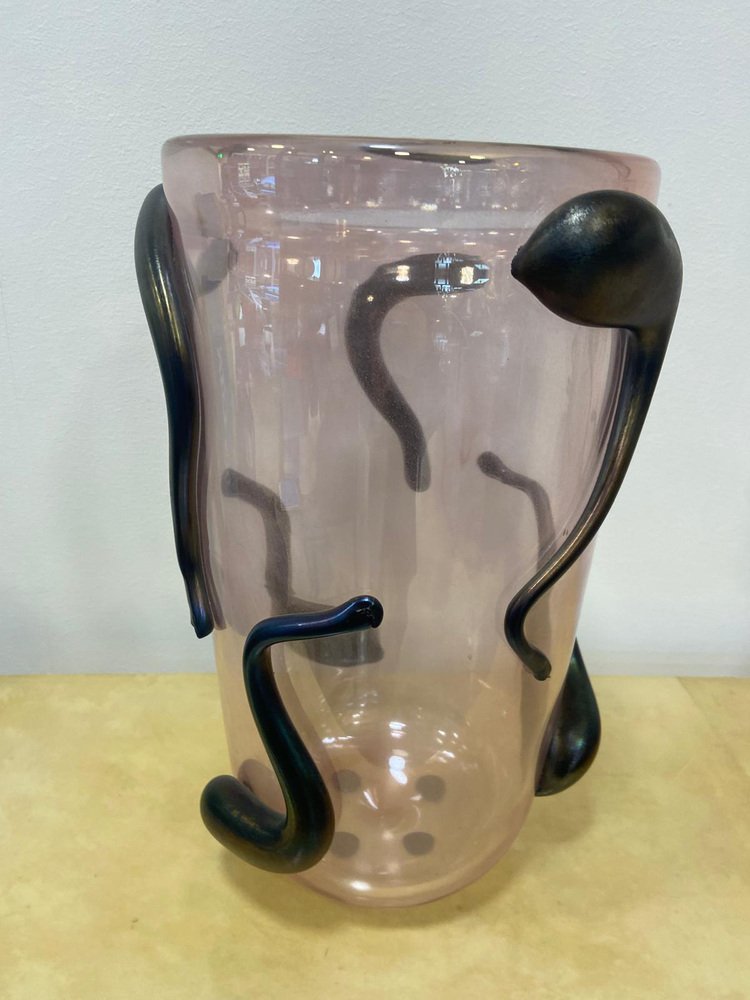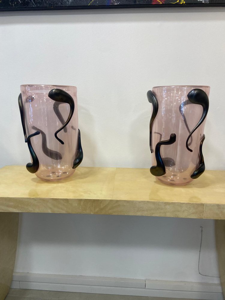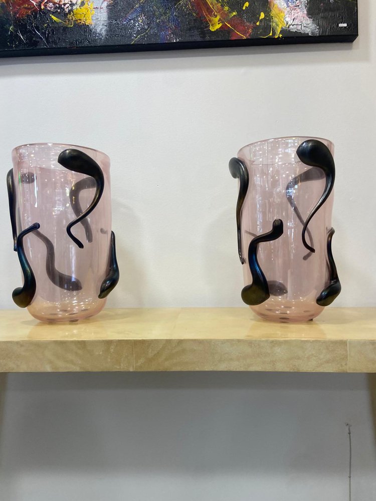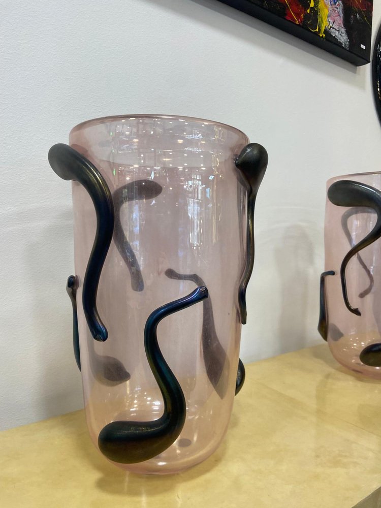 Un refinado par de jarrones auténticos de cristal de Murano, firmados por Costantini. Los jarrones presentan una esbelta forma cilíndrica en cristal soplado transparente con un delicado tono rosado, realzado por aplicaciones externas de cristal negro, moldeadas al calor en sinuosos elementos orgánicos que envuelven la superficie, creando un llamativo contraste de color y textura.