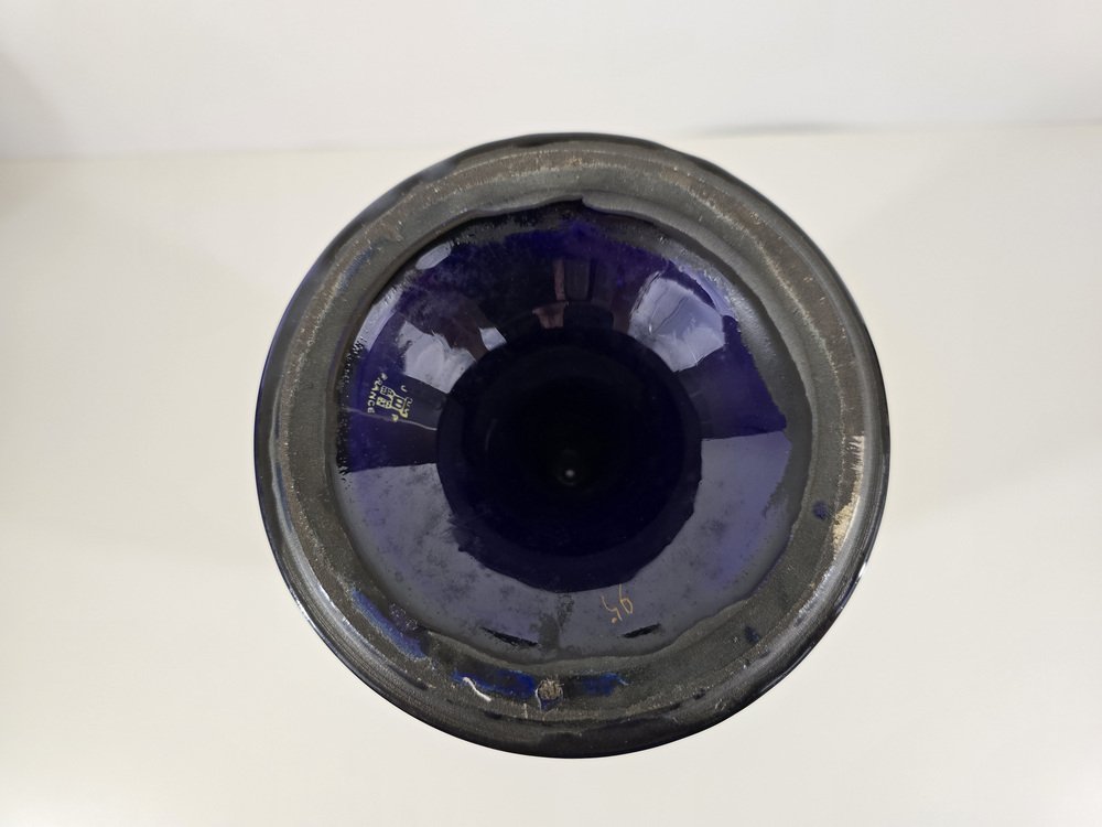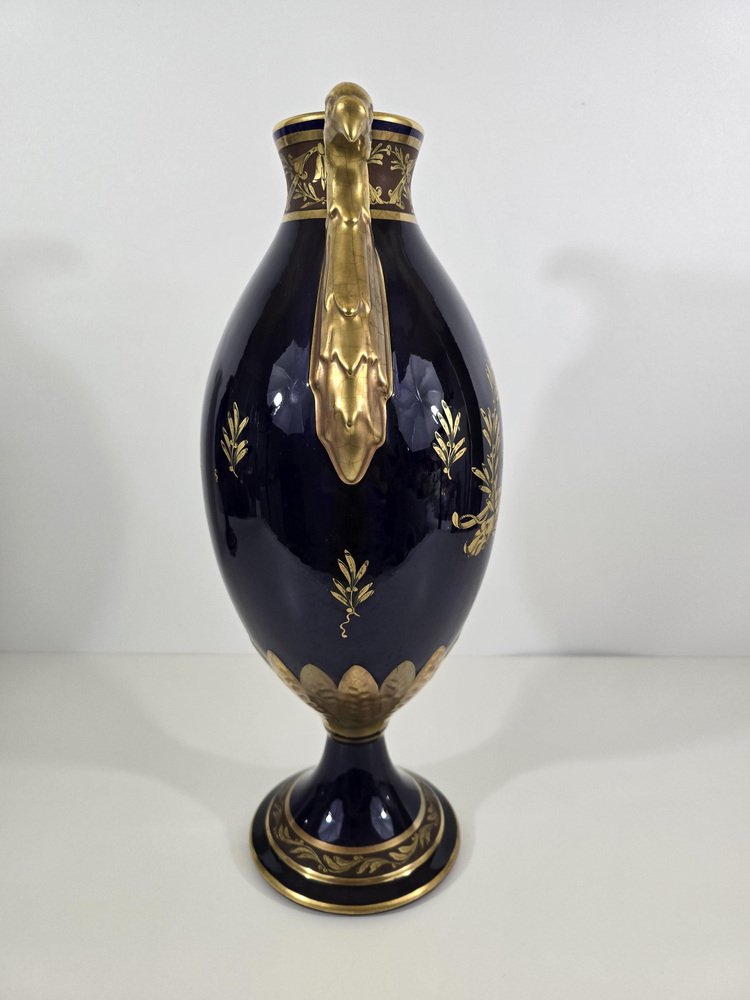 Los jarrones son de porcelana esmaltada en un intenso azul cobalto, color característico de las piezas de lujo de la época.