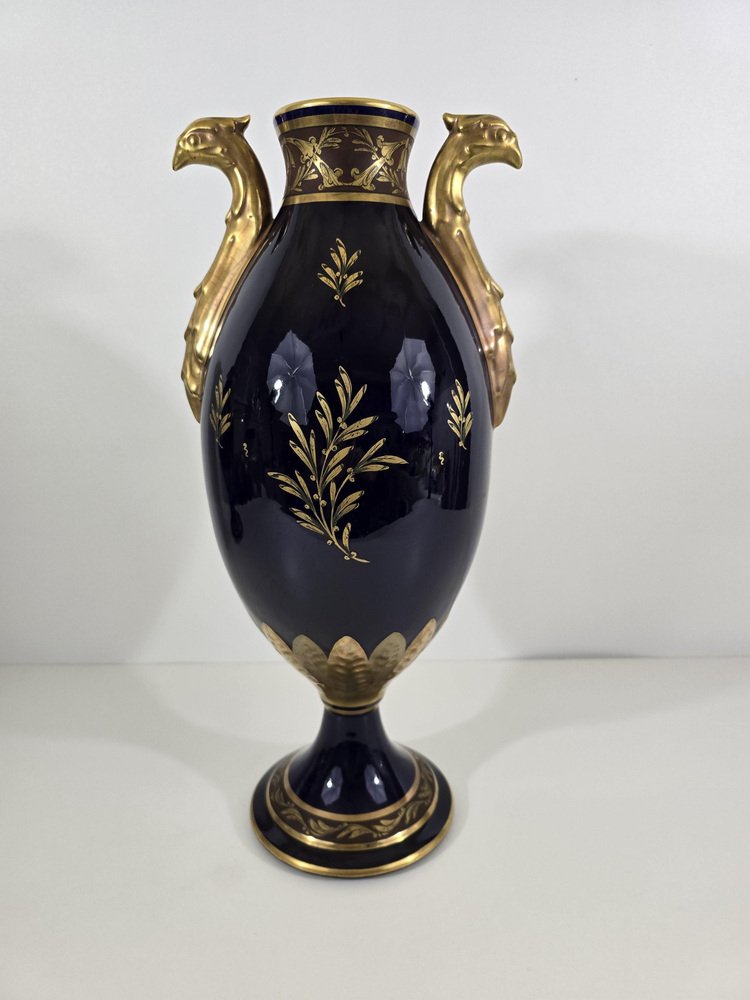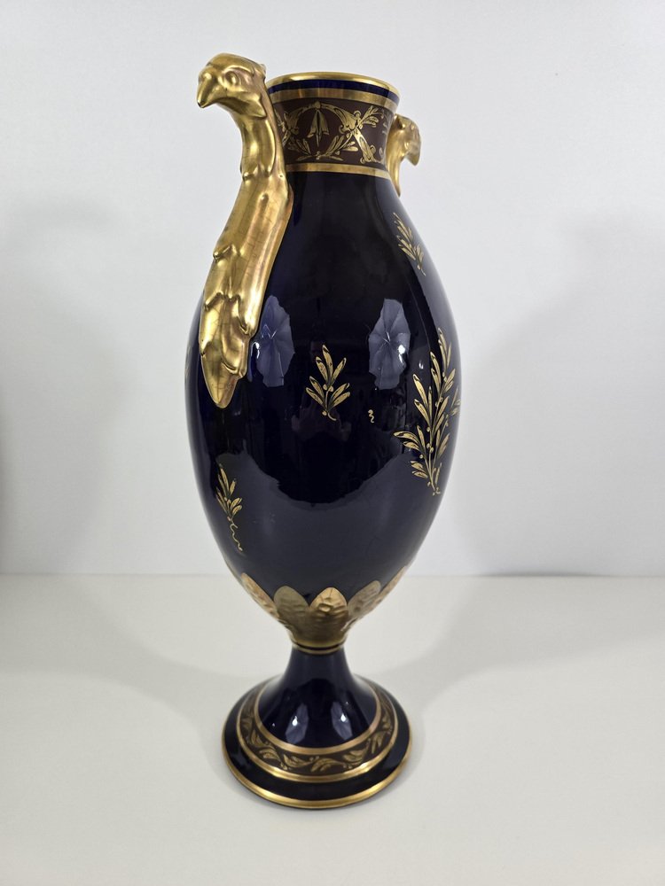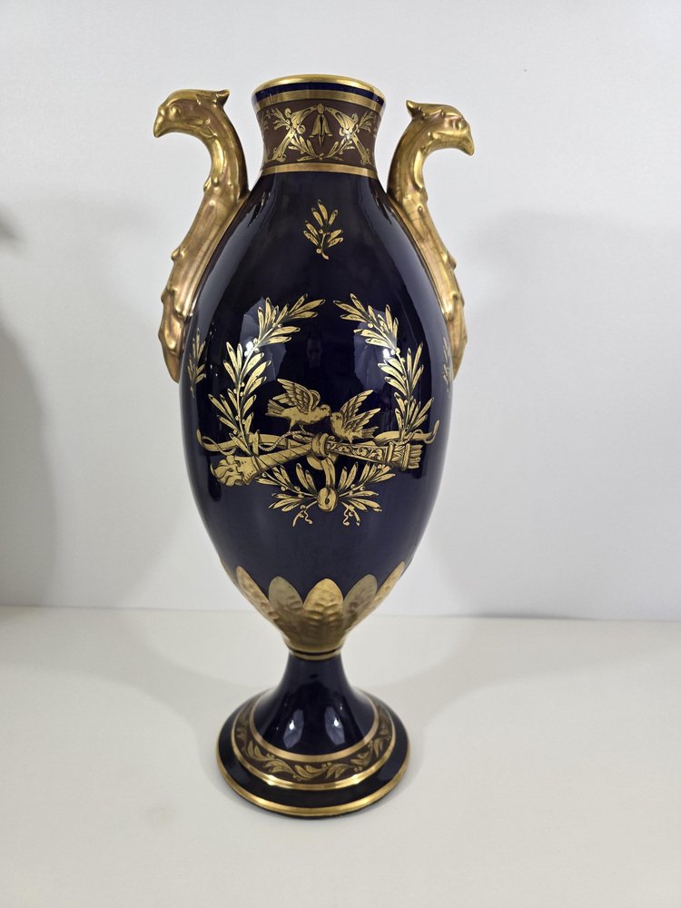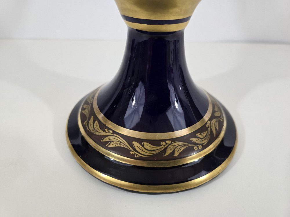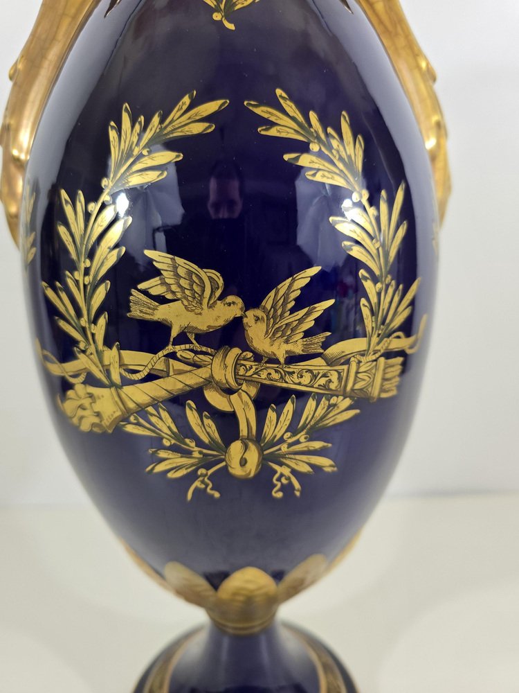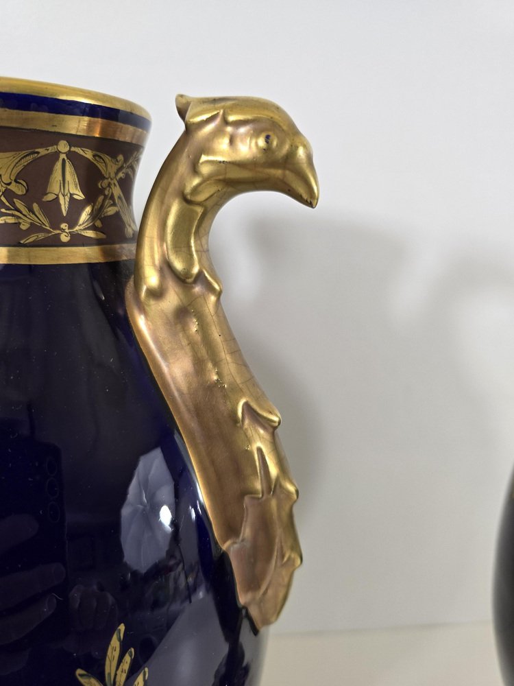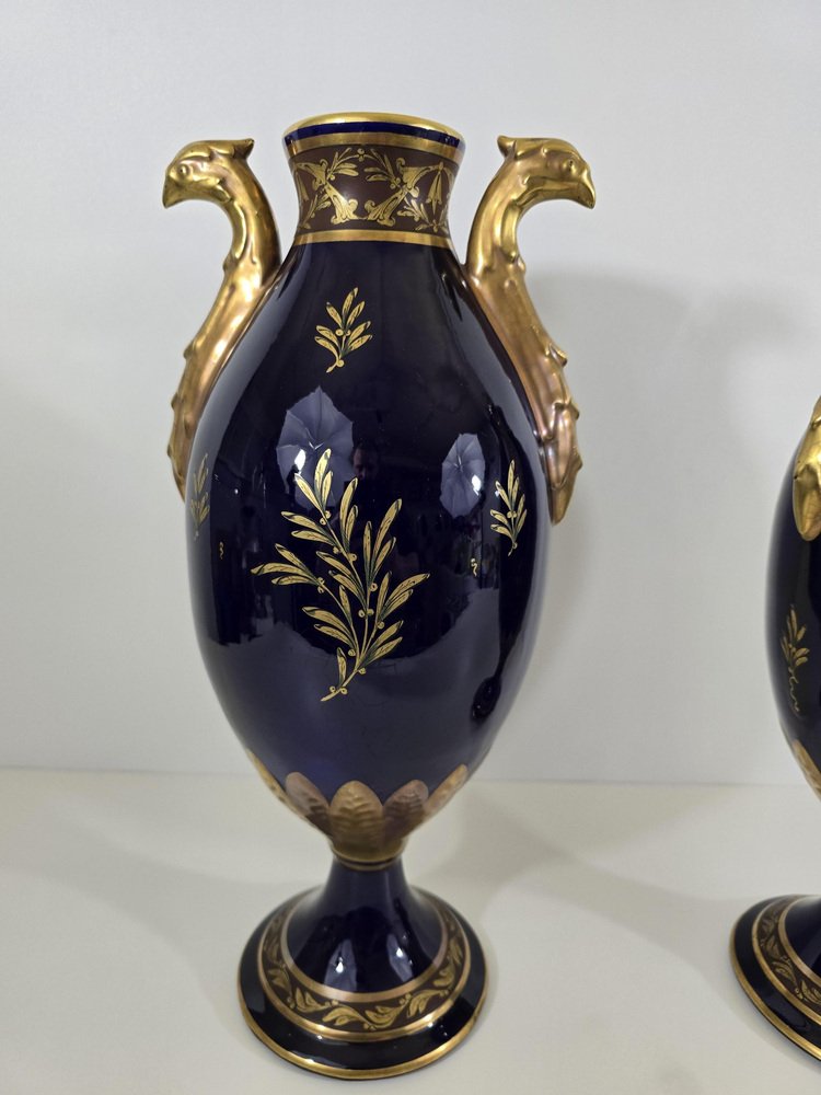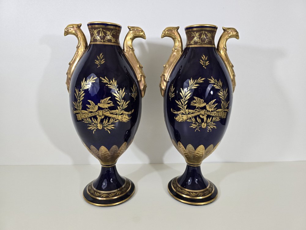 The vases are made of porcelain enameled in a deep cobalt blue, a color characteristic of luxury pieces of the time.