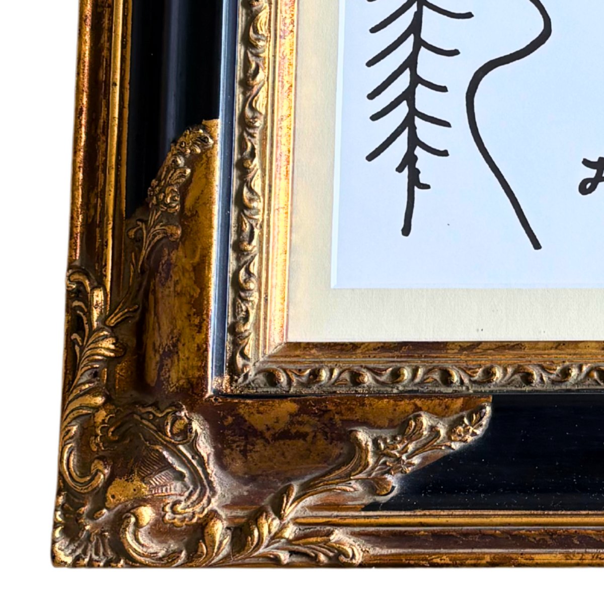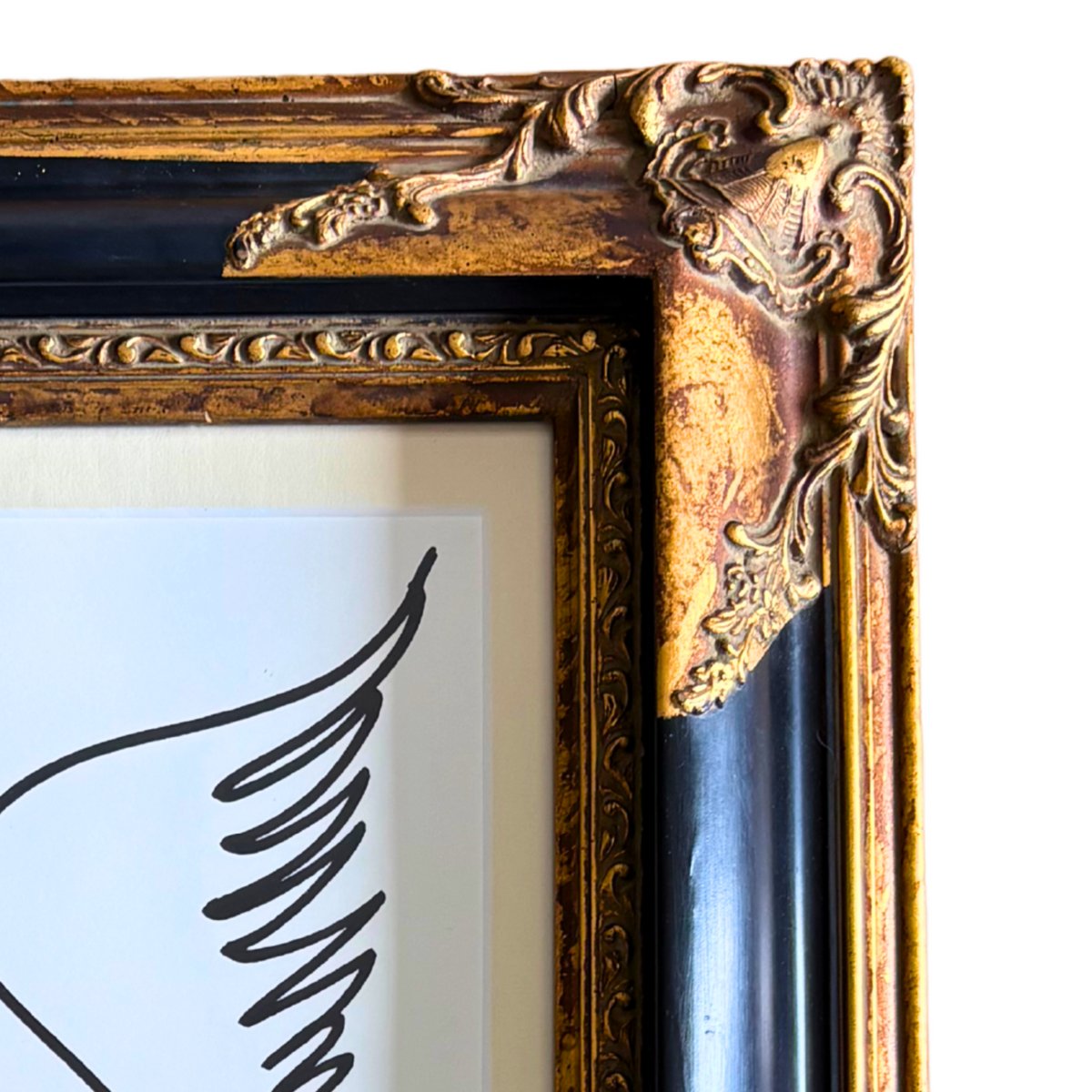La obra está bellamente presentada en un auténtico marco de madera estilo Imperio del siglo XIX, adornado con detalles dorados y una silueta clásica que contrasta elegantemente con el dibujo modernista. La yuxtaposición de épocas crea un impacto visual poderoso y único.