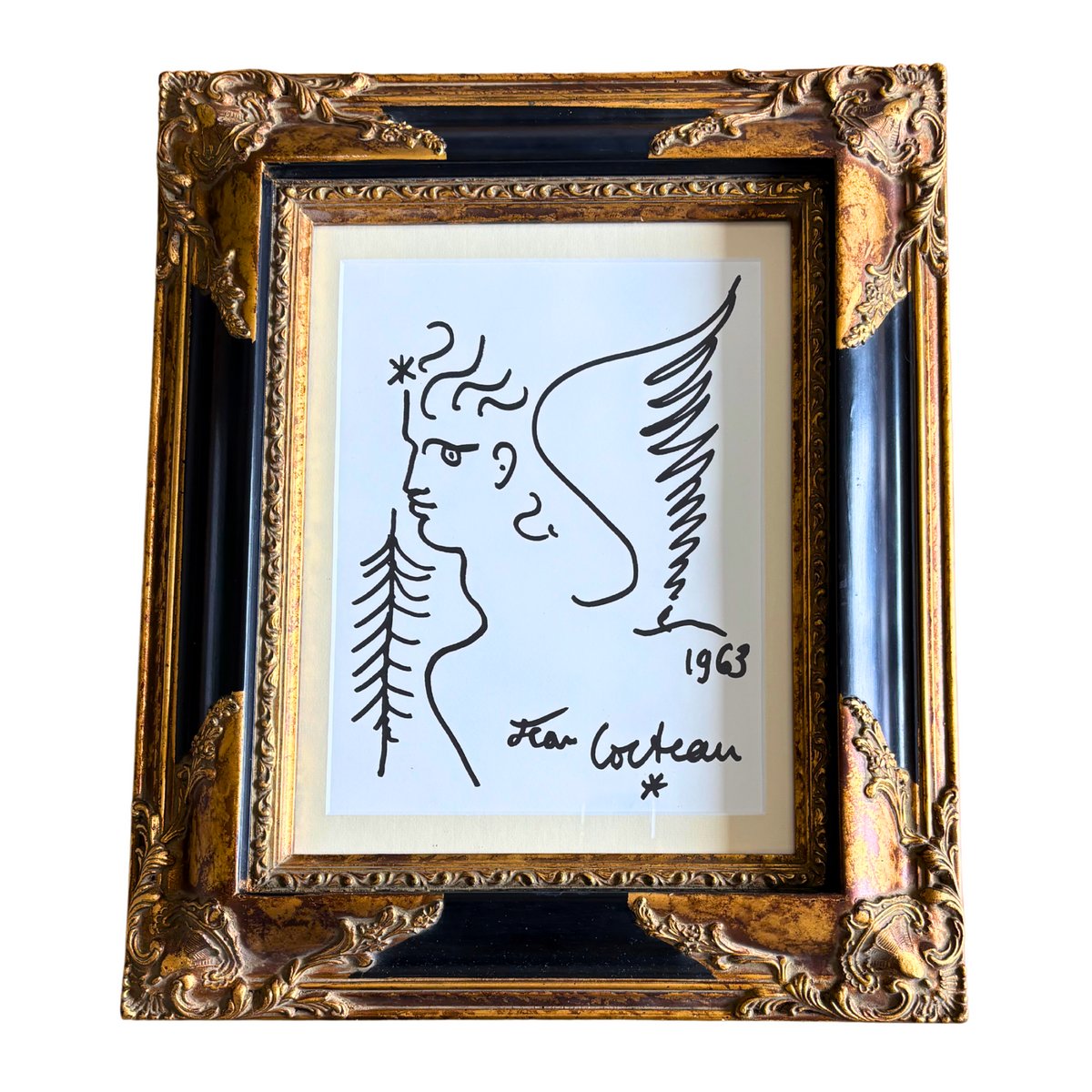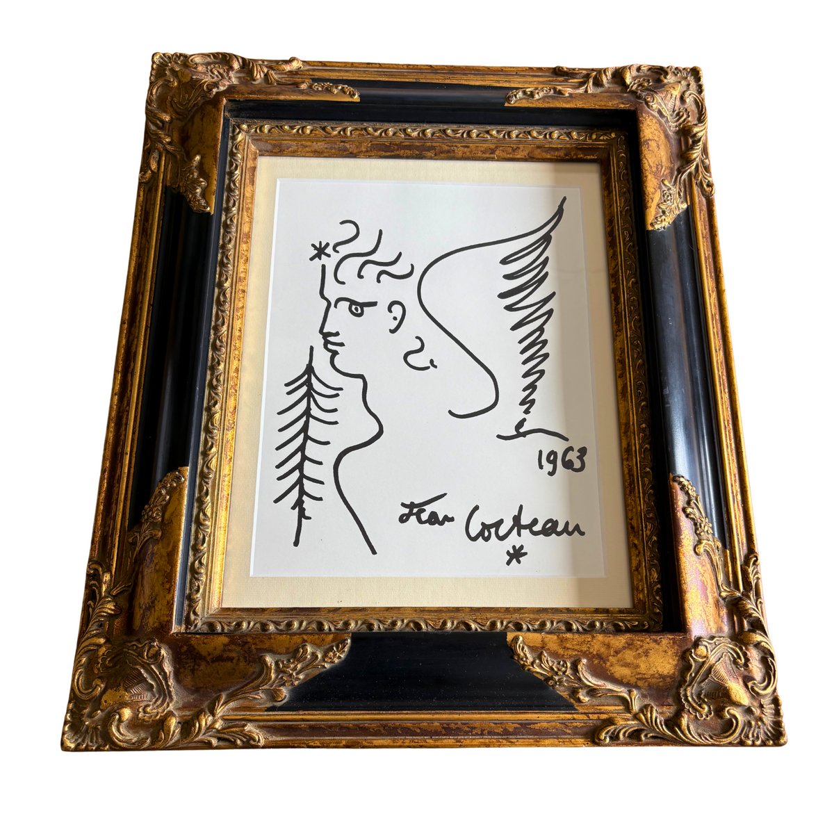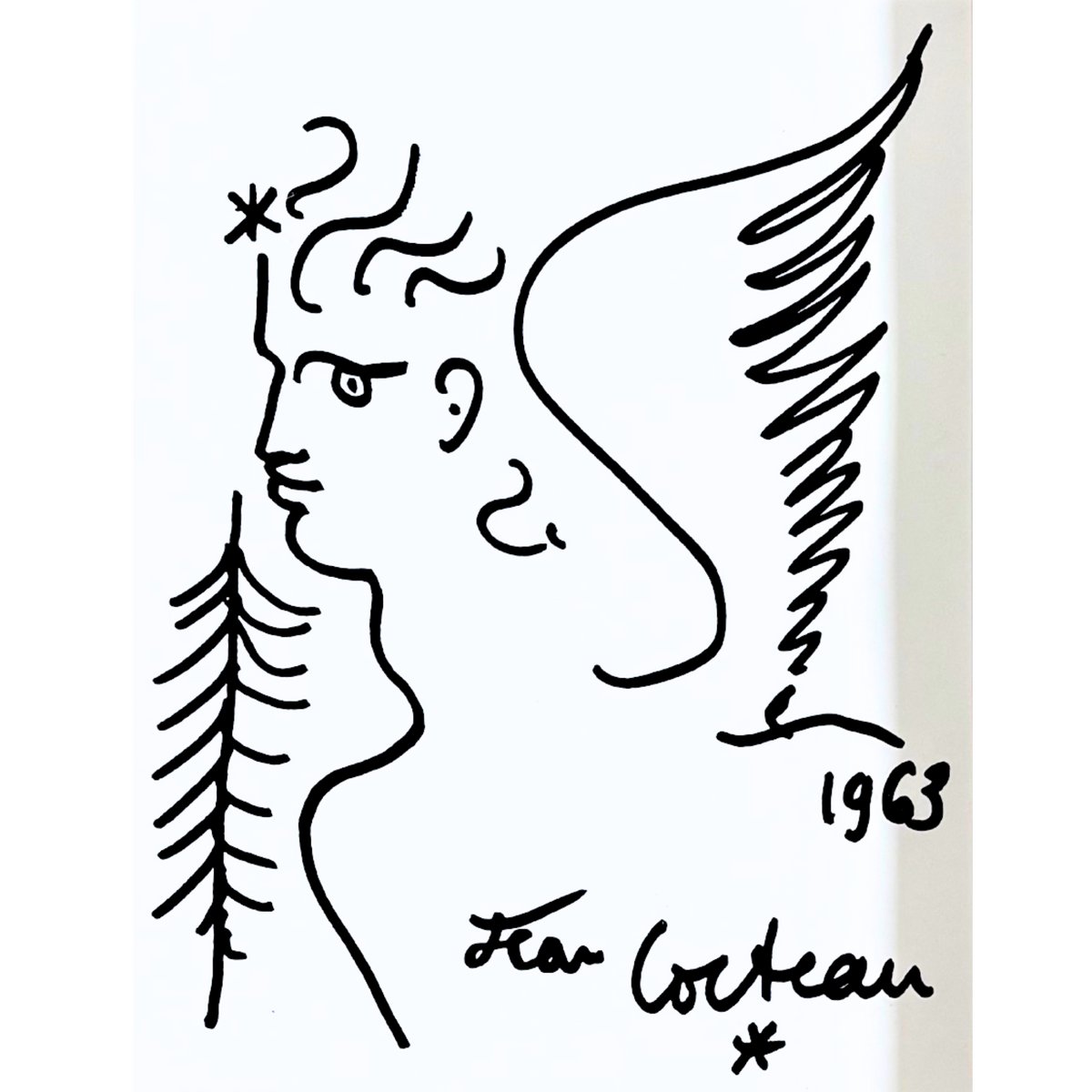 "Adéntrese en el mundo poético de Jean Cocteau con esta sorprendente litografía original que representa una figura mitológica en su característico estilo lineal.