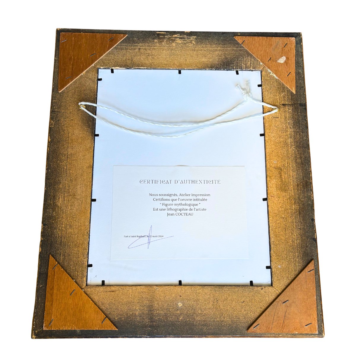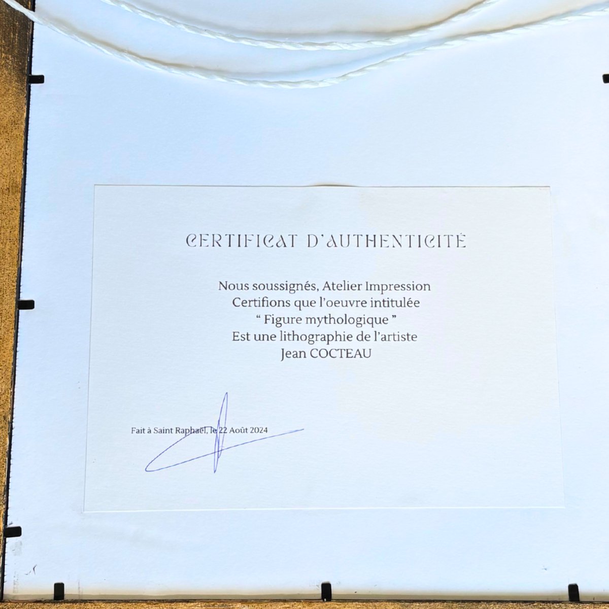 Lleva la firma de Jean Cocteau litografiada en la plancha de la parte inferior derecha.