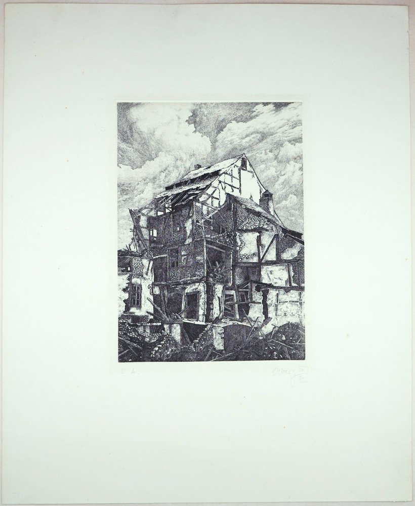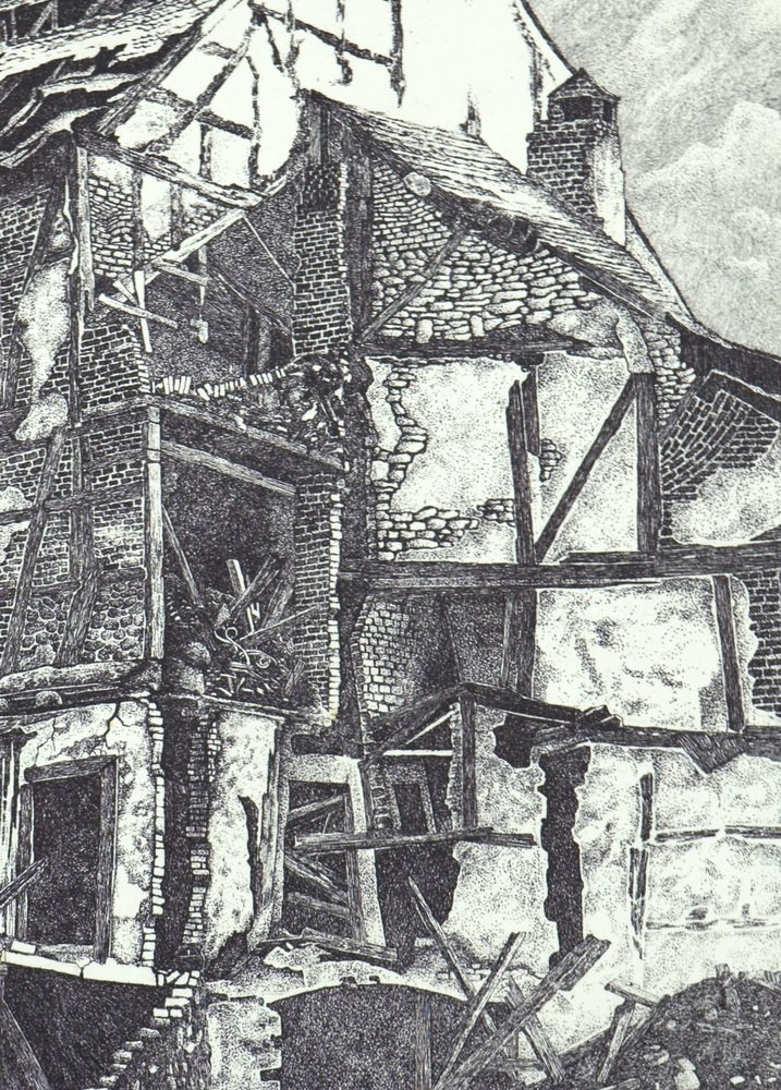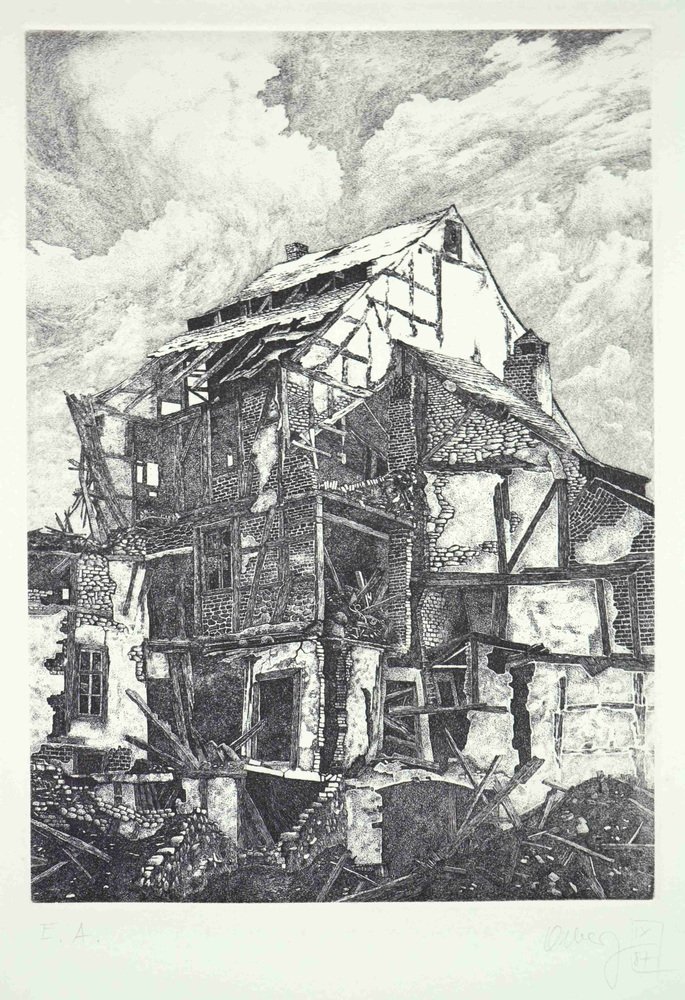 Jörg Olberg Draws here the sum of his artistic study of the berlin ruins, which were still present in the cityscape well into the 80s. with his work "Agony" He Creates to Allegory of Decay. Positioned in the Landscape of Ruins, a Ruined House Grows Before The Viewer, Rising Like the Tower of Babel Into the Sky, Its Roof and Bablel Brightly Illuminated by the Sun. But Already the Roof Shows Mostly Only the Rafters, and as the Gaze is Drawn Further Down, the Building Visibly Disintegrates, The Beams Protruding in All Direction Looking Like Splintered Bones. Slowly But Inexorably - In Agony - The House Will Collapse in On Ittself and Become Nothing More Than The Burial Mound of Itself. At the same time, the small scale stone composition and the plaster form a pattern-like ornamentation of decay.