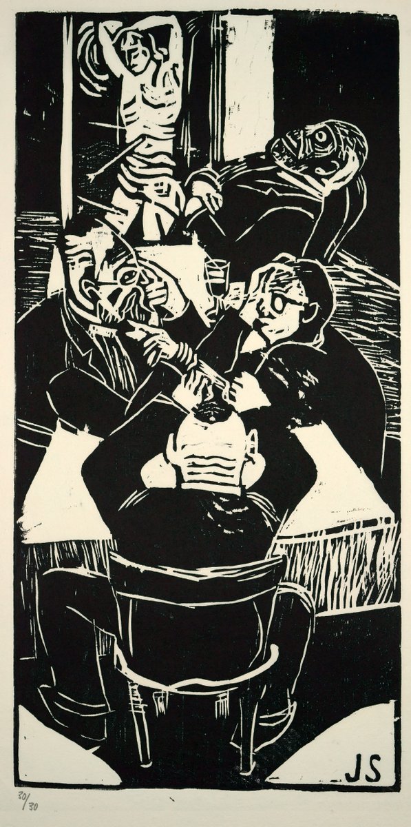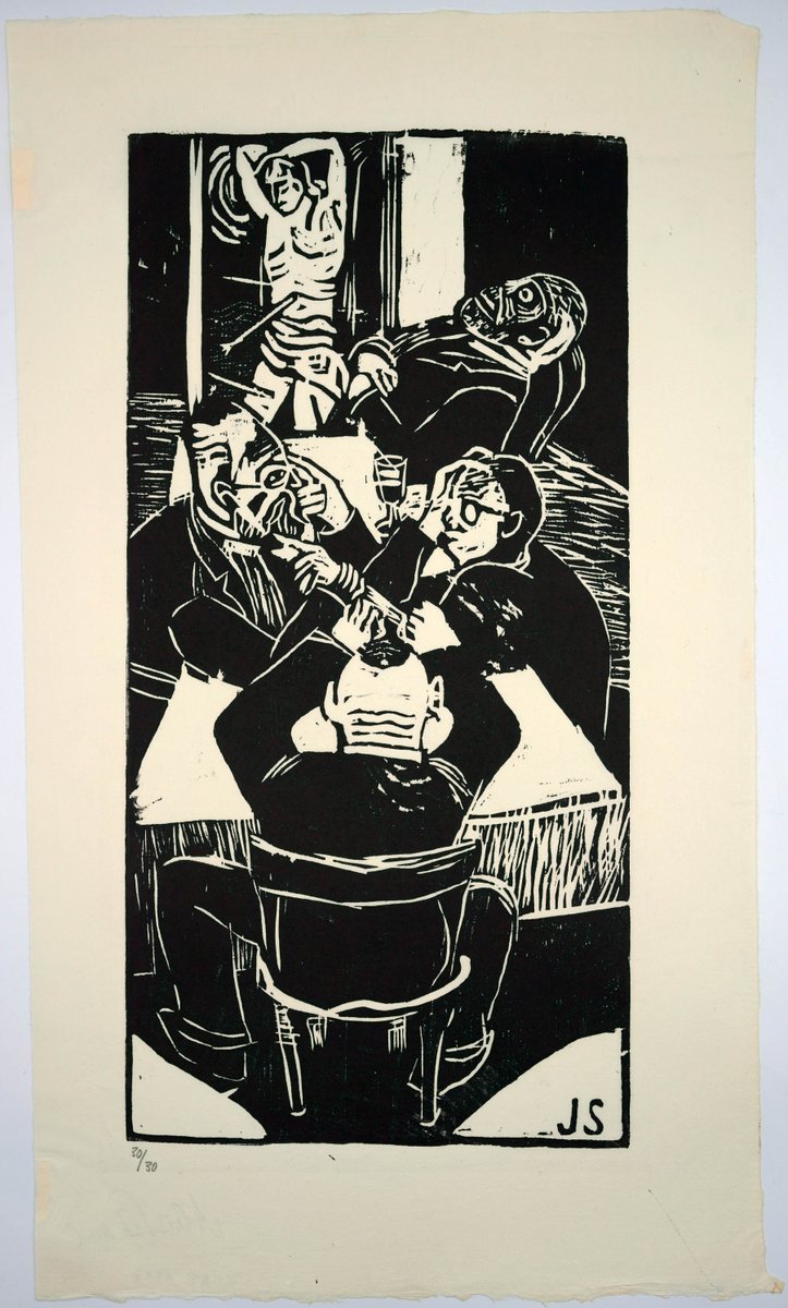 Josef Scharl (1896 Munich - 1954 New York), Mockery, 1935 (1964), Bronner 30 A. Woodcut on Japanese paper, 51.8 x 25.7 cm (image), 65 cm x 37 cm (sheet size), signed lower right in the printing block with the initials “JS”, identified lower left in lead as copy no. 30 / 30 and signed in lead by Alois Scharl on the reverse. This is a reprint from the original printing block made by Galerie Nierendorf in 1964.