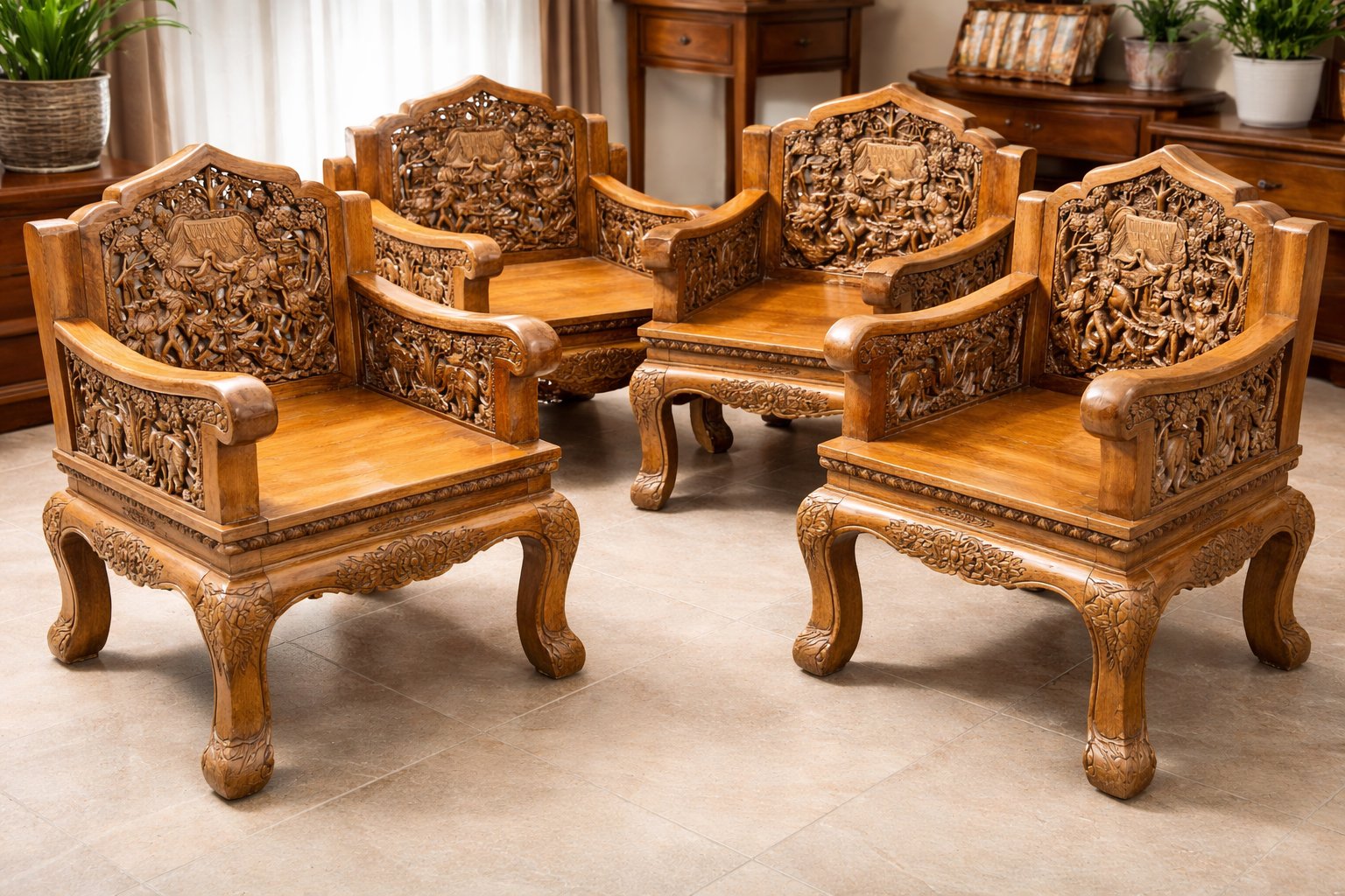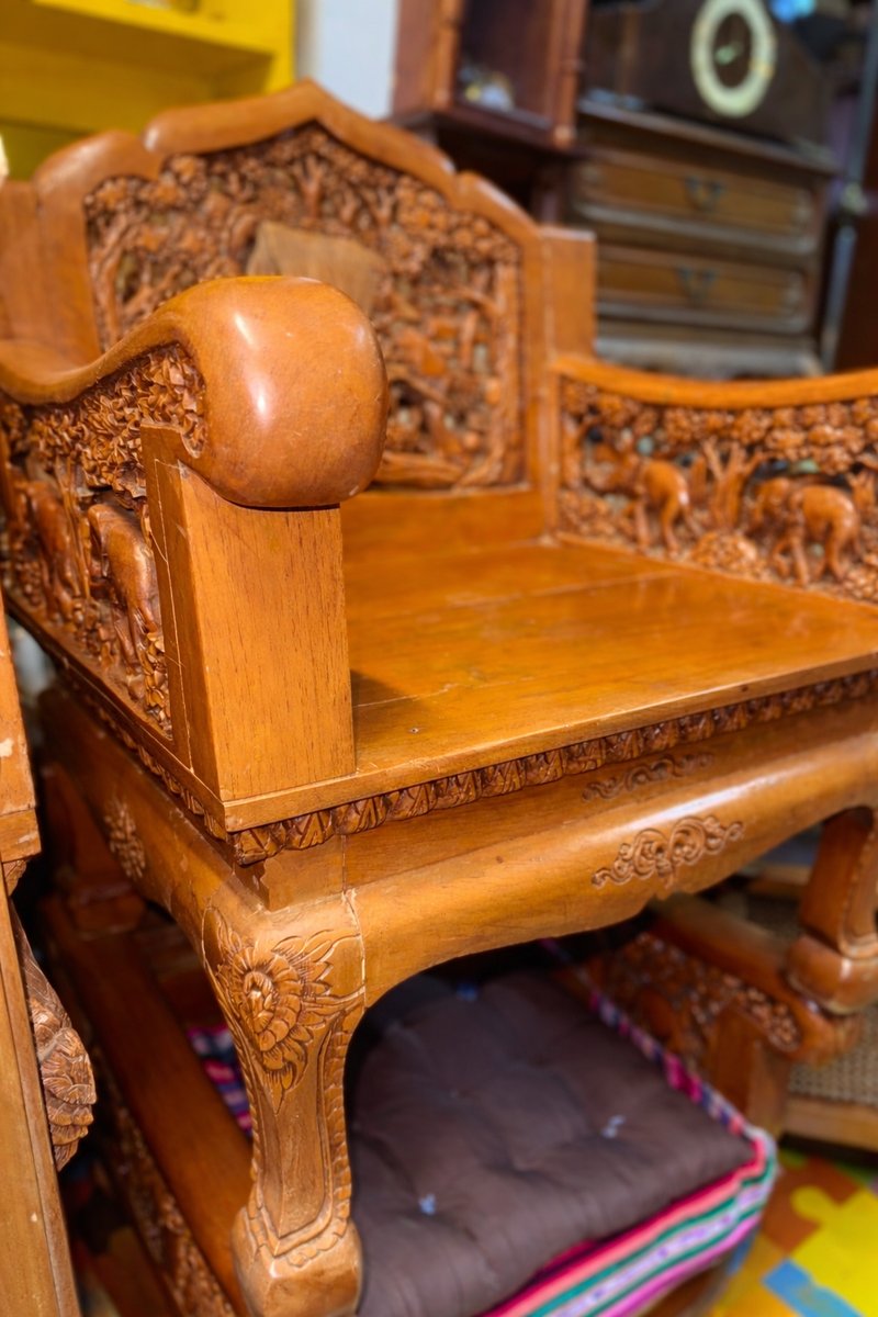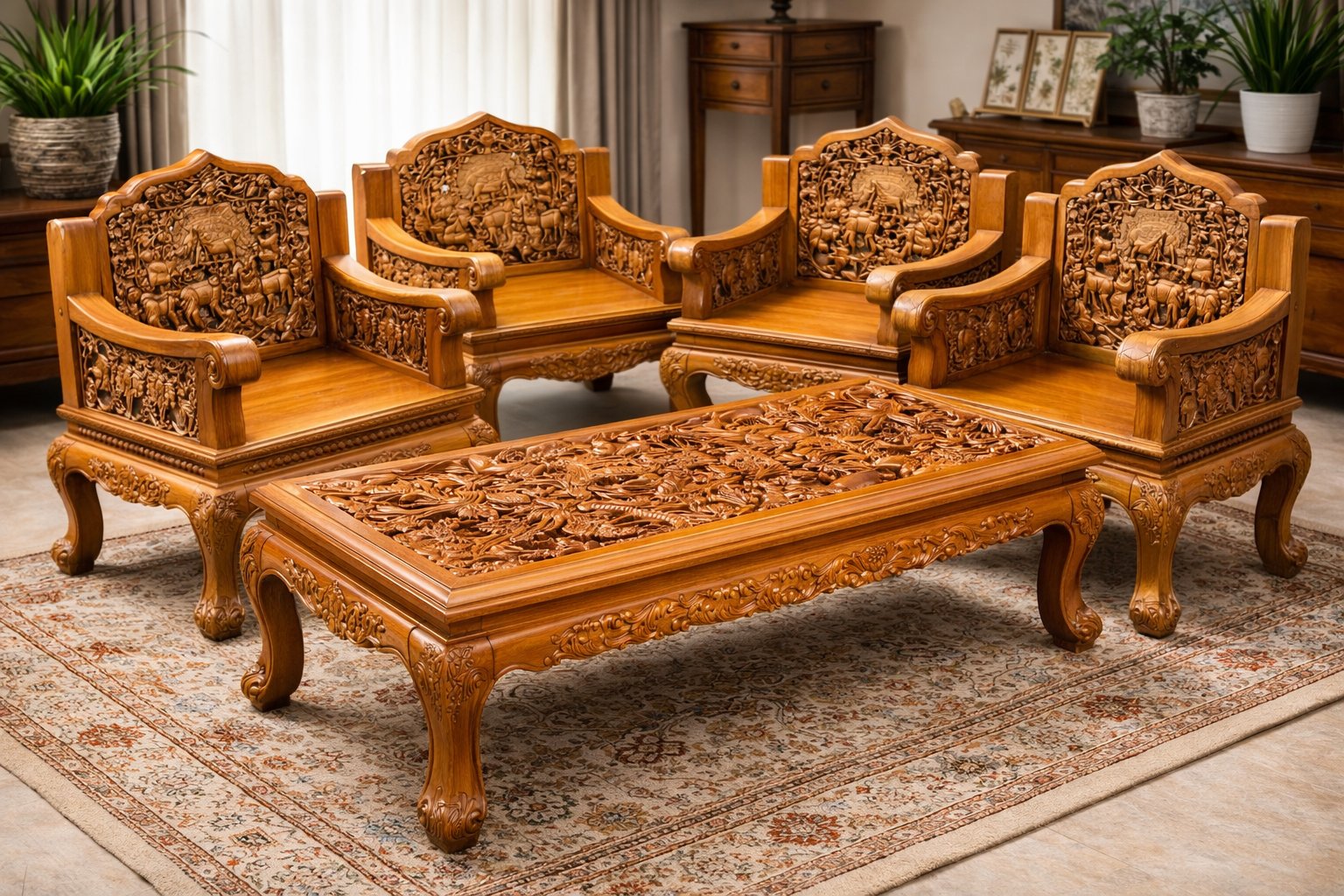 Juego de asientos de madera de teca tallada a mano con mesa de centro, Indonesia, años 70. Juego de 5