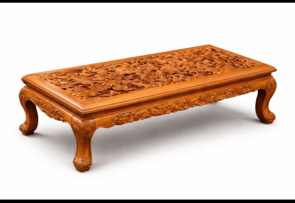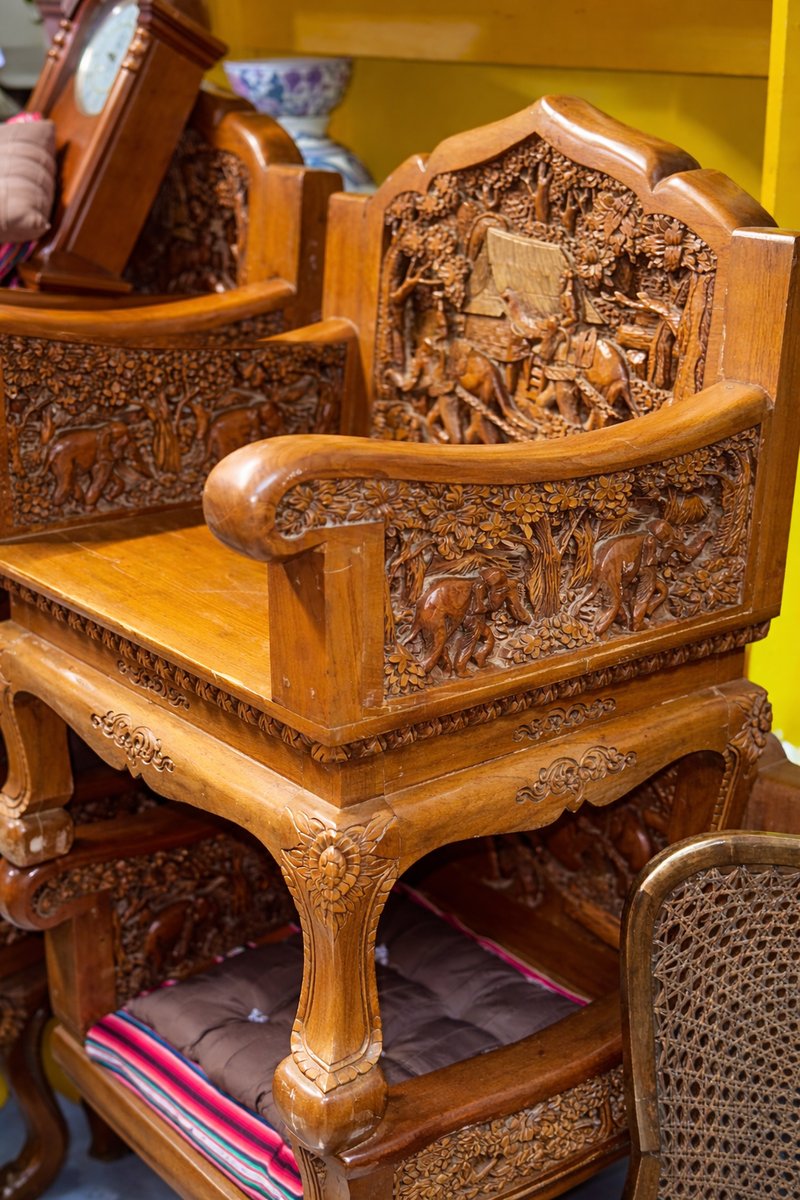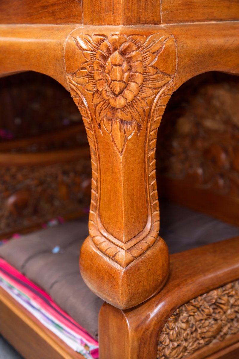 Juego de asientos de madera de teca tallada a mano con mesa de centro, Indonesia, años 70. Juego de 5