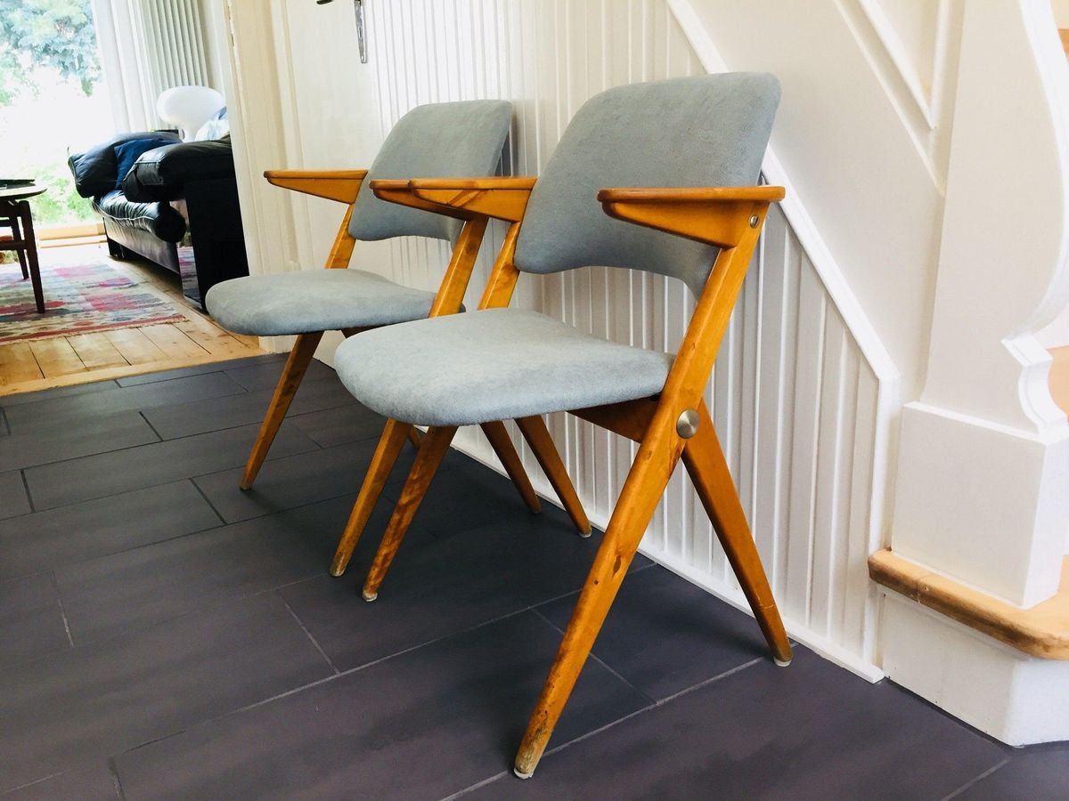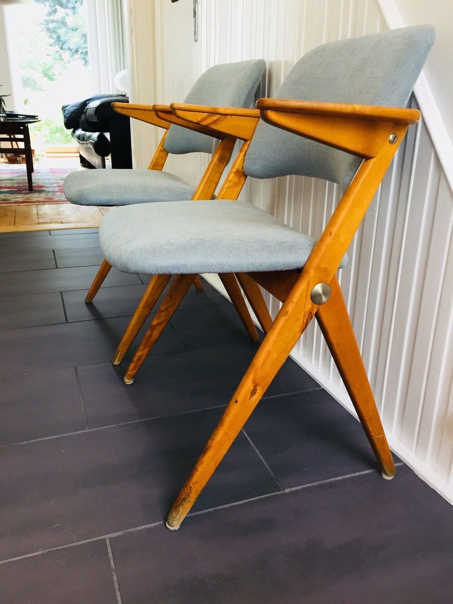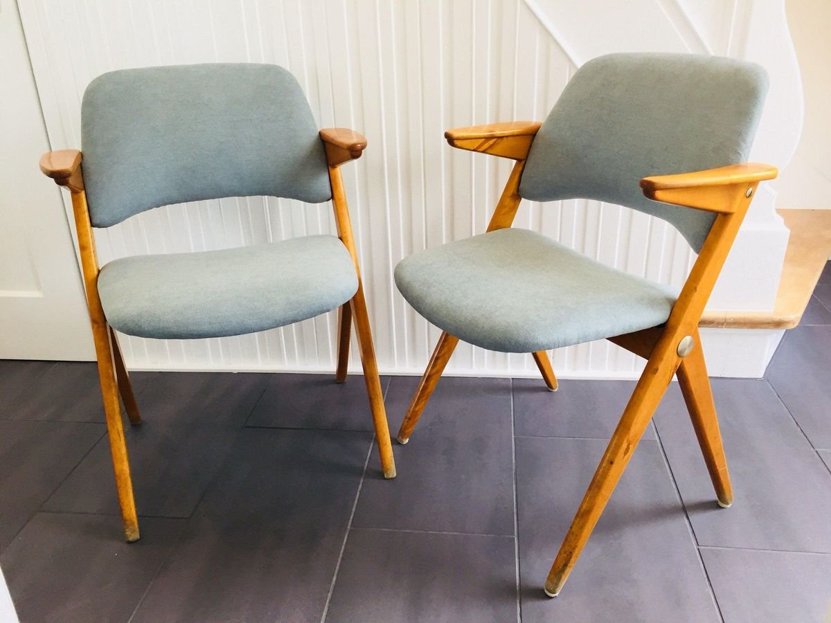 Original 50s 60s! Made in Sweden! Ultra Exclusive! New related! 2x beautiful, ultra rare and original mid century chairs directly from Sweden into your STUGA! Two great retro armrest chairs of the ''Triva'' series in original condition. Extremely rare and hardly ever found in Germany! Therefore here now the unique opportunity... These wonderful chairs were manufactured in the 1950s by designer Bengt Ruda for the Nordiska companyt and today represent absolute design classics of the Scandinavian, especially the Swedish mid-century design. Similar to the design icons of the building house, their designs were groundbreaking for the coming decades. The material of the chairs is lacquered, solid and beautifully marbled beech wood with newly-upholstered mint green-light blue seat surfaces. Overall very stable and super cozy. Perfect design paired with optimum utility value. Really unbelievable great chairs that complement your STUGA perfectly. Fit great for Danish teak furniture and the straight forms of the 50s and 60s. Height approx. 74 cm Seat height approx. 45 cm Width about 56 cm Traces of use on the wood, especially on the legs, are naturally present.