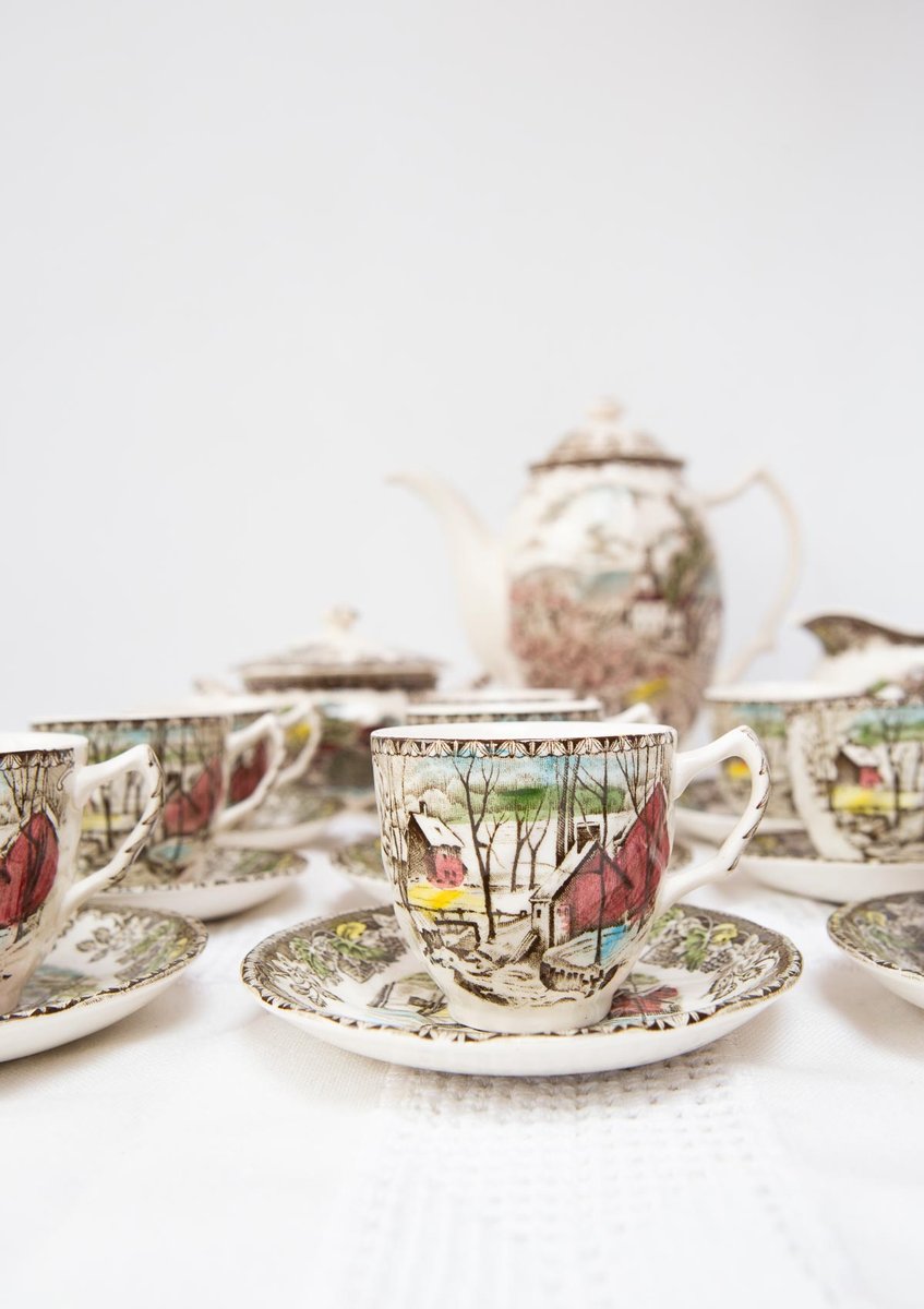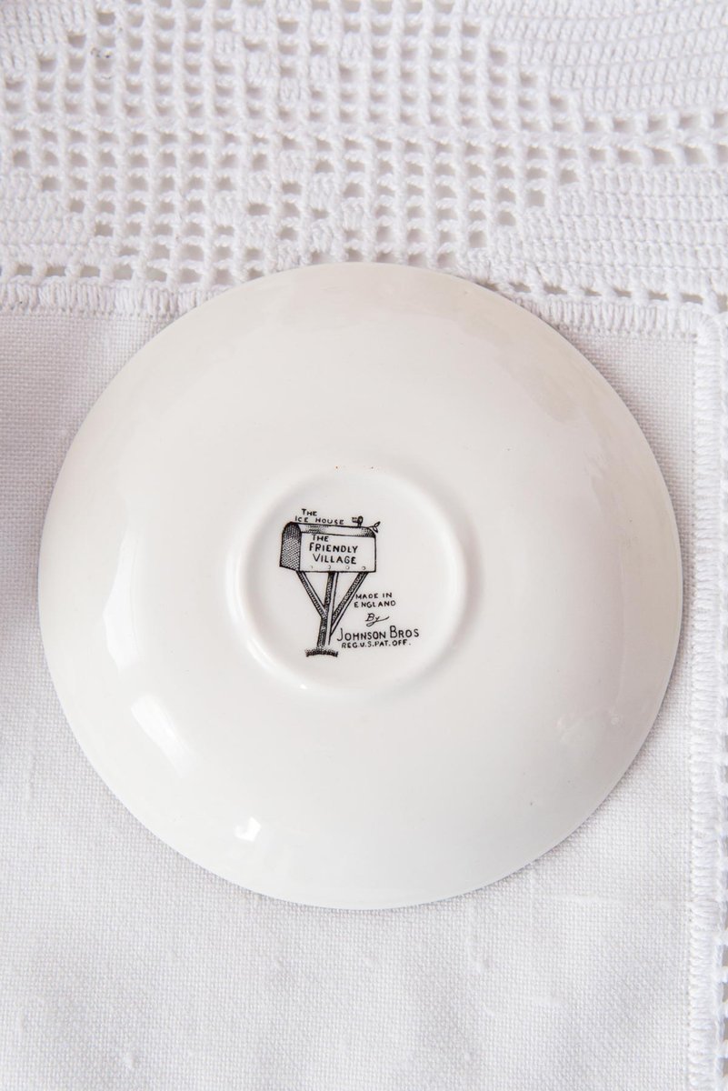 Excepcional juego de café inglés para 12 personas del renombrado fabricante Johnson Bros (Staffordshire, Inglaterra), de la famosa serie "The Friendly Village", una de las más queridas de su producción, con varias escenas diferentes. Las tazas representan "The Ice House", el azucarero "The Old Mill" y la cafetera "The Village Green" El juego consta de las 27 piezas siguientes: