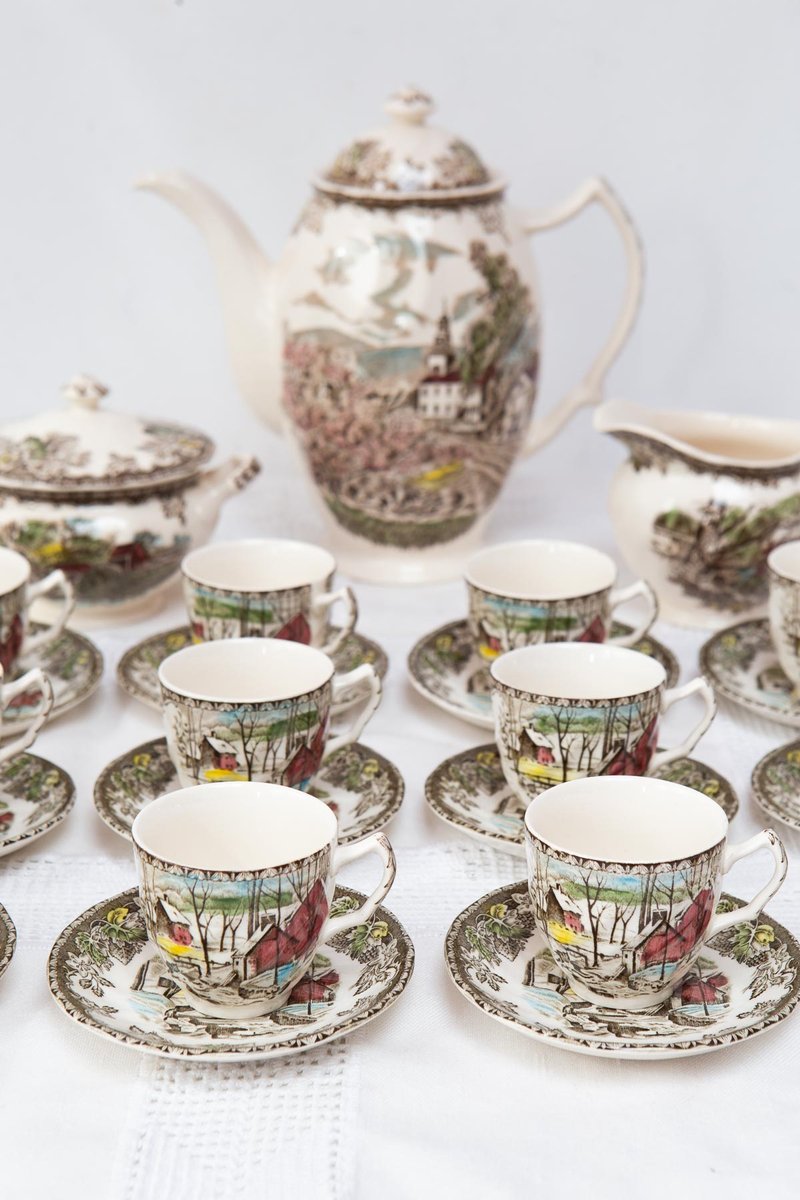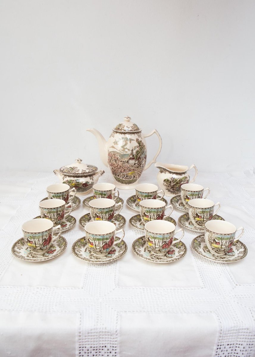 Exceptional English coffee set for 12 by the renowned maker Johnson Bros (Staffordshire, England), from the famous “The Friendly Village” series — one of the most beloved in their production, featuring several different scenes. The cups depict “The Ice House,” the sugar bowl features “The Old Mill,” and the coffee pot shows “The Village Green.” The set consists of the following 27 pieces: