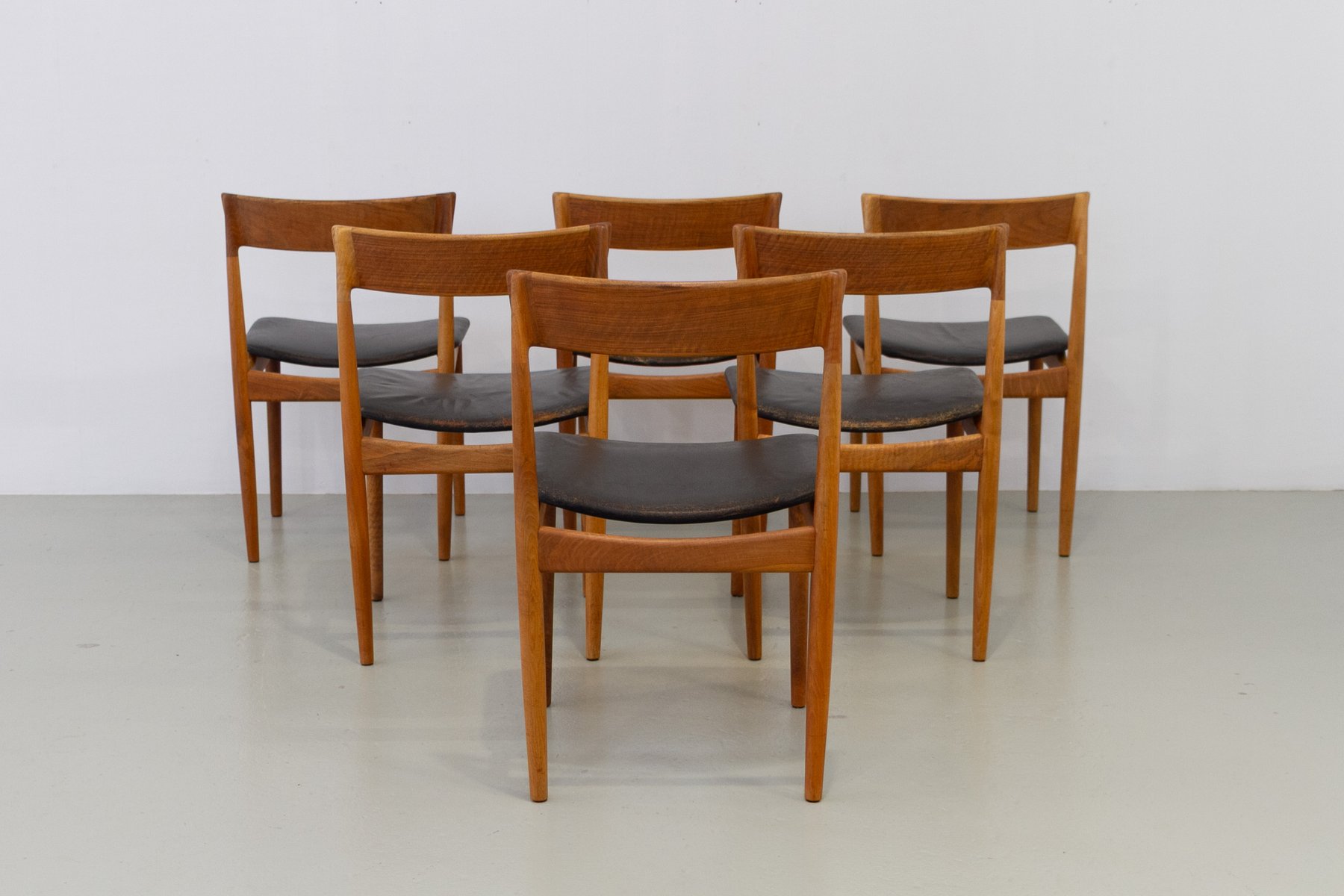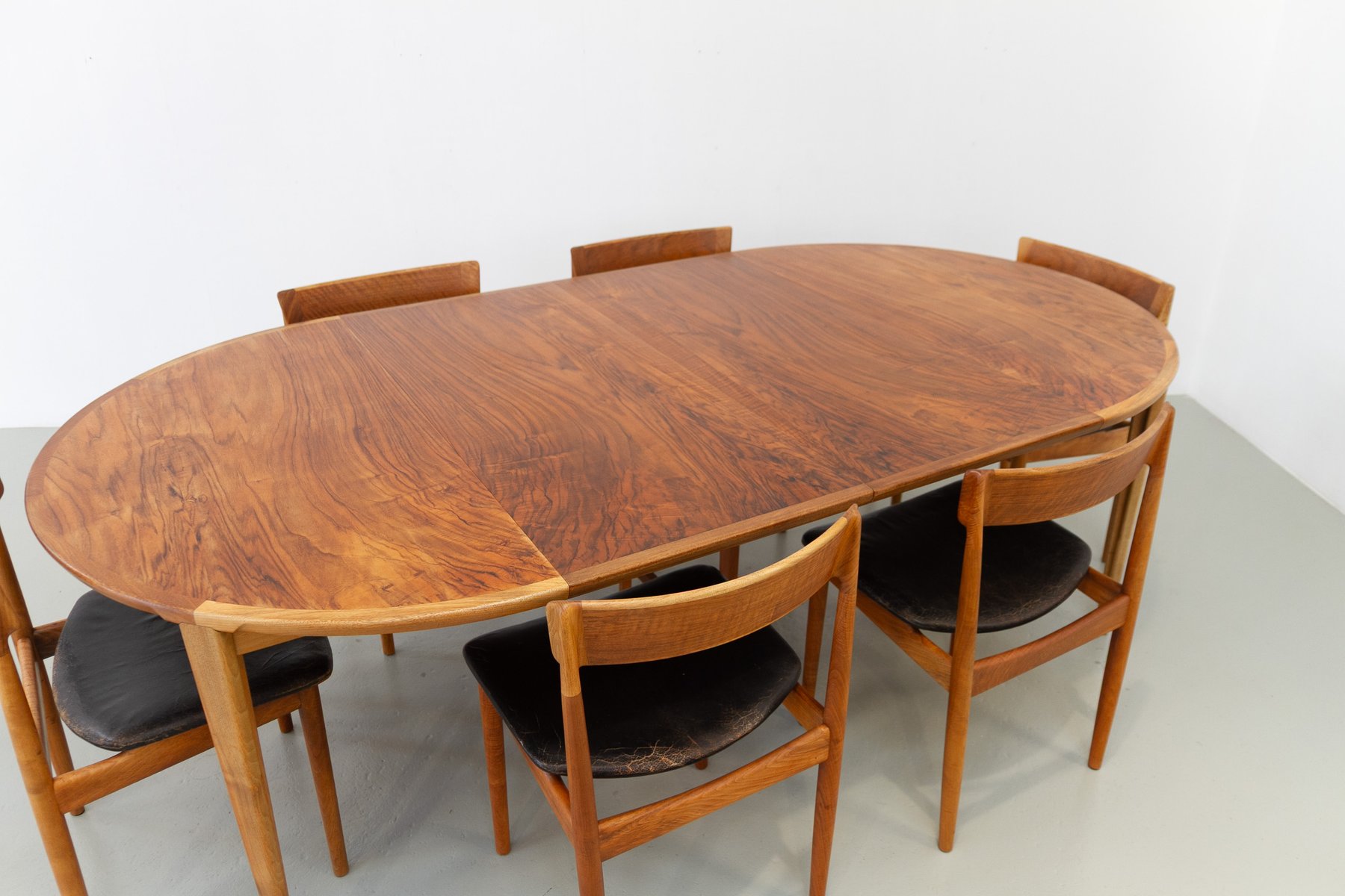 Raro y antiguo juego de comedor en nogal vivo y expresivo con muchos tonos claros. Diseñado por Henry Rosengren Hansen en 1960 y fabricado por Brande Møbelindustri/Møbelfabrik, Dinamarca. Este increíble juego fue adquirido en 1961 y solo ha tenido un propietario. La mesa redonda tiene tres alas extensibles y las seis sillas a juego, modelo 39, tienen tapicería de cuero original.