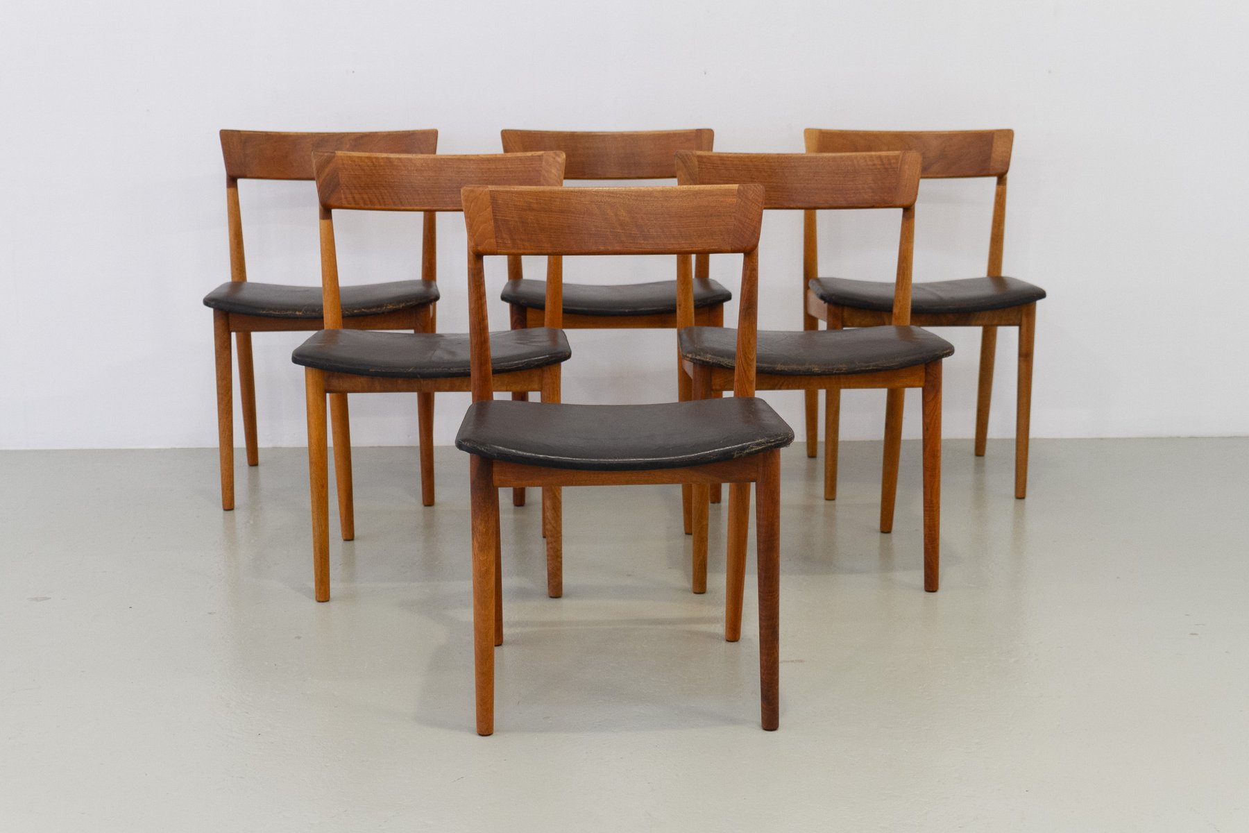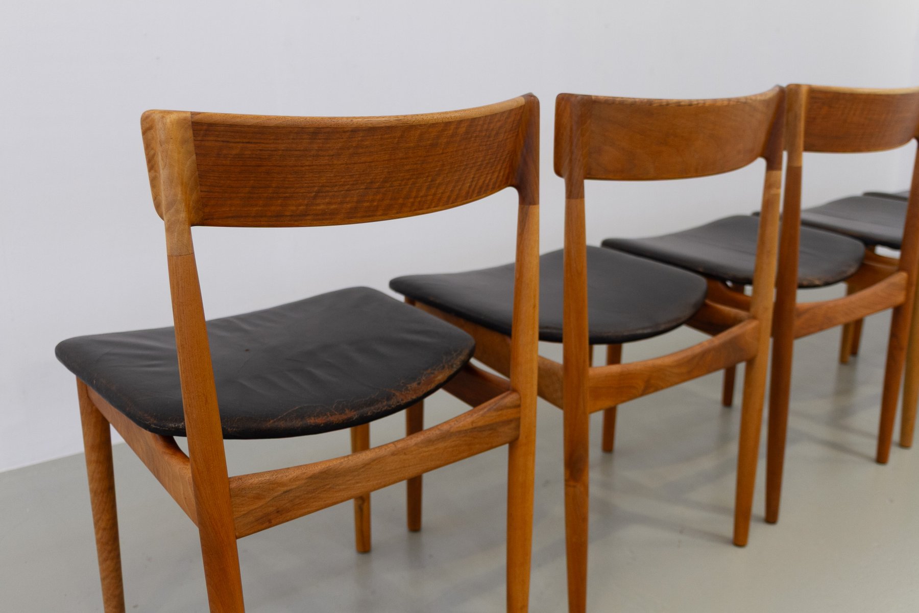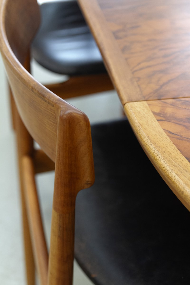 The accompanying chairs echo the table’s warm materiality and understated design. Made in matching walnut, they feature gently curved backrests that offer ergonomic support without visual heaviness. The seats are upholstered in black leather, providing a subtle contrast to the wood and adding comfort and durability. Together, the table and chairs form a cohesive, timeless ensemble that reflects Rosengren Hansen’s mastery of proportion, joinery, and practical design, characteristic of high-quality Danish furniture from the mid-20th century.