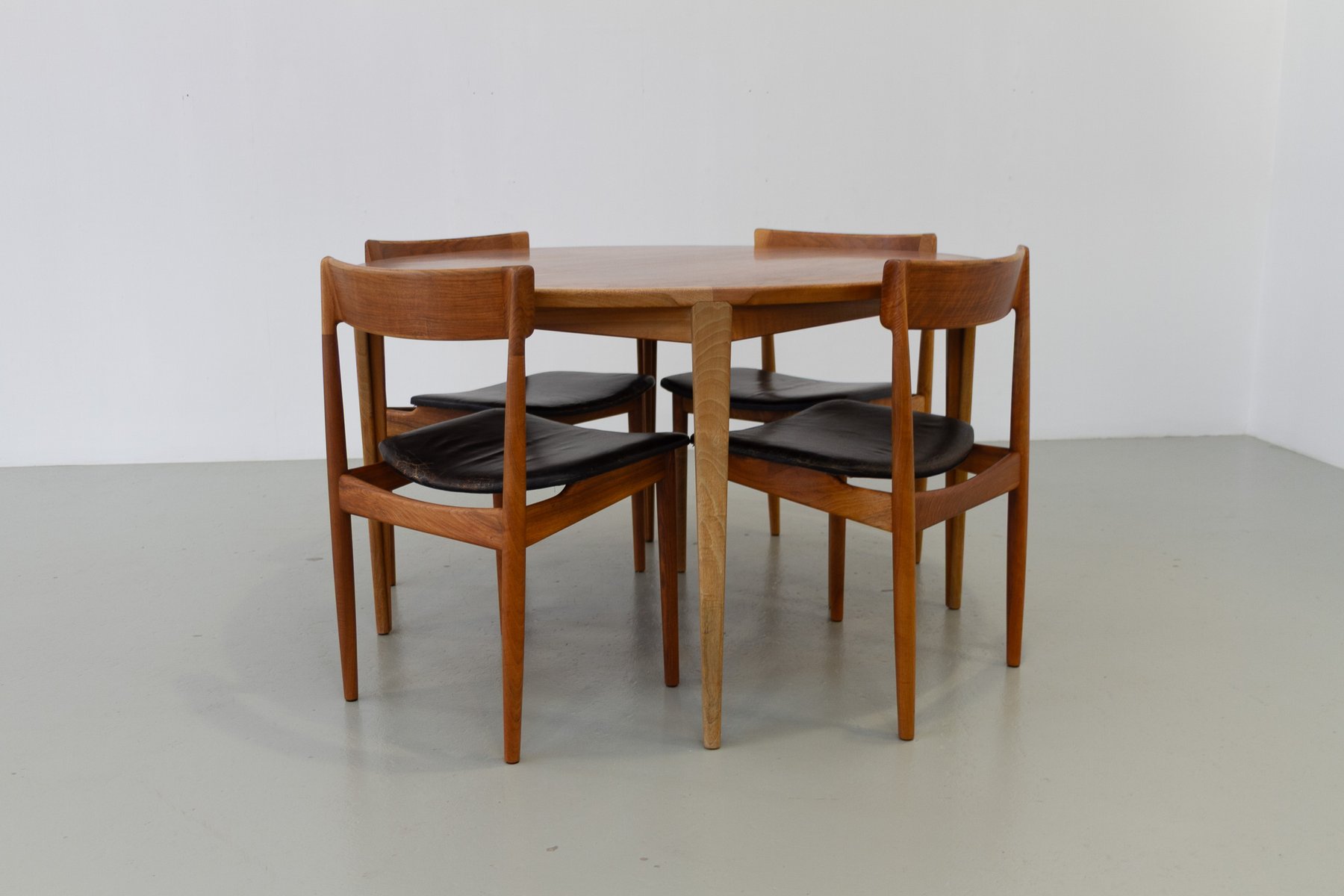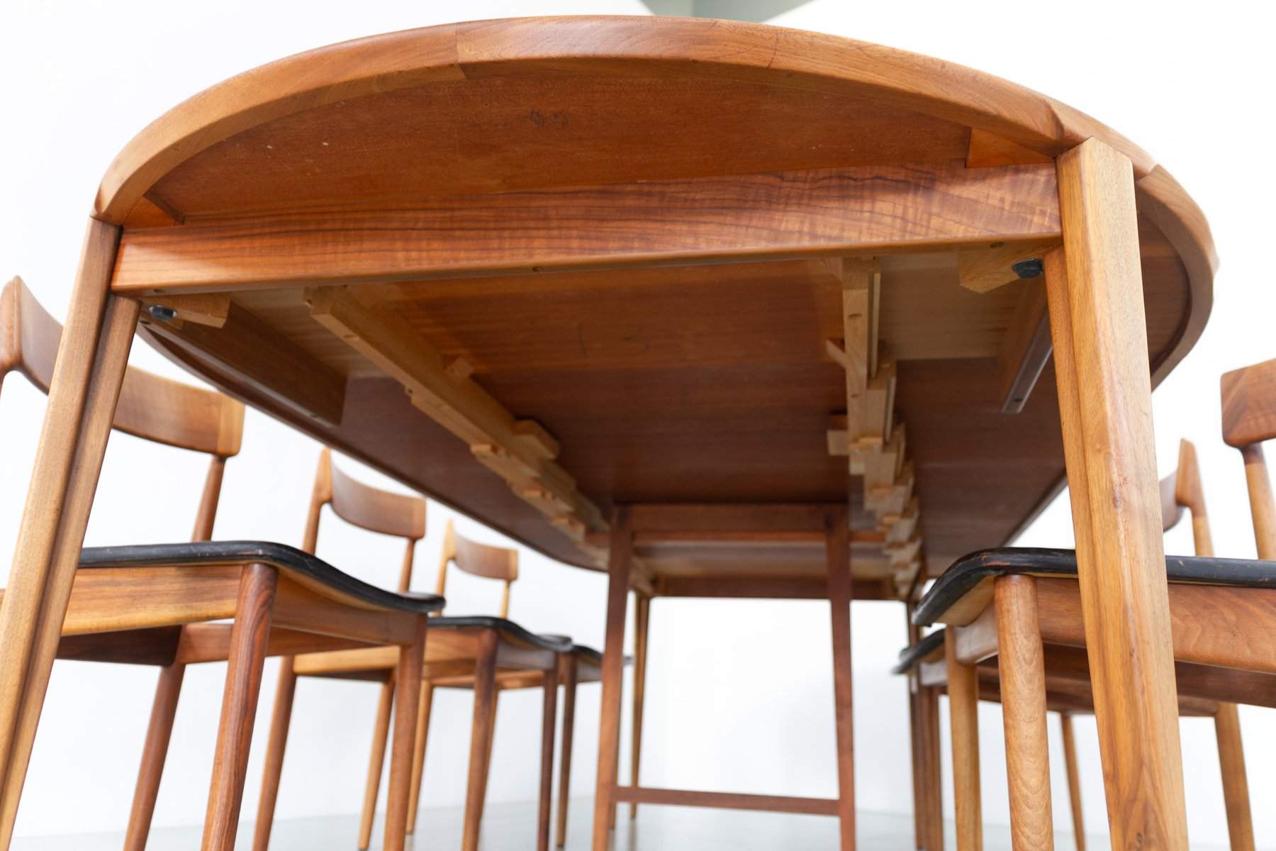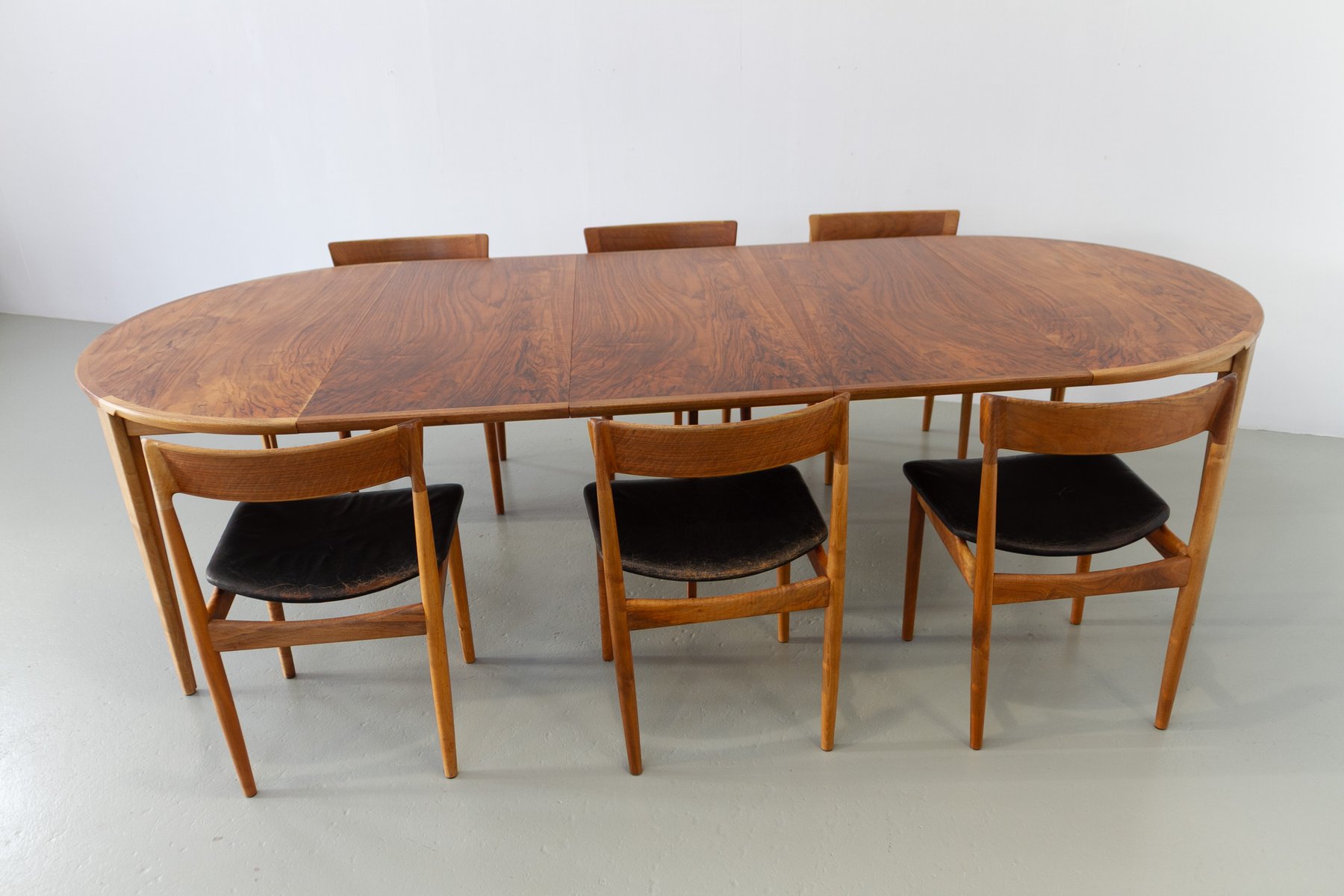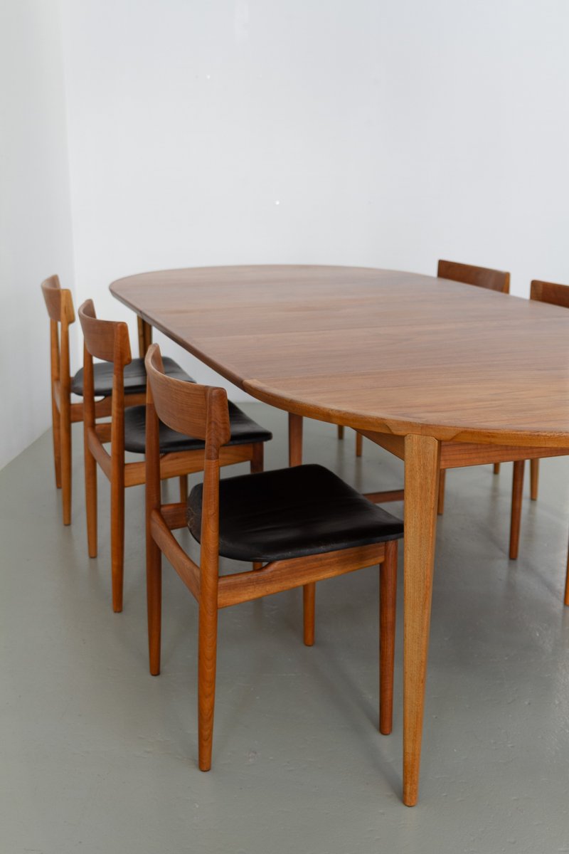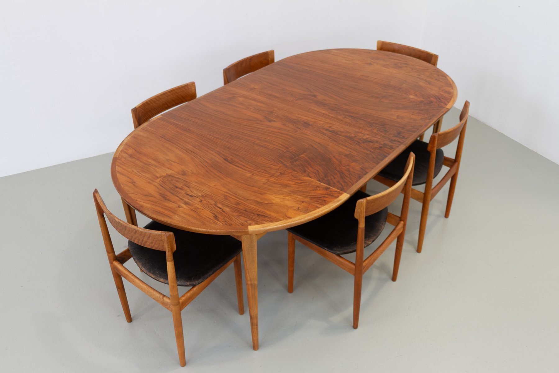 This iconic dining set by Henry Rosengren Hansen exemplifies refined Scandinavian modernism, combining elegance, functionality, and fine craftsmanship. The table is crafted in richly grained walnut veneer, with a softly rounded oval form that can be reconfigured into a compact circular table or extended to accommodate larger gatherings. The extension system is discreet and well-integrated, the additional leaves sliding smoothly into place, maintaining the table’s clean lines and balanced proportions. Tapered legs in solid wood give the table a light, architectural presence while providing excellent stability. Extra stability is provided by the drop down leg which is released when the table is extended.