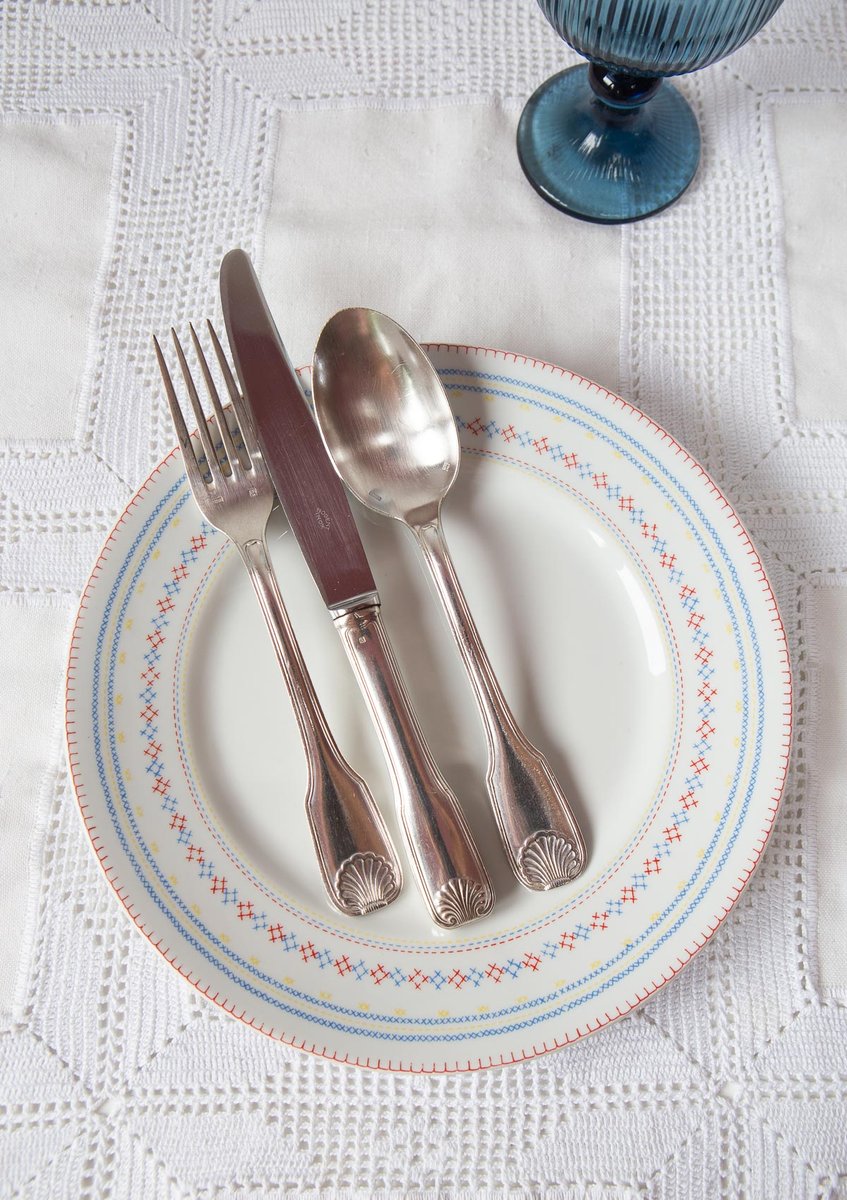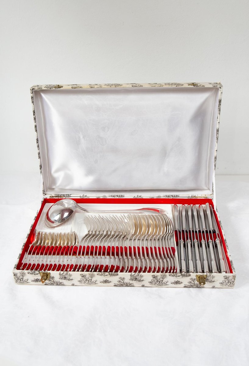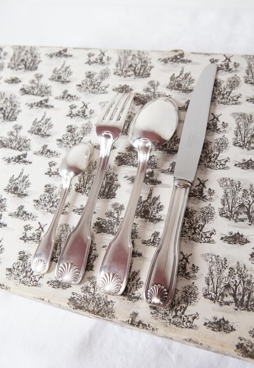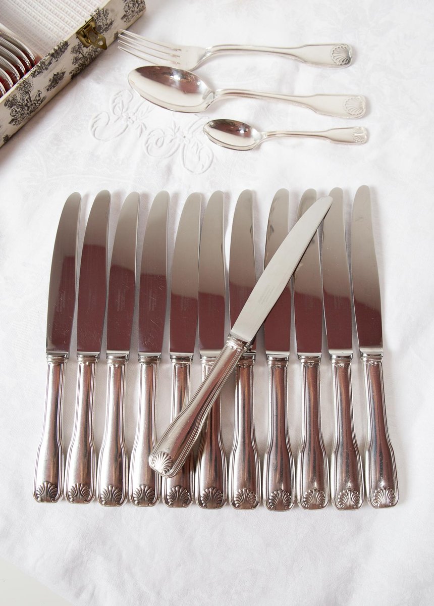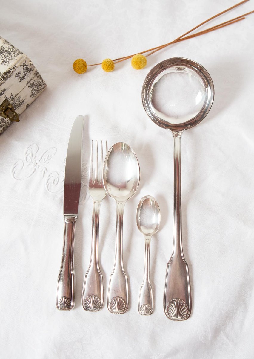 Cubertería francesa para 12 personas de la prestigiosa firma François Frionnet, de estilo Luis XV con un delicado motivo de concha o coquille en las asas. El diseño aparece en ambas caras. Realizado en metal plateado (84 g de baño de plata). Estuche mostrado en las fotos incluido.