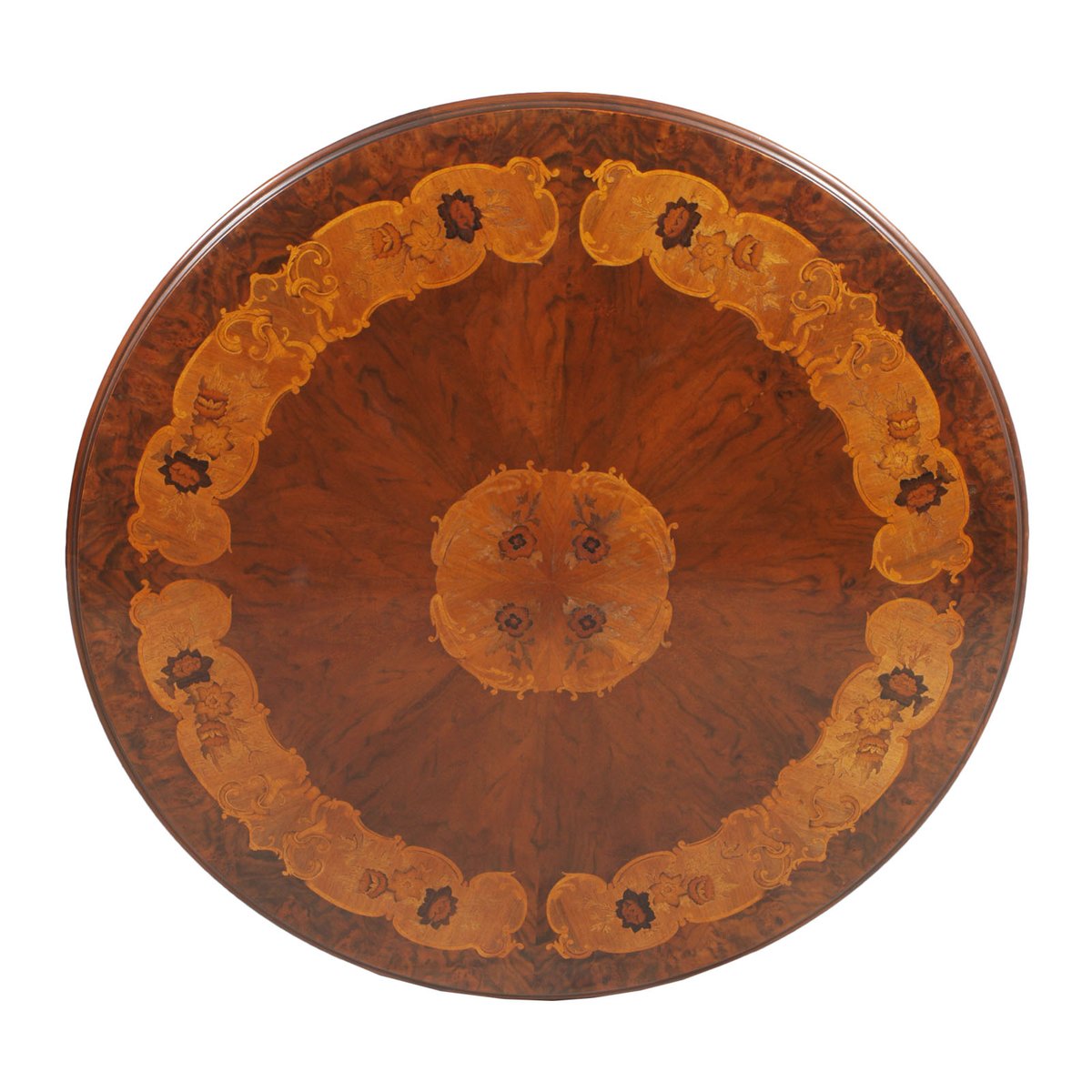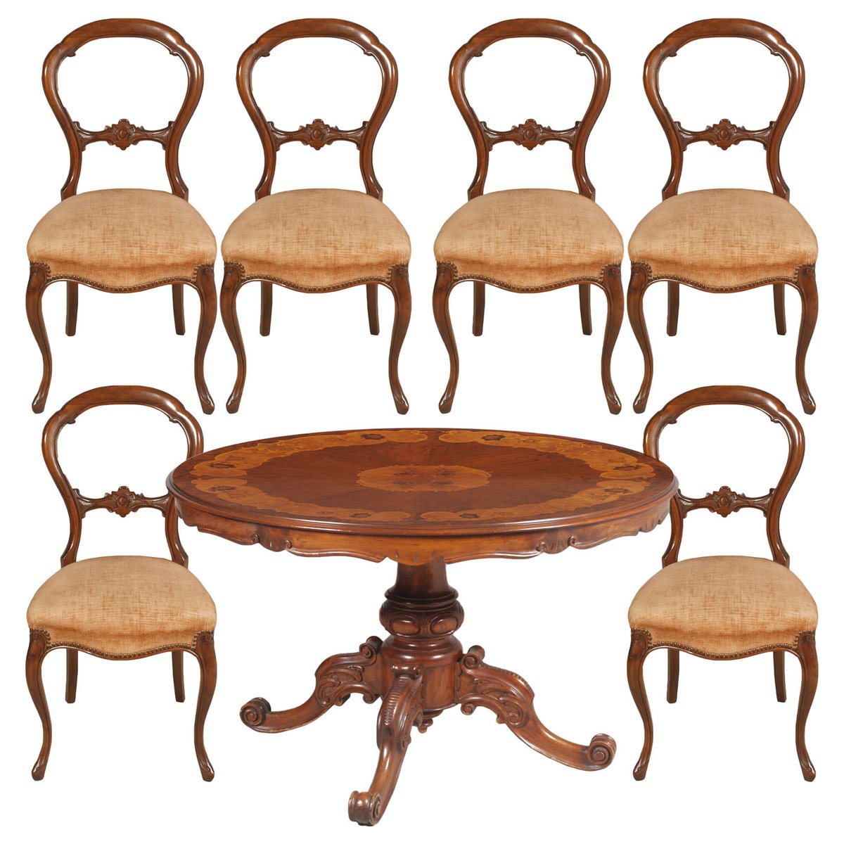 Exquisite refined Baroque Revival Sorrento inlaid and carved walnut round table with six baroque walnut chairs, hand carved.