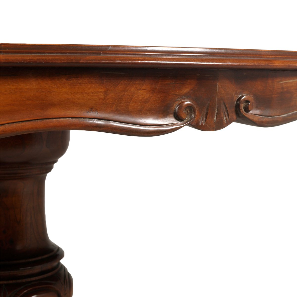 Exquisita y refinada mesa redonda Sorrento de renacimiento barroco con incrustaciones y tallado de nogal y seis sillas barrocas de nogal, talladas a mano.