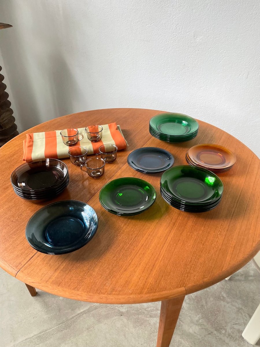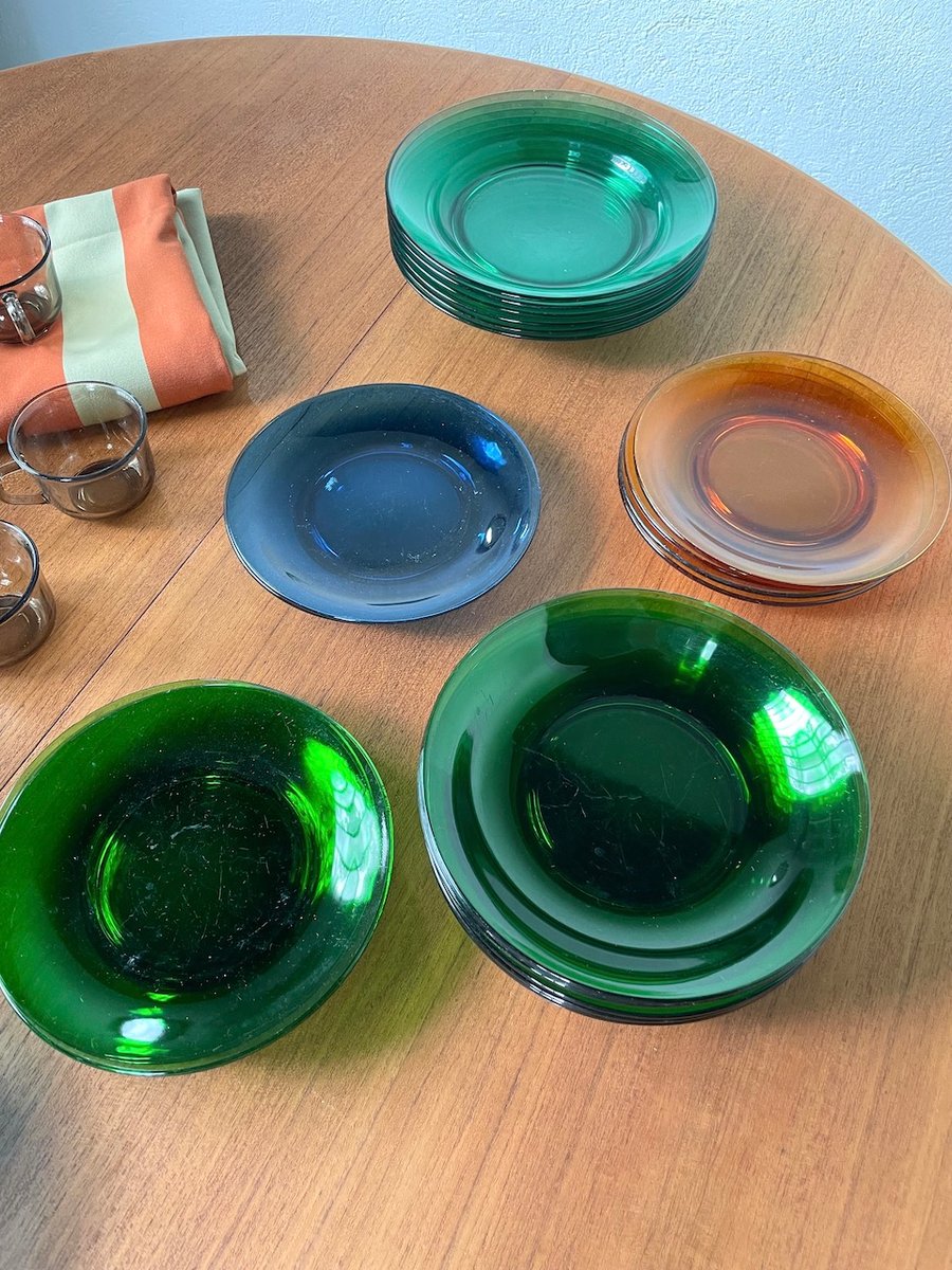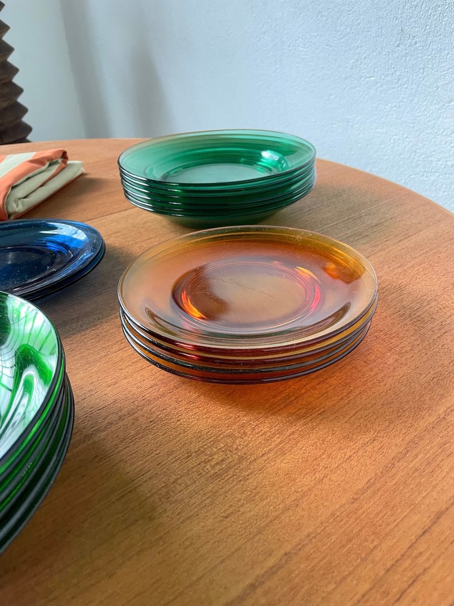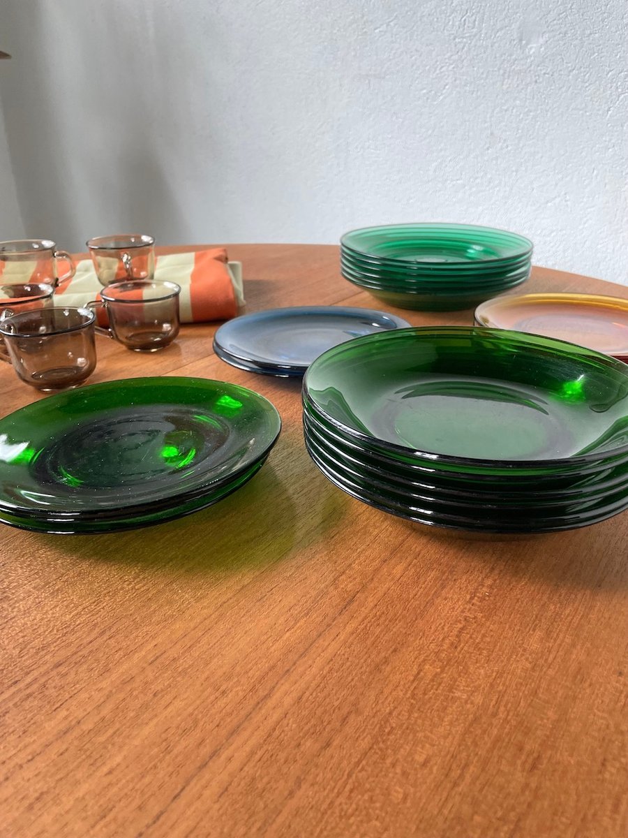 Set consisting of large plates, soup plates, dessert plates and cups in transparent, mass-tinted glass from the Duralex brand.
