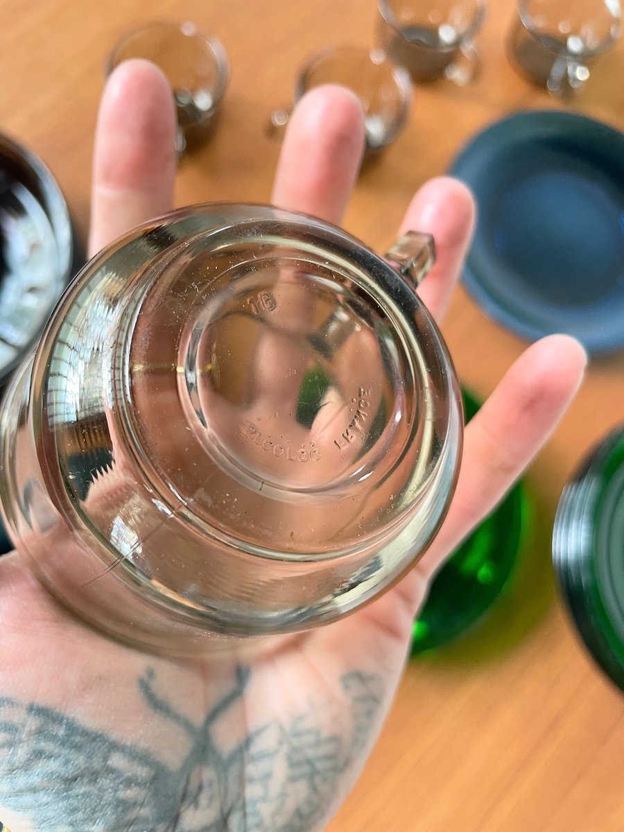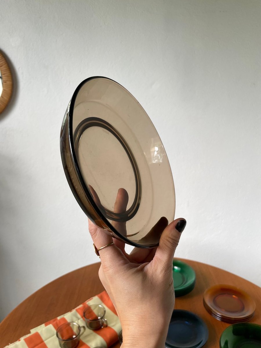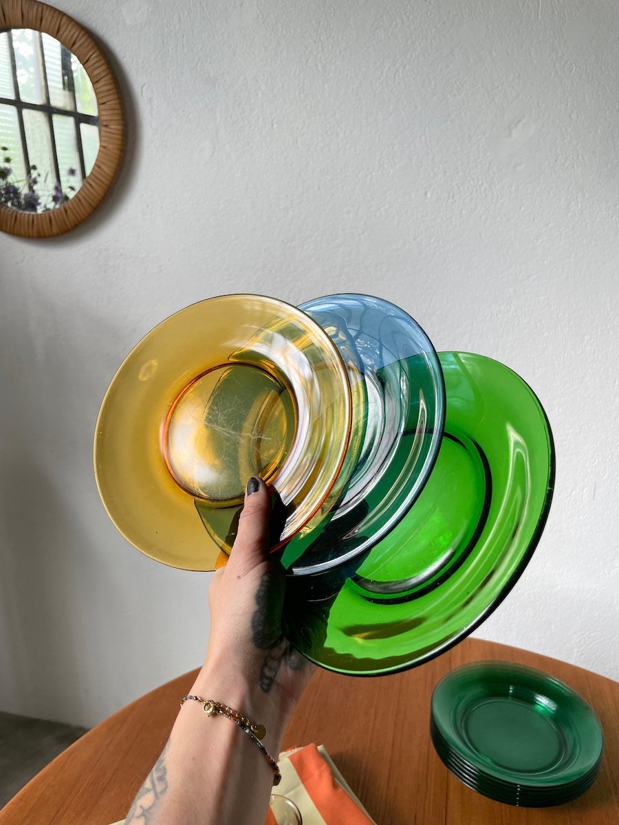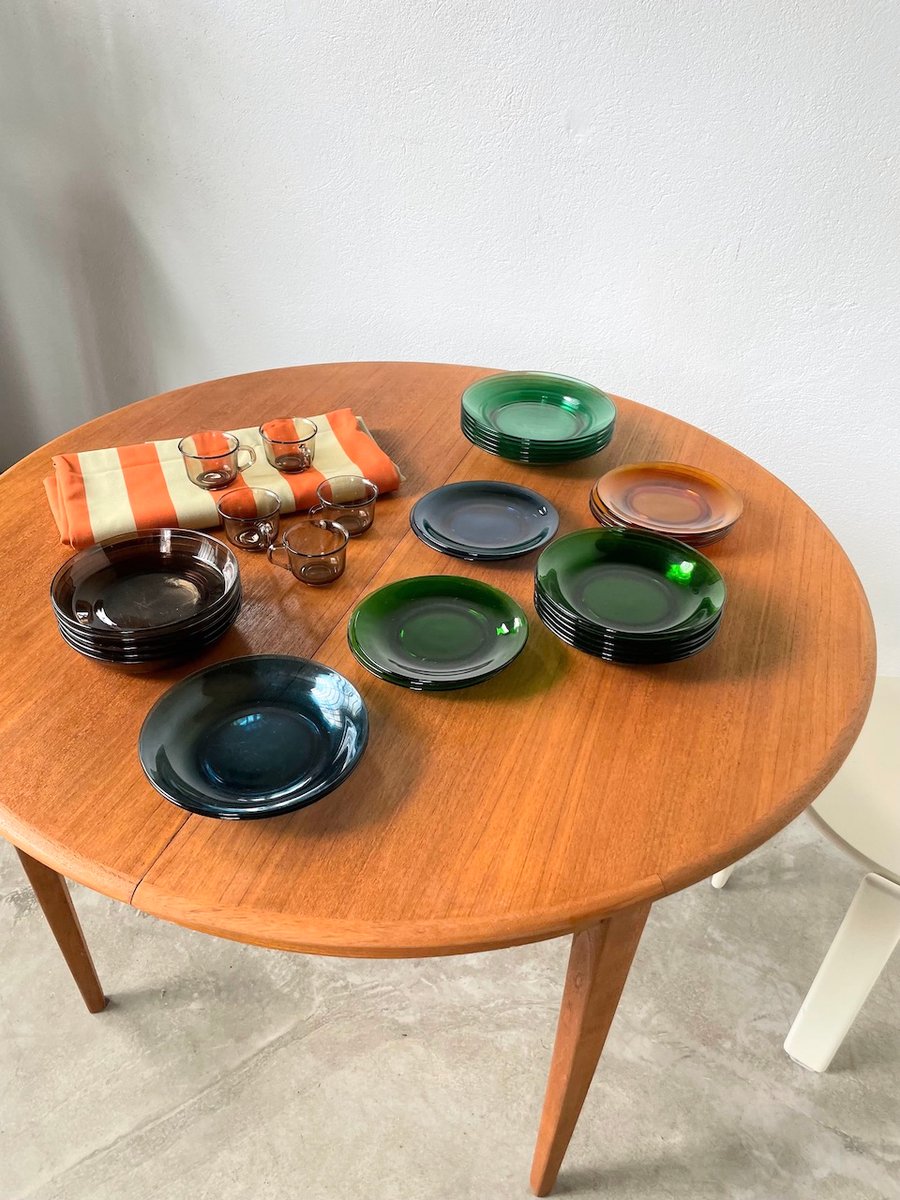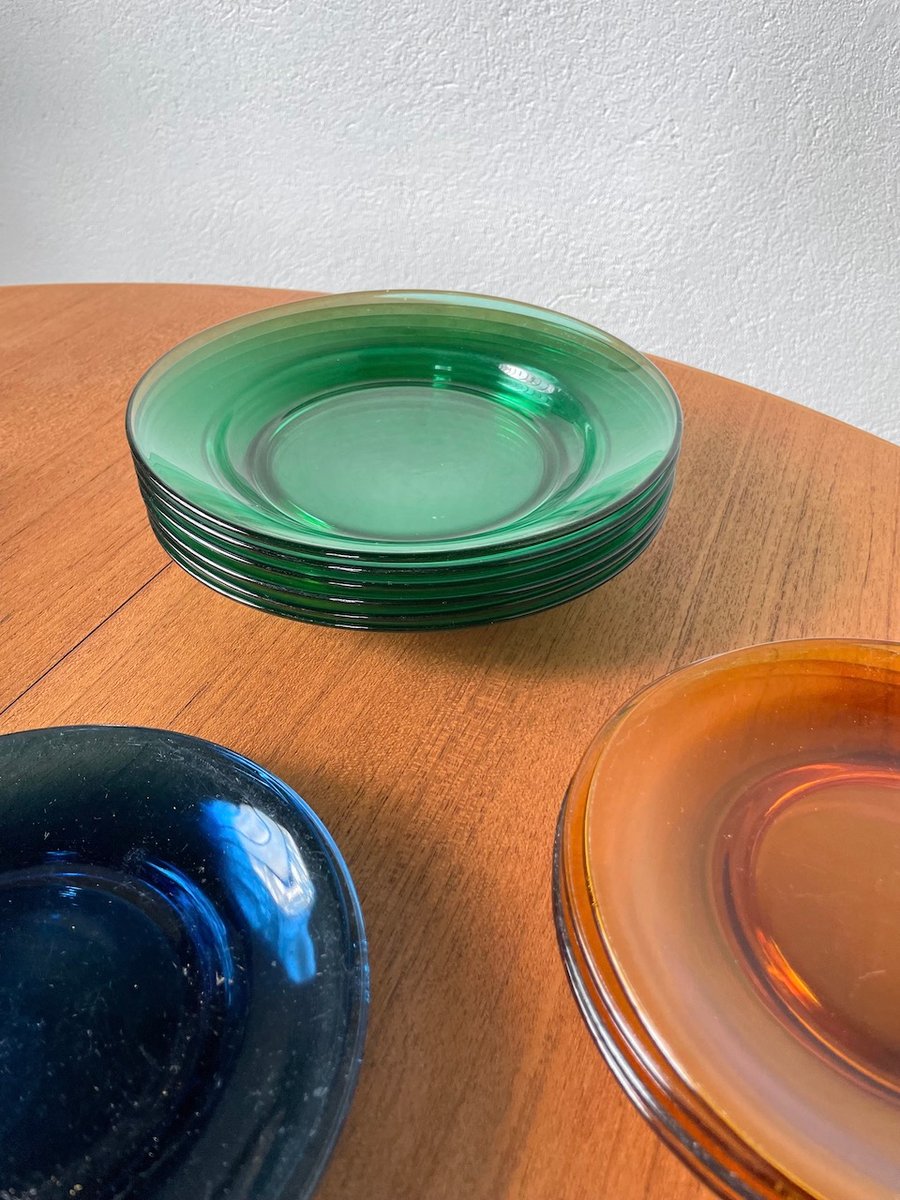Set consisting of large plates, soup plates, dessert plates and cups in transparent, mass-tinted glass from the Duralex brand.
