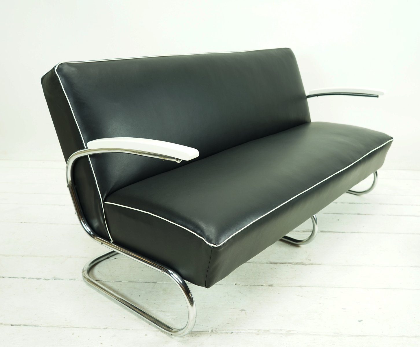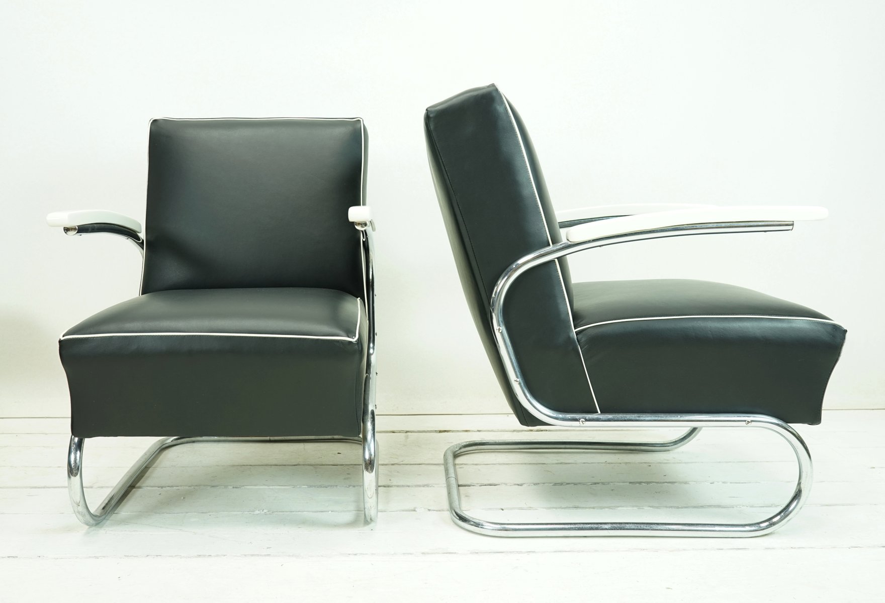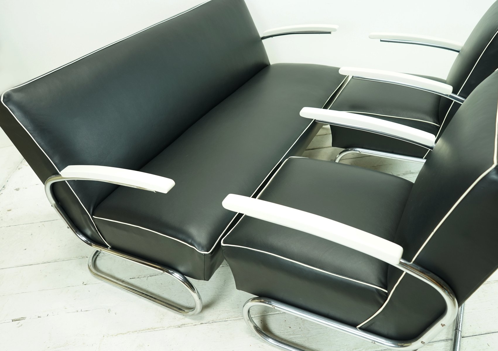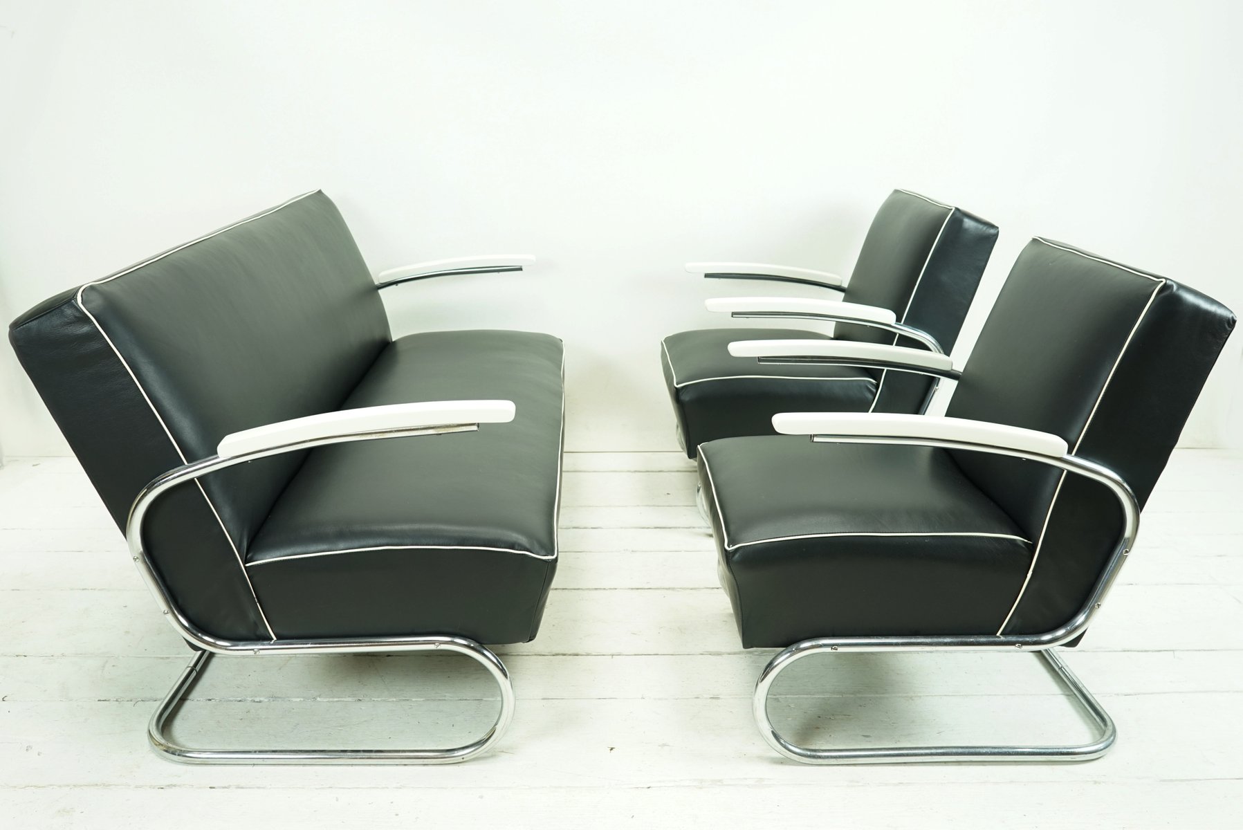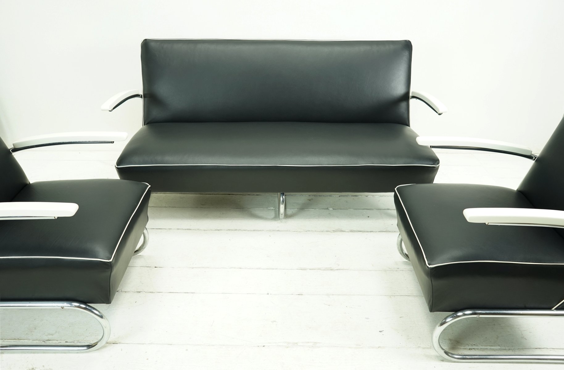 Juego de sofá y butaca Cantilever de cuero napa negro de Mücke Melder, años 30. Juego de 3