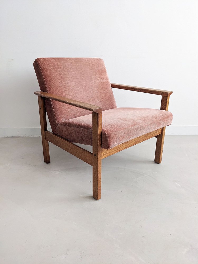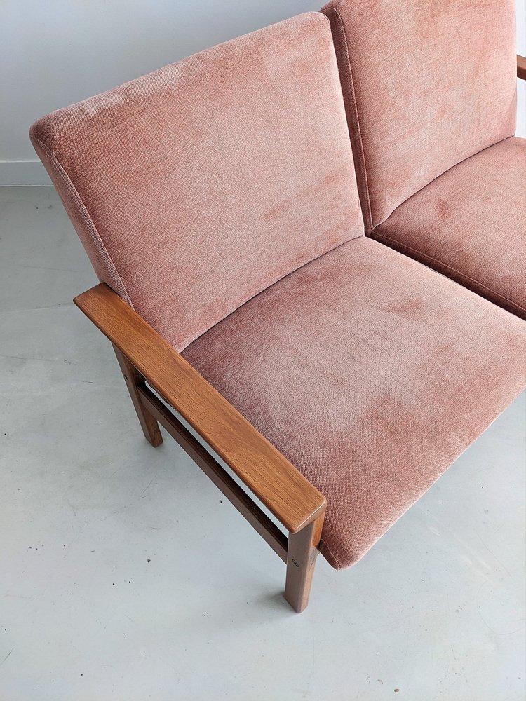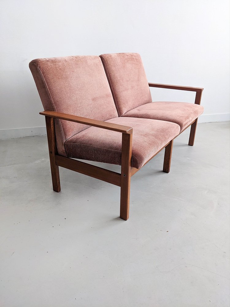 Conjunto de tres plazas, sofá de dos plazas y sillón, diseñado por Yngve Ekström para Pastoe. Este conjunto FU05 data de los años 1950-1960 y conserva su tapizado original de terciopelo rosa, que está en fabuloso estado. La madera utilizada para los reposabrazos y el respaldo es de teca. El diseño es sencillo pero refinado, y el suave color "rosa sucio", casi salmón, le confiere un aspecto original y único.