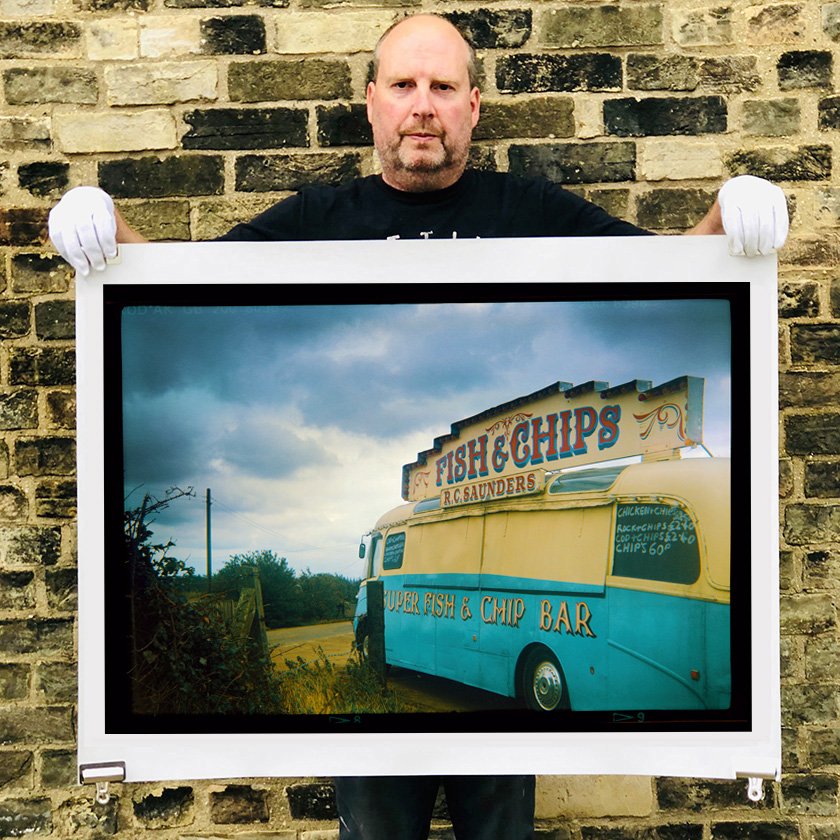 A moody Fenland sky is backdrop to a classic British fish & chips van, photographed in Haddenham. The typography and the van itself have a fun fairground feel, contrary to the muted tones of this artwork. Part of Richard Heeps series, 'A View of the Fens from the Car with Wings'.