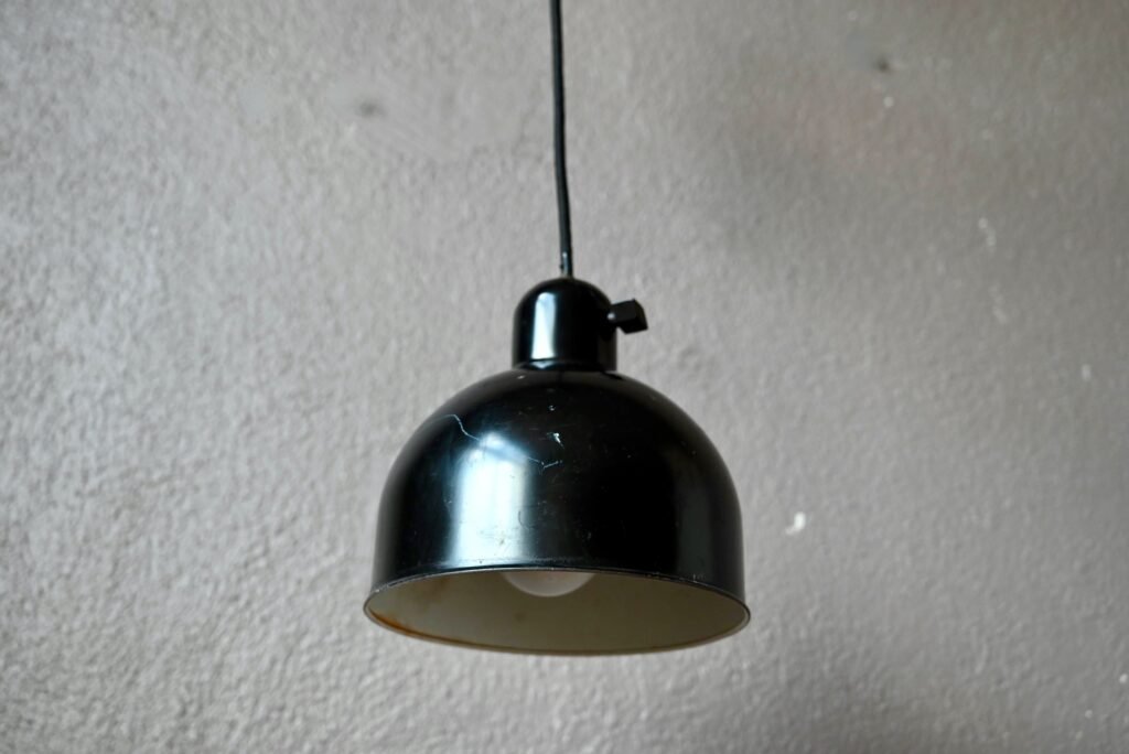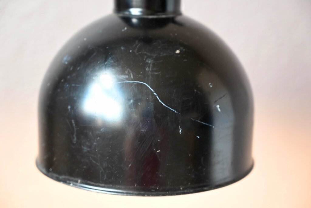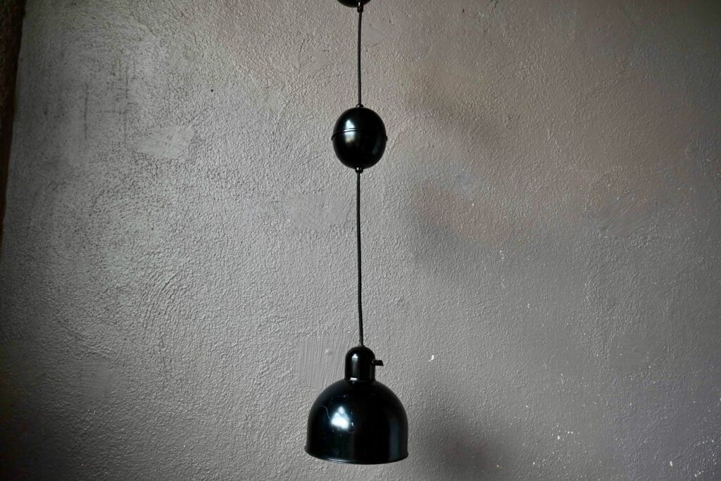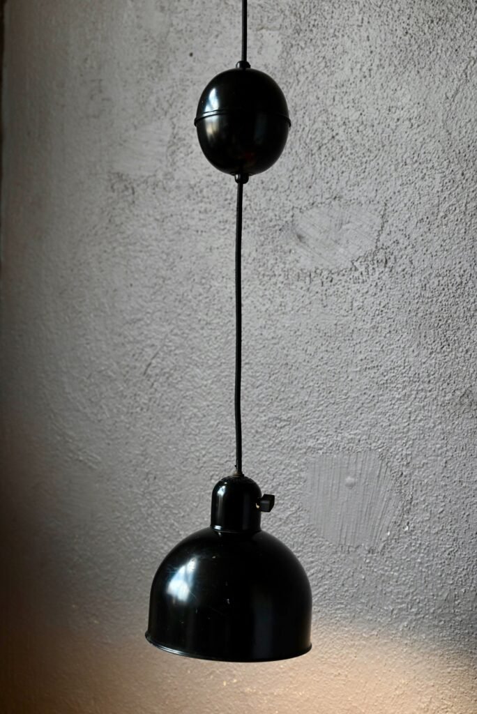 La suspensión Kaiser Idell es antigua, se trata de una rara producción de los años treinta. El sistema de ajuste de altura ya no está operativo. La cubierta del cable del techo también es original. La electrificación se ha rehecho. Se aprecian algunas huellas de uso en la pintura negra. Disponemos de varias lámparas de este modelo.